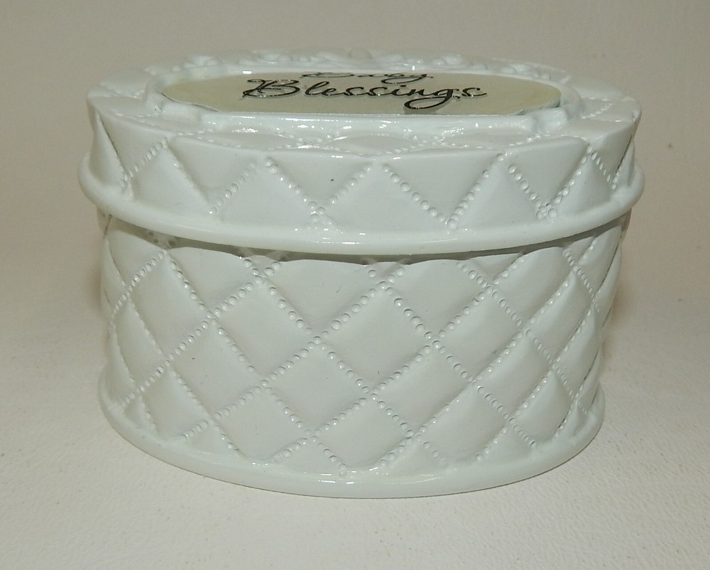 3" long. 2" wide. 2" deep. Adorable little "Baby Blessings" box. Mint in box. 19/3 ev24