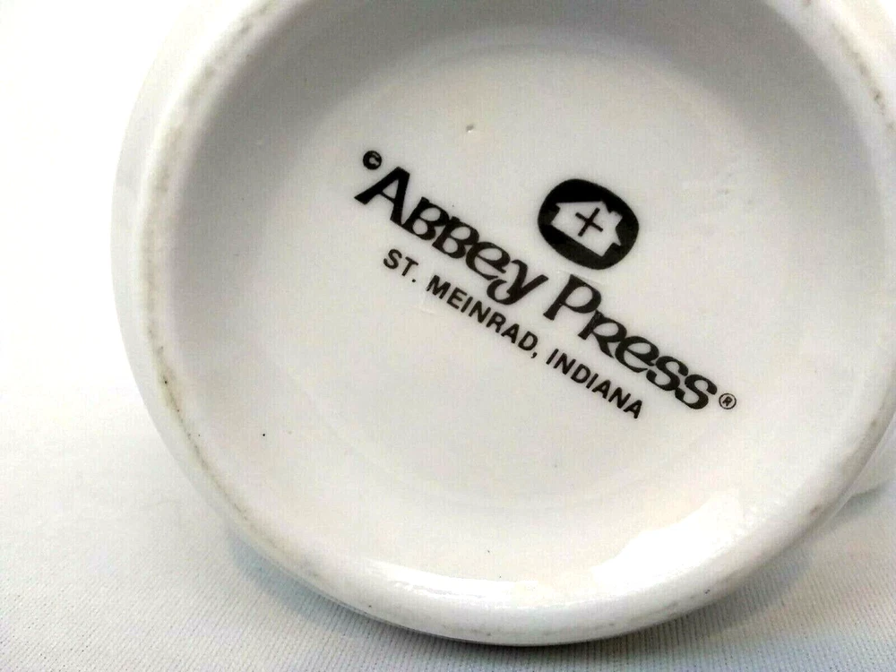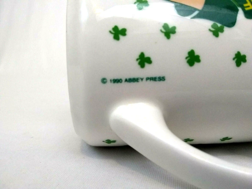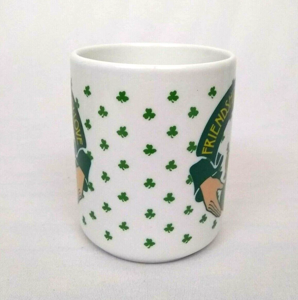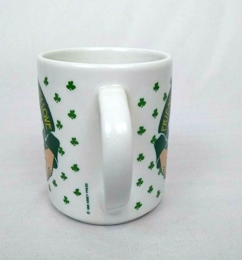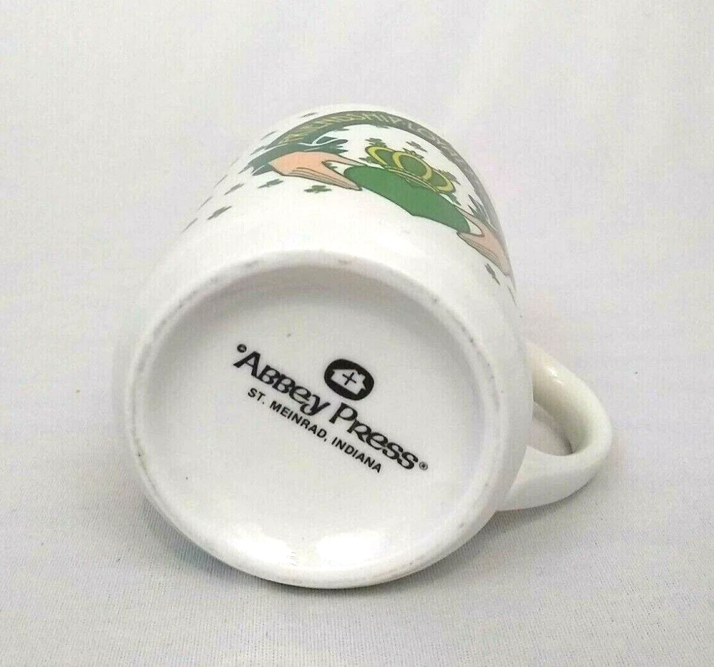 Abbey Press Mug Irish Shamrock Clover Friendship Loyalty Love with Claddagh Heart in Hands. This vintage 1990 mug is in great condition with no chips, cracks, or crazing. It measures 3.75" tall and 3" across rim.