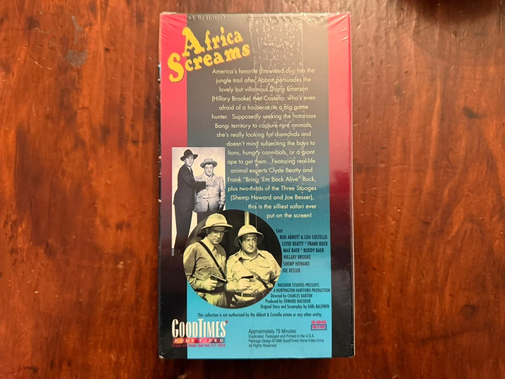 The product is a vintage VHS cassette tape featuring the classic comedy duo Abbott & Costello in the movie "Africa Screams." The tape is in English language and was manufactured in the United States. As it falls under the sub-genre of Classical comedy, this release promises timeless humor and entertainment from the beloved actors. The VHS tape is sealed and new, making it a collector's item for fans of Abbott & Costello looking to enjoy their comedic performances in the comfort of their homes.