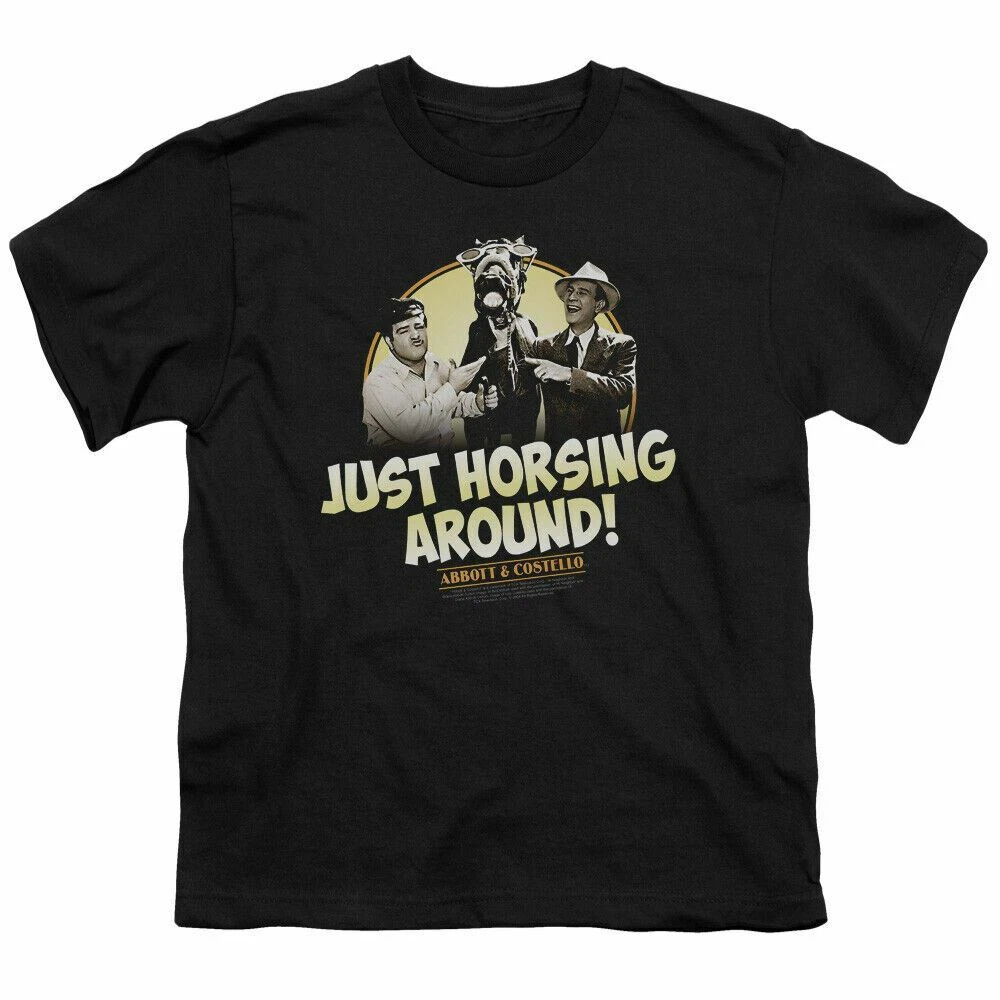 Abbott & Costello Horsing Around Kids Youth T Shirt Licensed Comedy Tee Black Abbott & Costello Horsing Around Kids Youth T Shirt Licensed Comedy Tee Black The Abbott & Costello Horsing Around Kids Youth T Shirt Item Description : The Abbott & Costello Horsing Around Kids Youth t-shirt is made from 100% pre-shrunk medium weight cotton. Kids Youth t-shirt is made from 100% pre-shrunk medium weight cotton. Every item we sell is original and fully licensed. If a shirt is designated as "distressed", the design contains intentional skips and voids which give the shirt a worn-in or vintage look. These are part of the actual design and do not reflect poor printing. The images shown are provided by the manufacturer and in some cases the actual design, when printed on the fabric of a shirt, may not appear as bright or vibrant. This is especially true when the design is printed on darker colors. Condition : Shirt is brand new! Sizing : Standard for the US market and typical of shirts sold in retail stores. The chart below provides a measurement guideline. Please see image for size chart. Doubling the width measurement will give you the chest size. Shipping : Most if the items we sell are in stock and are shipped within one business day, but some may require an additional 1-5 days of processing time. The delivery estimates for all of our items are provided in the description. Please check the delivery estimate for the item before placing your order . This will ensure that you receive the item when you need it and will prevent disappointment. We will send a confirmation email as soon as your order is shipped and this will include a US Postal Service (USPS) tracking number. Most other countries do not scan US tracking barcodes so no tracking information may be available on the package once it leaves the US. This is not unusual and is no cause for concern. Shipping costs are specified in the listing. We ship by USPS First Class and or Priority Mail domestically and by USPS First Class International Mail to all other countries. We always offer discounts for multiple items going to the same address. Just place the order and, before you pay, request a combined invoice. Returns : We offer a 60-day money back return policy on all of our items. If you are not happy with your new shirt for any reason just let us know and we will make arrangements for you to exchange or return it. Our goal is always 100% customer satisfaction!