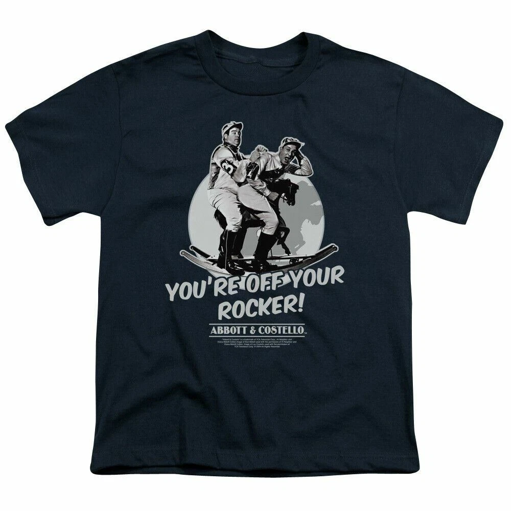 Abbott & Costello Off Your Rocker Kids Youth T Shirt Licensed Comedy Tee Navy Abbott & Costello Off Your Rocker Kids Youth T Shirt Licensed Comedy Tee Navy The Abbott & Costello Off Your Rocker Kids Youth T Shirt Item Description : The Abbott & Costello Off Your Rocker Kids Youth t-shirt is made from 100% pre-shrunk medium weight cotton. Kids Youth t-shirt is made from 100% pre-shrunk medium weight cotton. Every item we sell is original and fully licensed. If a shirt is designated as "distressed", the design contains intentional skips and voids which give the shirt a worn-in or vintage look. These are part of the actual design and do not reflect poor printing. The images shown are provided by the manufacturer and in some cases the actual design, when printed on the fabric of a shirt, may not appear as bright or vibrant. This is especially true when the design is printed on darker colors. Condition : Shirt is brand new! Sizing : Standard for the US market and typical of shirts sold in retail stores. The chart below provides a measurement guideline. Please see image for size chart. Doubling the width measurement will give you the chest size. Shipping : Most if the items we sell are in stock and are shipped within one business day, but some may require an additional 1-5 days of processing time. The delivery estimates for all of our items are provided in the description. Please check the delivery estimate for the item before placing your order . This will ensure that you receive the item when you need it and will prevent disappointment. We will send a confirmation email as soon as your order is shipped and this will include a US Postal Service (USPS) tracking number. Most other countries do not scan US tracking barcodes so no tracking information may be available on the package once it leaves the US. This is not unusual and is no cause for concern. Shipping costs are specified in the listing. We ship by USPS First Class and or Priority Mail domestically and by USPS First Class International Mail to all other countries. We always offer discounts for multiple items going to the same address. Just place the order and, before you pay, request a combined invoice. Returns : We offer a 60-day money back return policy on all of our items. If you are not happy with your new shirt for any reason just let us know and we will make arrangements for you to exchange or return it. Our goal is always 100% customer satisfaction! Shipping We ship fast usually within 24 hours of purchase Monday through Friday.