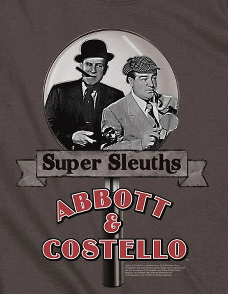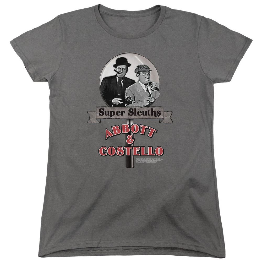 ABBOTT & COSTELLO Name: " Super Sleuths " Garment Style: Girl's Junior Babydoll Tee Women's T-Shirt Color: Charcoal Images On: Front Only Size Type: Women's Adult or Girl's Junior All garments are pre-shrunk, color fast and machine washable See pictures for sizing charts