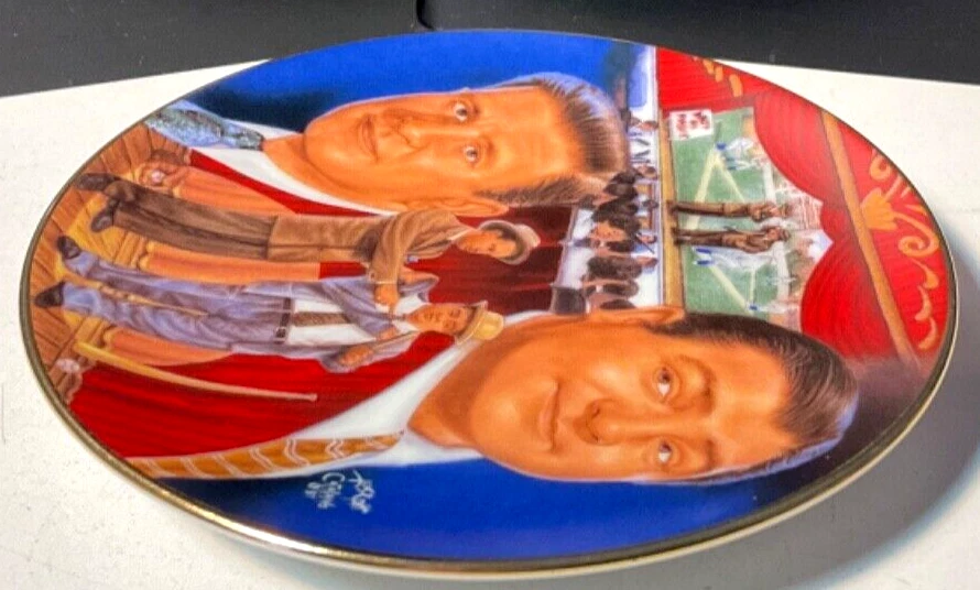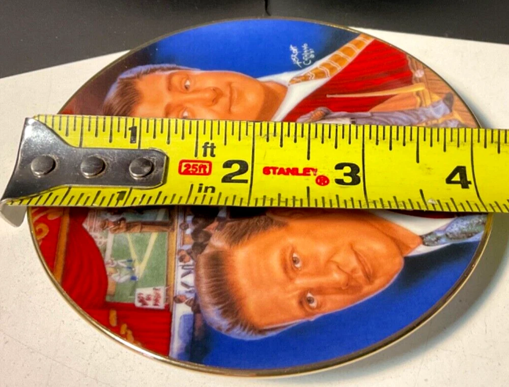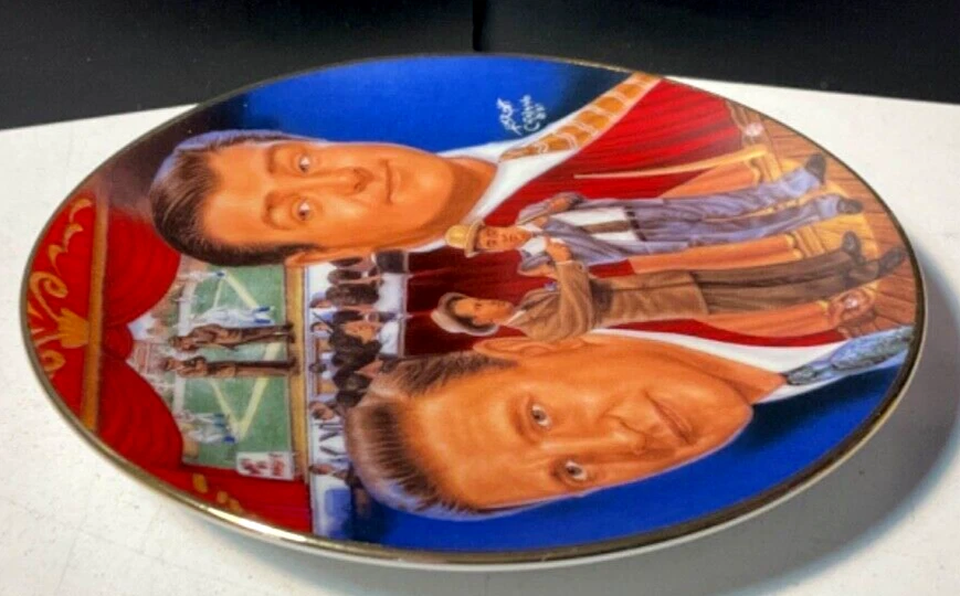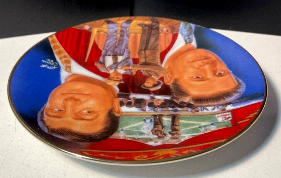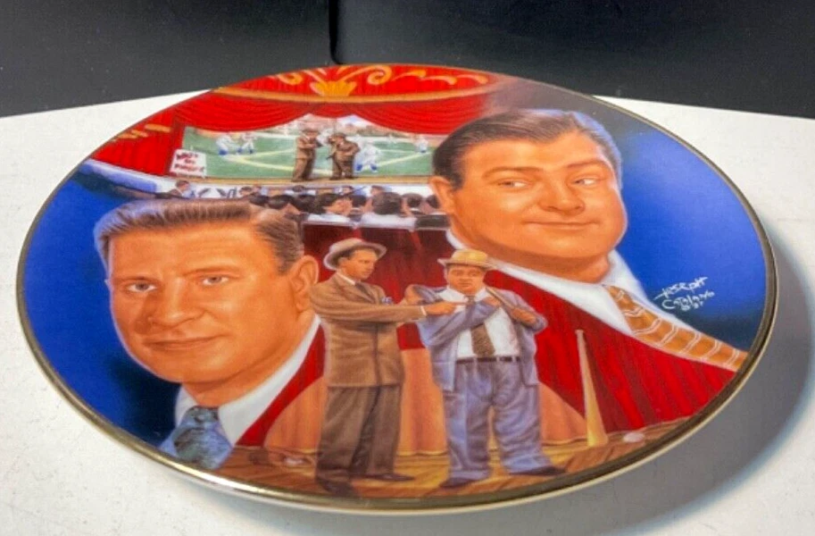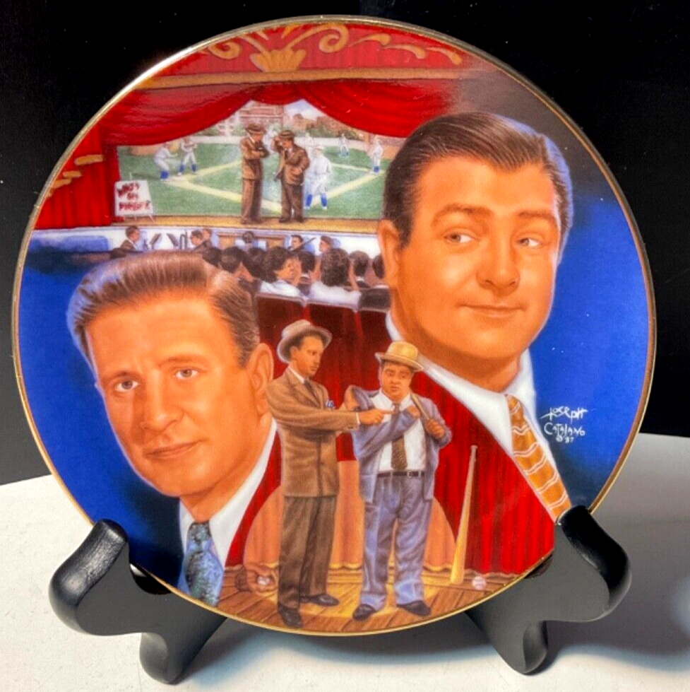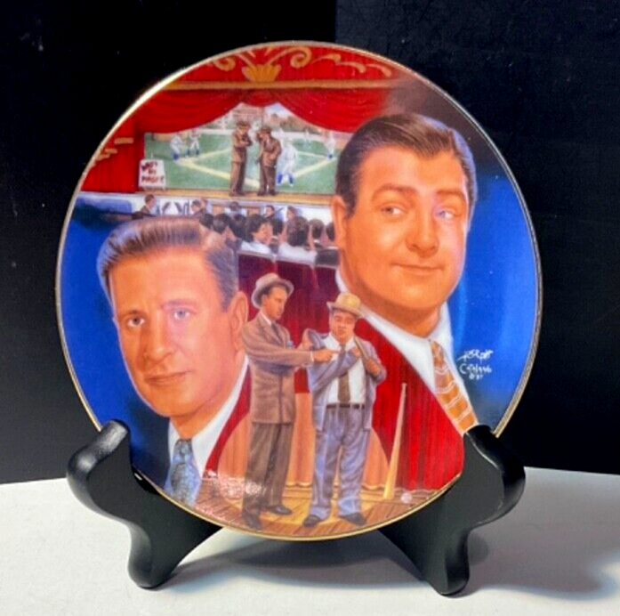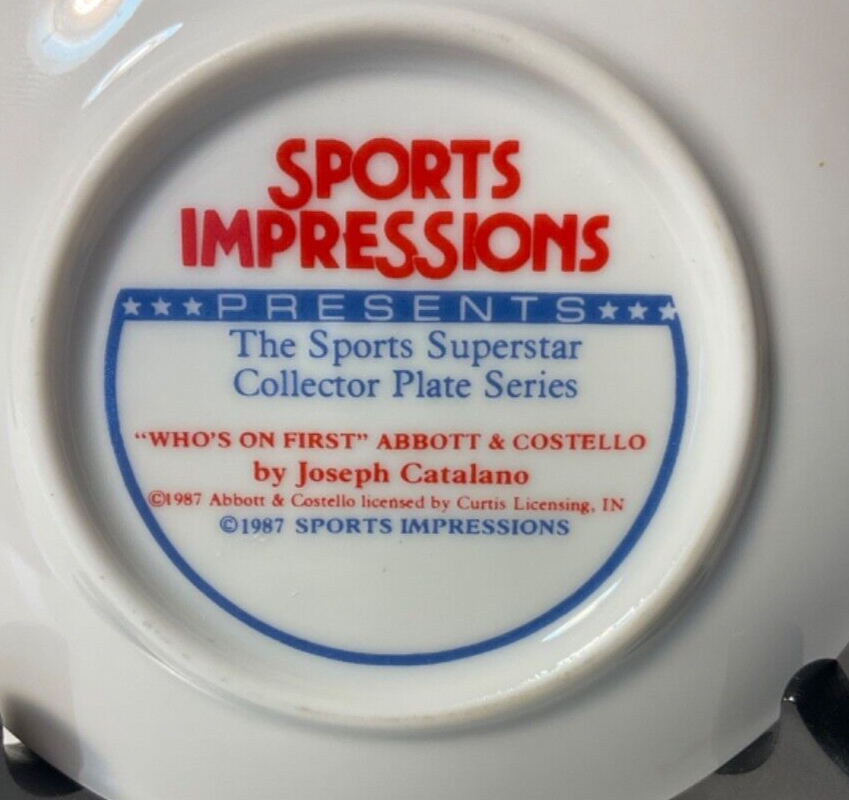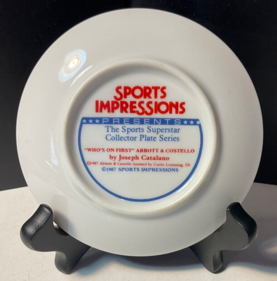 Sports Impressions Who's on First Abbott & Costello Collector Plate No Box Features a small plate collector plate series, Who's on First with the comedy duo, Abbott and Costello. The plate is in great condition considering it's age and appears barely display used. Lots of color and image details. There are no chips, breaks or cracks. May have normal wear and tear due to age and storage. Zoom into review overall condition and sold as seen in photos. Ask questions or additional photos prior to purchase please. The black plate holder is not incuded and used for staging photos only. An awesome collectible for those Abbott & Costello fans and who can forget their patter routine, "Who's on First" ***Like any used/new product, there may be wear & tear due to use, age, storage and cleaning/washing. Items will vary according to condition. Please see all photos for details, description and condition. Sold as is and as seen in photos. Zoom in and judge for yourself. I prefer to share as much information as possible regardless. I am not an expert collector but appreciate sharing these treasured finds and thank you for visiting my store, Playful Pastime. Happy to answer any questions prior to purchase please.