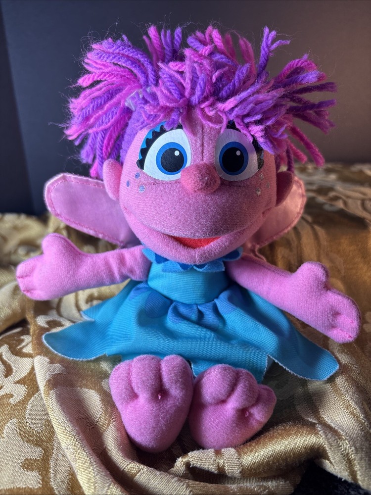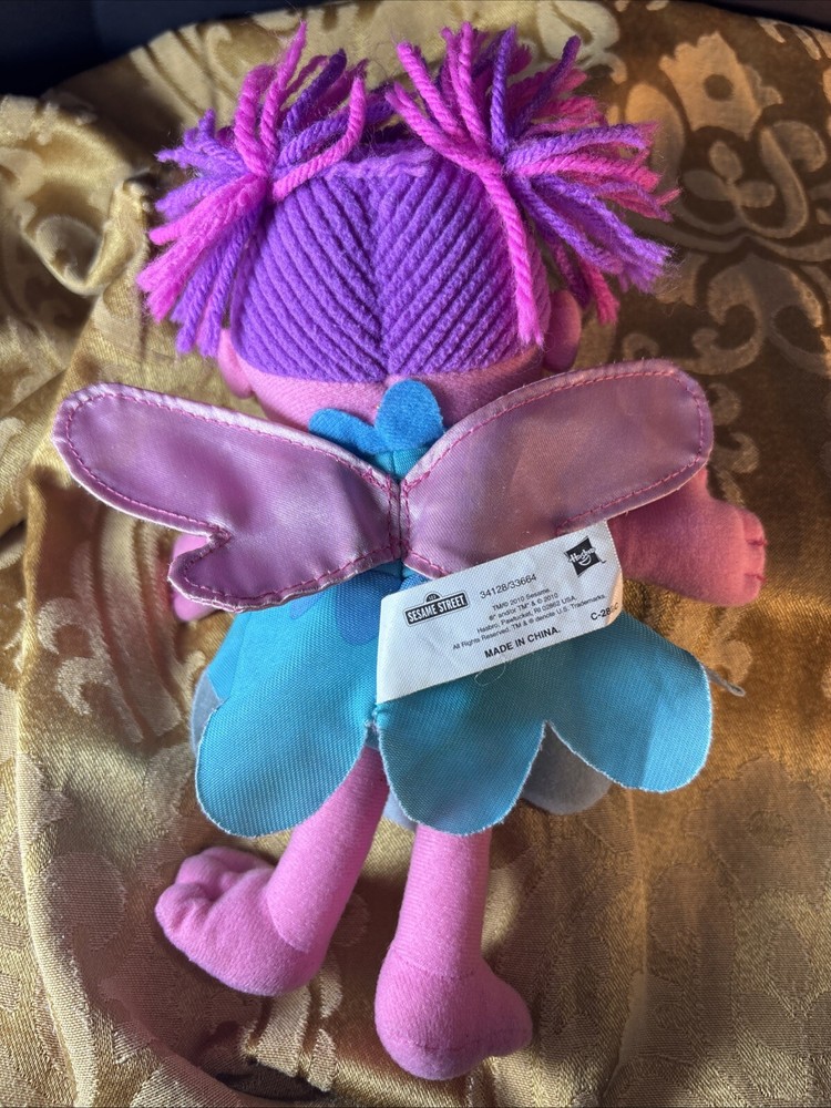 A 9" Abby Cadabby Sesame Street plush doll, manufactured by Hasbro in 2010. This stuffed animal is a fairy girl doll representing a character from Sesame Street. It features colorful detailing and is made in China. With a recommended age range of 3+, this small plush toy is a charming addition for any occasion.