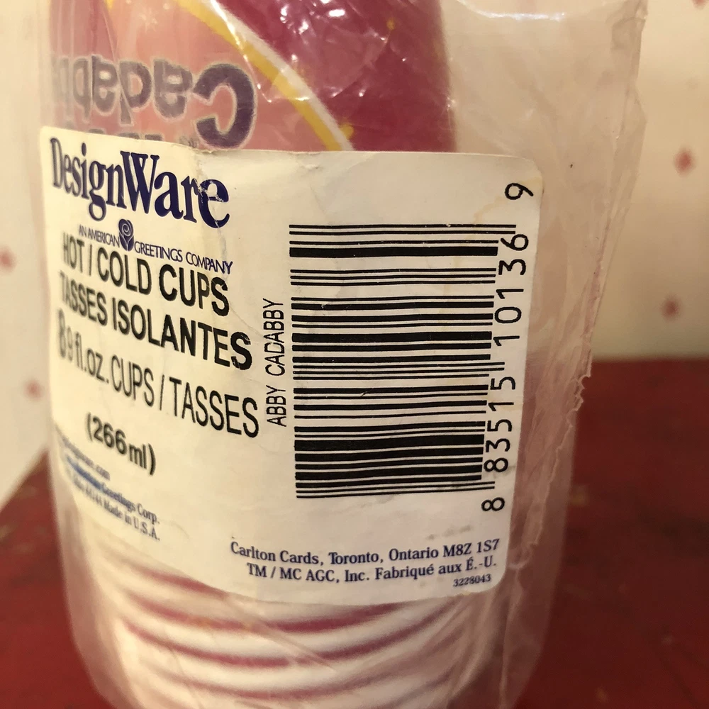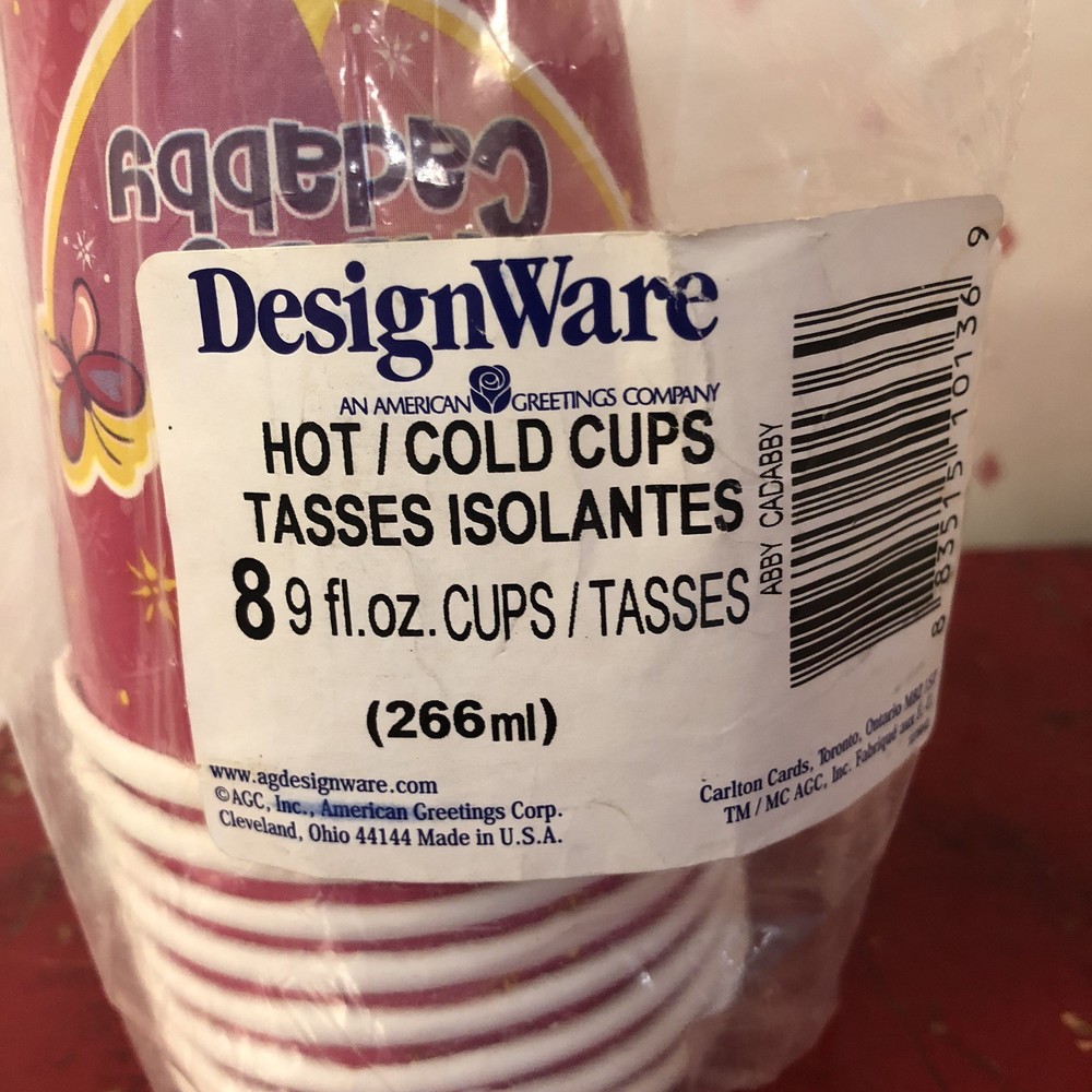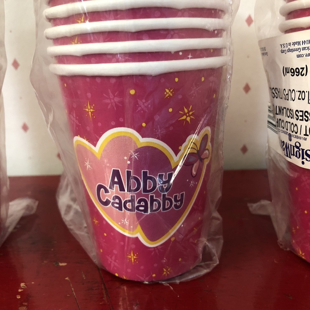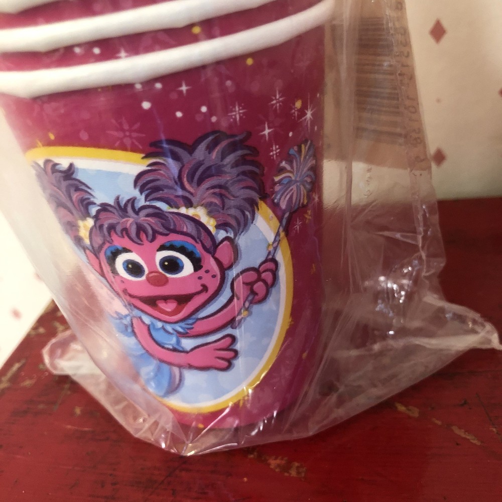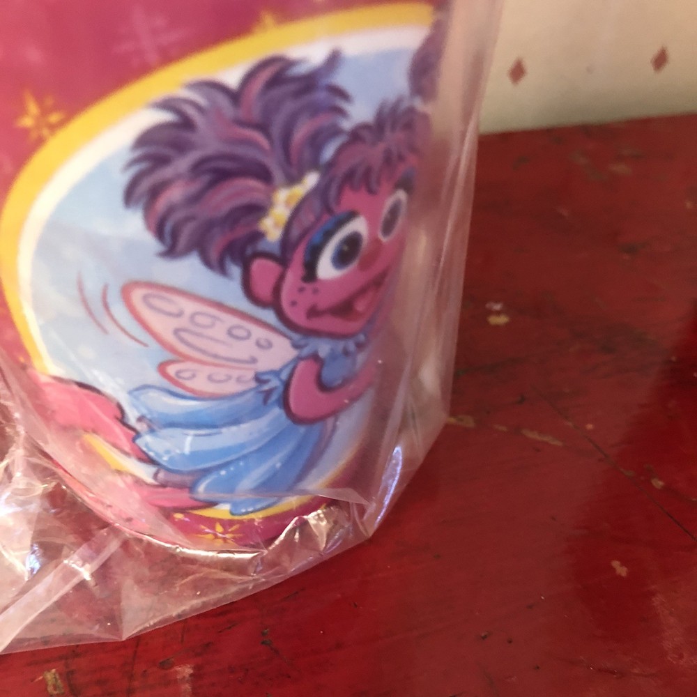 These Sesame Street character Abby Cadabby party hot/cold cups, made by DesignWare (An American Greetings Company), are new in package. However, they do have small holes in the plastic wrapping. Please see pics as I have tried to capture them all. There is also a pic taken on the bottom of the stack of cups, with a magnifying glass, that shows: TM 2007 Sesame Workshop. Abby Cadabby, a 4-year-old Muppet fairy-in-training is featured on the cup flying equipped with fairy wings and wand. On the other side of the cup are 2 hearts with her printed name and a butterfly. The background of the cup is pink with yellow twinkling stars. Each of the 3 sets has 8 cups - 9 fl. oz. for a total of 24 cups. These are made in the USA. Thank you for your interest.