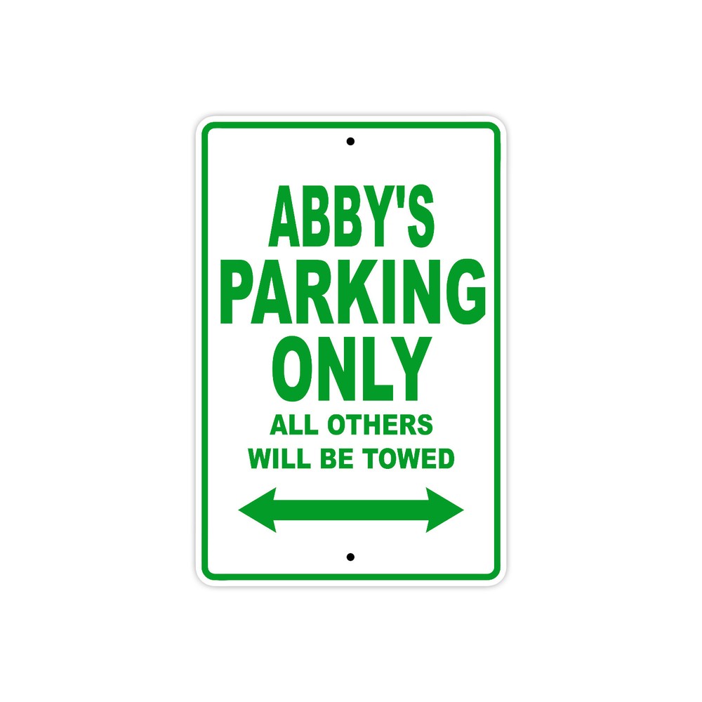 Abby's Parking Only All Others Will Be Towed Name Novelty Metal Aluminum Sign Product Information: • High quality detailed professionally printed directly on the Aluminum Metal . This is NOT vinyl lettering. • Size: 8"x12", 12”x18” and 18”x24” Rectangle Shape Sign • Made in the USA , at our own production facility owned and operated Dallas, TX Since 2010 • High Glass Aluminum with UV Protective Coating that resists Fading. Suitable for Outdoor and Indoor • Rounded Corners • Two Drilled Holes for Easy Mounting • Easy to Install, can be used on most platforms. • No Screws or stake included Salient Features: · Our premium quality aluminum signs can be used to make a statement for a low cost. · Each of our aluminum signs are professionally printed using vibrant colors. · Choose from our business, nostalgic, retro, vintage and funny signs. · This aluminum sign is perfect for outdoor use for many years or can be used indoors as well. · This aluminum sign provides a great novelty gift for any occasion, and an economical form of advertising that can be displayed almost anywhere. · The best prices online from a company you can trust! · We print thousands of signs a month! We know Signs! Operating Hours: · Weekdays ( Mondays- Fridays ) from 10:00AM CDT – 05:00PM CDT ( CENTRAL TIME, DALLAS!) · WEEKENDS ( Saturdays and Sundays ) AND HOLIDAYS EXCLUDED !! Shipping & Payments: · We ship in the USA only. Usually ships within 24 hours ( 1 BUSINESS DAY, WEEKENDS AND HOLIDAYS EXCLUDED! ) · Payments: Due immediately. Payment accepted ONLY from a confirmed and verified PayPal Account. · We ship most orders received before 03:00PM same business day.