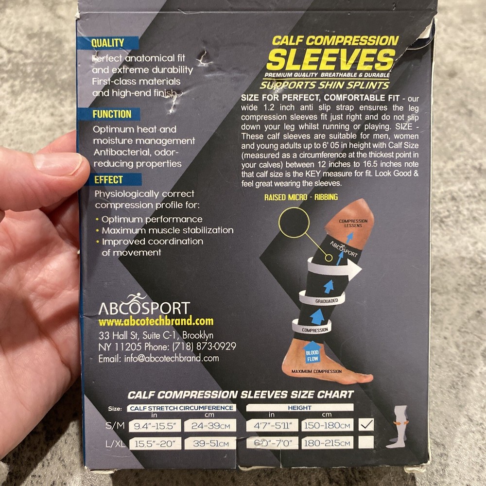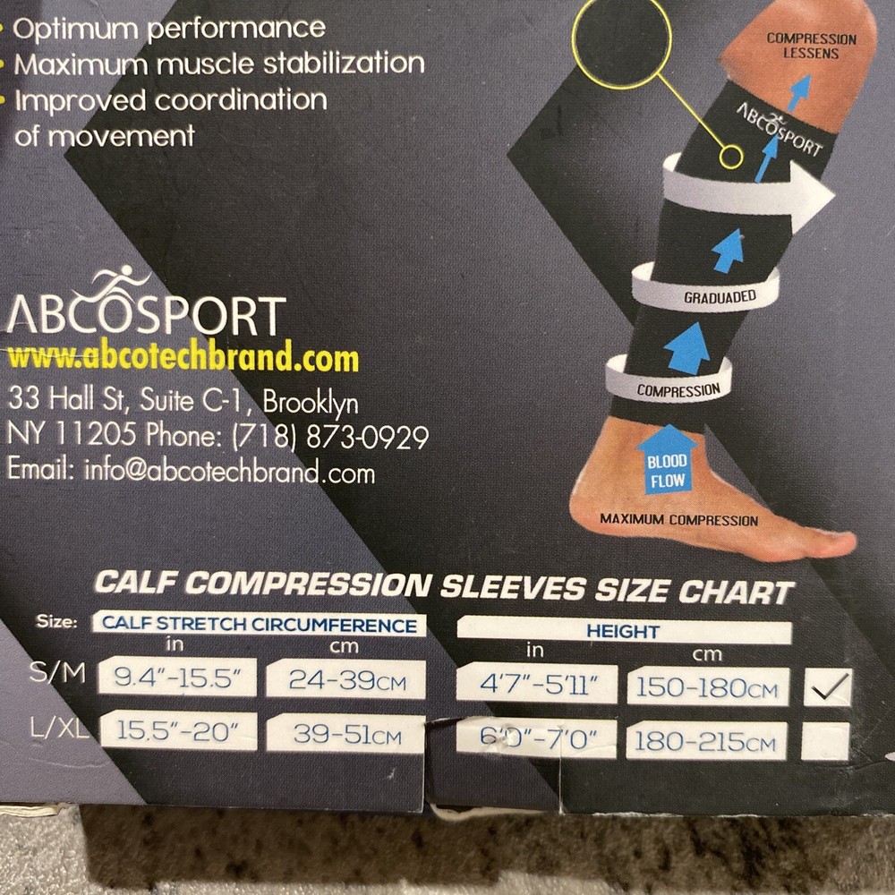 Abco Sport calf compression sleeves size S/M. These are new. All sales are final as I do not offer returns.