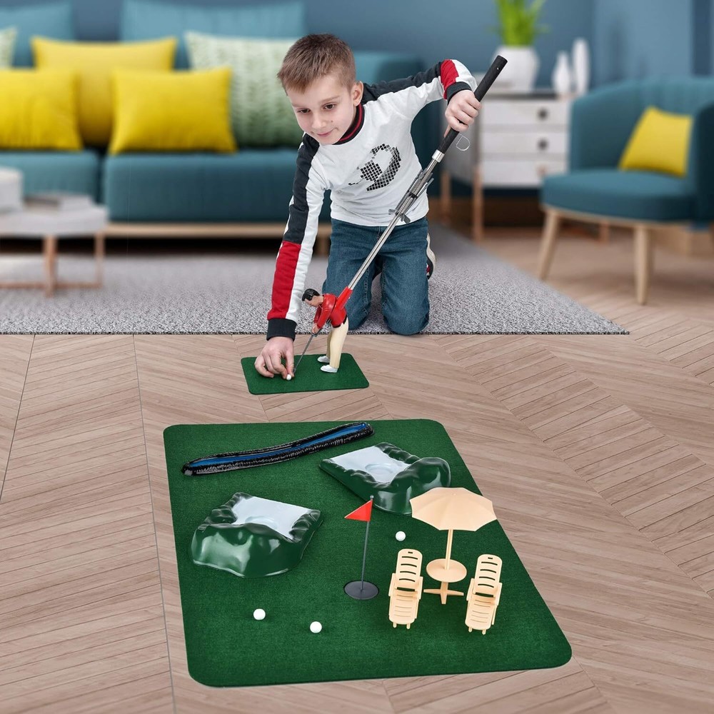 MINI GOLF KIT INDOOR GAME – Experience the pleasure of playing a whole course of golf in the comfort of your home with Abco's mini golf set. With an innovative and quirky design, our mini-golf kit (indoor game) with a little golfer is a great way to introduce this luxurious sport to the kids! BEST MINI GOLF COURSE – Featuring a swing control lever for precise swings, this mini- golfing man indoor golf game comes with 5 different clubs that can be swapped out for different distance hits. Mini golf kit for adults and kids is a must-have for all! PORTABLE INDOOR MINI GOLF – Turn any room into a golf course with our indoor mini-golf game! The lightweight and compact mini golf indoor game can also be easily carried around for a quick game whenever your heart desires! GREAT BONDING ACTIVITY – Bond with your children over a nice game with our mini-golf kit (indoor)! Our mini golf course for backyard kit makes a great gift to all loved ones for all festive and non-festive occasions like Birthdays, Anniversaries, Christmas, and more! COMPLETE MINI GOLF COURSE – This mini golf at home includes 1 Golf Course Cloth, 1 Shot Maker Club, 1 Moveable Putting Club, 6 Sets of Clubs, 1 Water Hazard, 2 Sand Tracks, 12 Small Balls, 2 Big Balls, 1 Umbrella Table, 2 Chairs, 1 Pin, I Cup, And 1 Flag.