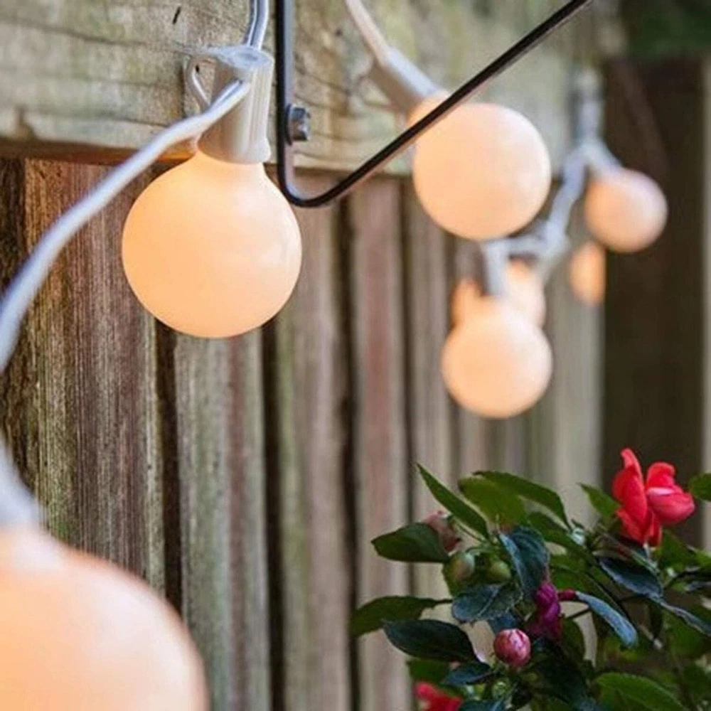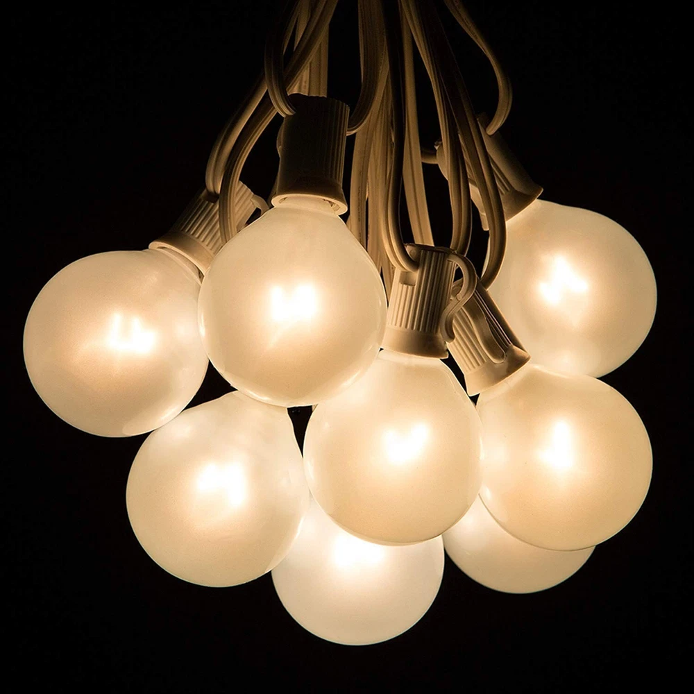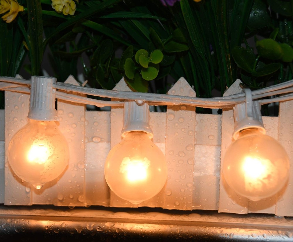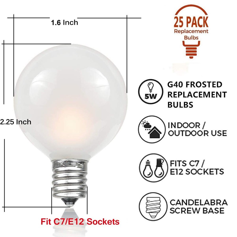 Abeja Outdoor Frosted String Lights G40-25Ft with 27 Clear Bulbs, UL Listed for Patio Garden Umbrella Bars Balcony Party Decor Indoor, E12 Base, 5W, White Product Details Color: 25FT-Frosted White Size: 25FT Brand: Abeja EAN: 6009075450639 MPN: Does not apply UPC: Does not apply Color: 25FT-Frosted White Brand: Abeja Indoor/Outdoor Usage: Outdoor, Indoor Special Feature: 120v, 5w, C7/E12 socket type, UL listed for indoor/outdoor use Light Source Type: Incandescent Power Source: Corded Electric Light Color: White Theme: Holidays Occasion: Wedding, Christmas, Birthday Style: Antique Color: 25FT-Frosted White Brand: Abeja Indoor/Outdoor Usage: Outdoor, Indoor Special Feature: 120v, 5w, C7/E12 socket type, UL listed for indoor/outdoor use Light Source Type: Incandescent Power Source: Corded Electric Light Color: White Theme: Holidays Occasion: Wedding, Christmas, Birthday Style: Antique Material: Glass,Plasitc Color Temperature: 2200 Kelvin Number of Light Sources: 25 Voltage: 120 Volts Bulb Shape Size: G40 Wattage: 5 watts Bulb Base: E12 Included Components: 1 x 25ft frosted string light white wire, 1 x 25 frosted bulbs, 1 x 2 replacement bulbs, 1 x manual installation, 1 x spare fuse which stored in the male plug Number of Items: 27 Item dimensions L x W x H: 8.5 x 8.5 x 3.7 inches Control Method: Remote Manufacturer: Boutique window Item Weight: 1.24 pounds Product Dimensions: 8.5 x 8.5 x 3.7 inches Size: 25FT Shape: G40 Item Package Quantity: 1 Special Features: 120v, 5w, C7/E12 socket type, UL listed for indoor/outdoor use Usage: Outdoor use only Batteries Included?: No Batteries Required?: No Date First Available: August 9, 2019 [Frosted White String Lights]: 25 feet long patio hanging lights come with 25 frosted white G40 Bulbs and 2 spare bulb. Light bulbs have E12 candelabra base, 5W per bulb. Perfect for home decor, creating a warm and romantic atmosphere that will make you feel relaxed and happy. [End To End Connectable]: Outdoor globe string lights soft warm total length 25 feet, 6" lead with male plug, 12" spacing between bulbs, 6" tail with female connector. G40 string lights can attach up to 3 strands to cover large areas. (max 432 watts) [Practical Design]: Each bulb base has a hook up on the side which makes, can be hung anywhere using cable ties or cup hooks as needed. And this outdoor string lights can connect 3 strands at most to cover a large area. [Widely Application]: These G40 patio lights are preassembly packaged, simply hang up the light string and plug in to enjoy. These Edison string lights are the perfect decoration for balcony terrace, garden, porches, pergola, gazebo, deck, tent, party, barbecue, city roof, umbrella, dinner, wedding, birthday, cafe and more.
