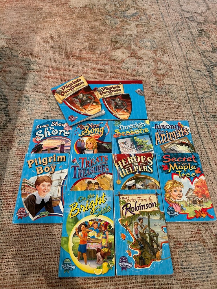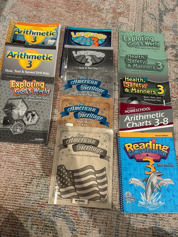 Sale is final. Current 2025 Abeka 3rd Grade Curriculum. Set includes Curriculum Lesson Plans, Test and Quiz keys, Teacher Keys, Readers, History and Science Textbooks, and Arithmetic Teaching Charts. I did highlight completed lesson plans and notes in the Curriculum books. The textbooks have some cover damage, but the pages are in good condition. Smoke and Pet free home. Set includes 32 books as pictured. The cost of buying each book through Abeka would be $779.