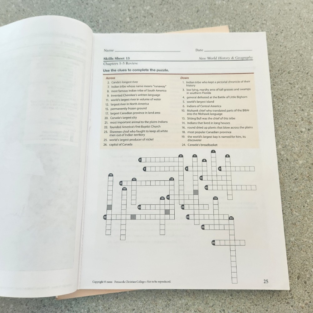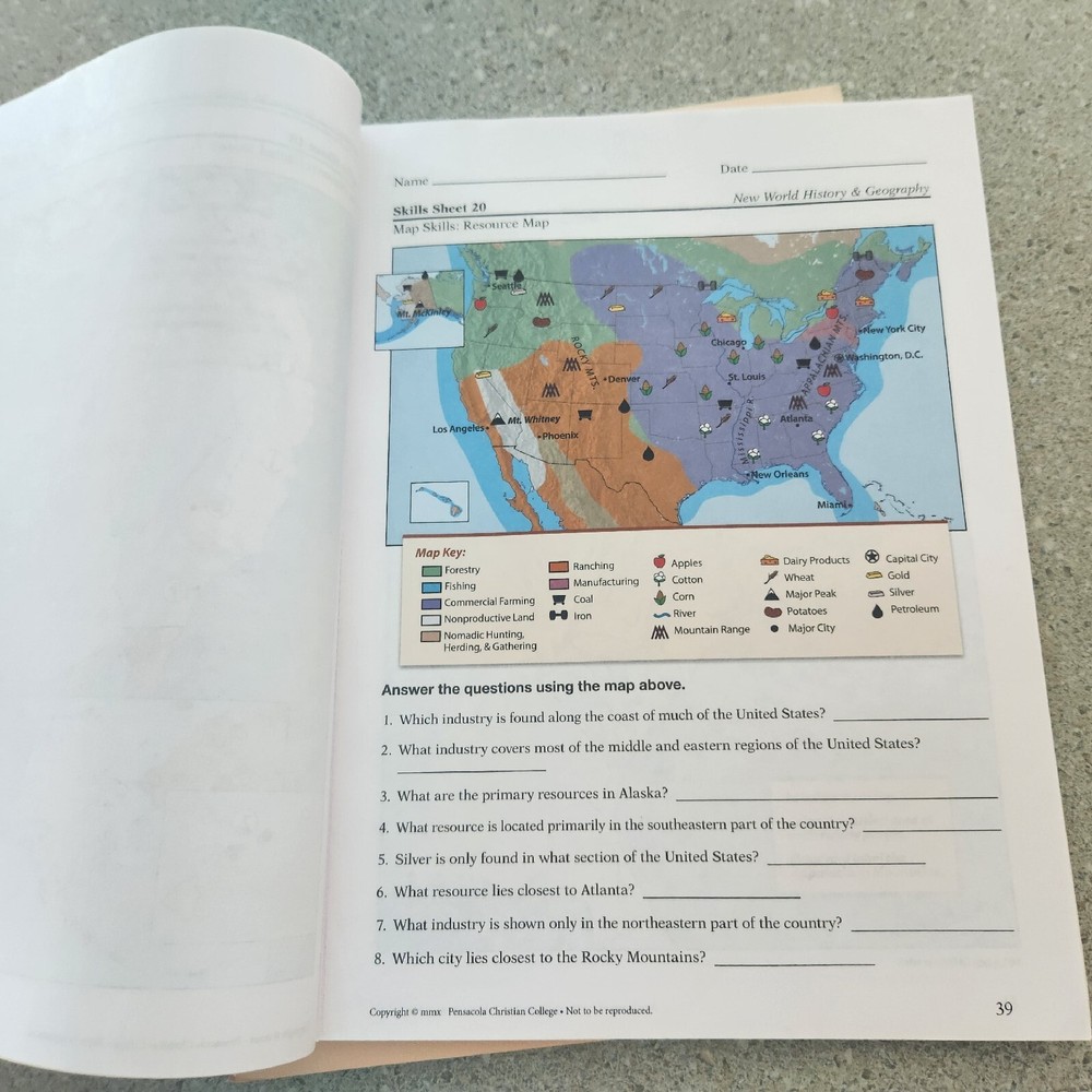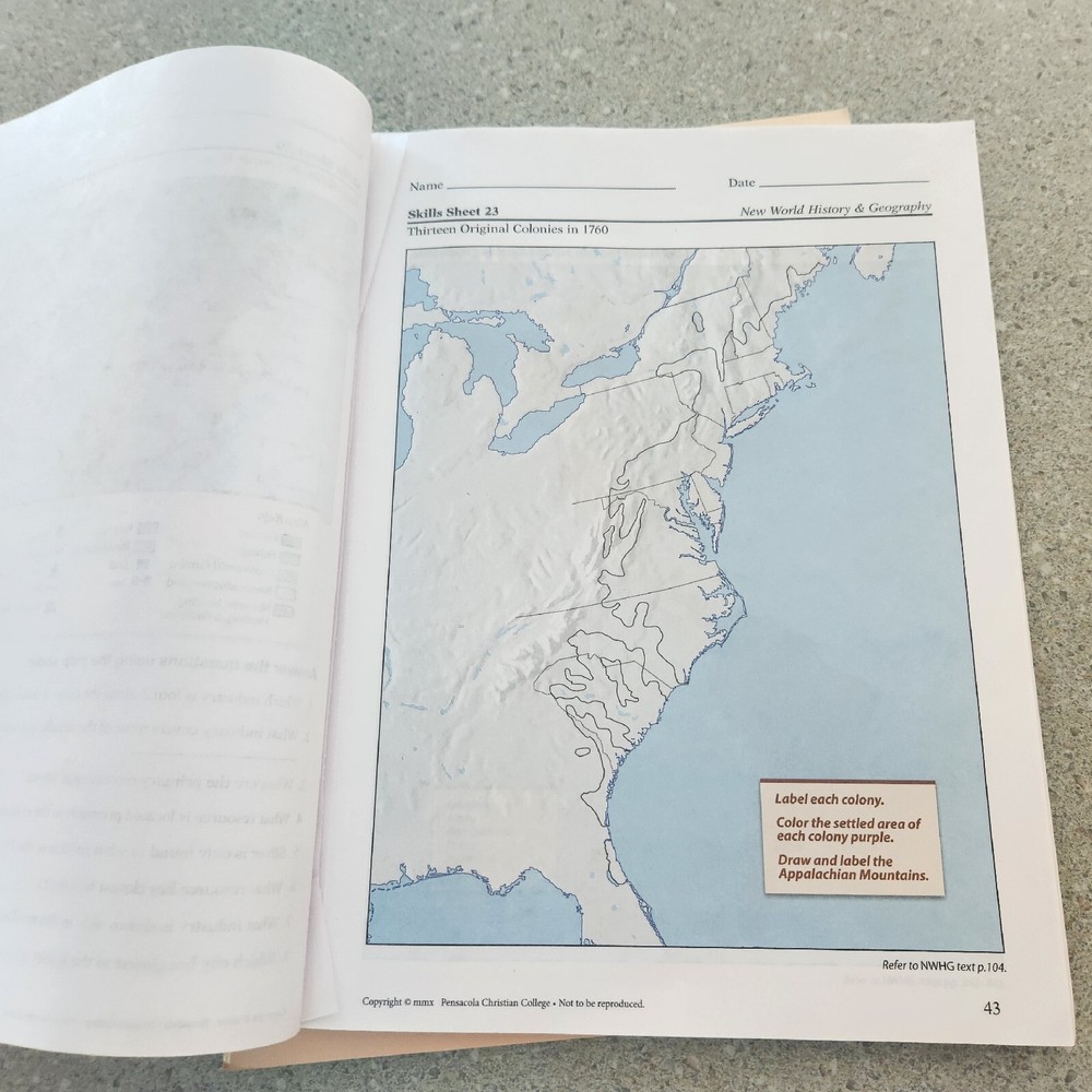 Abeka Grade 6 new world history and geography maps and activities. The students book is missing the first 8 pages and there is writing inside not every page maybe 6 pages. Also a few pages where ripped out in between. Not a lot but a few.