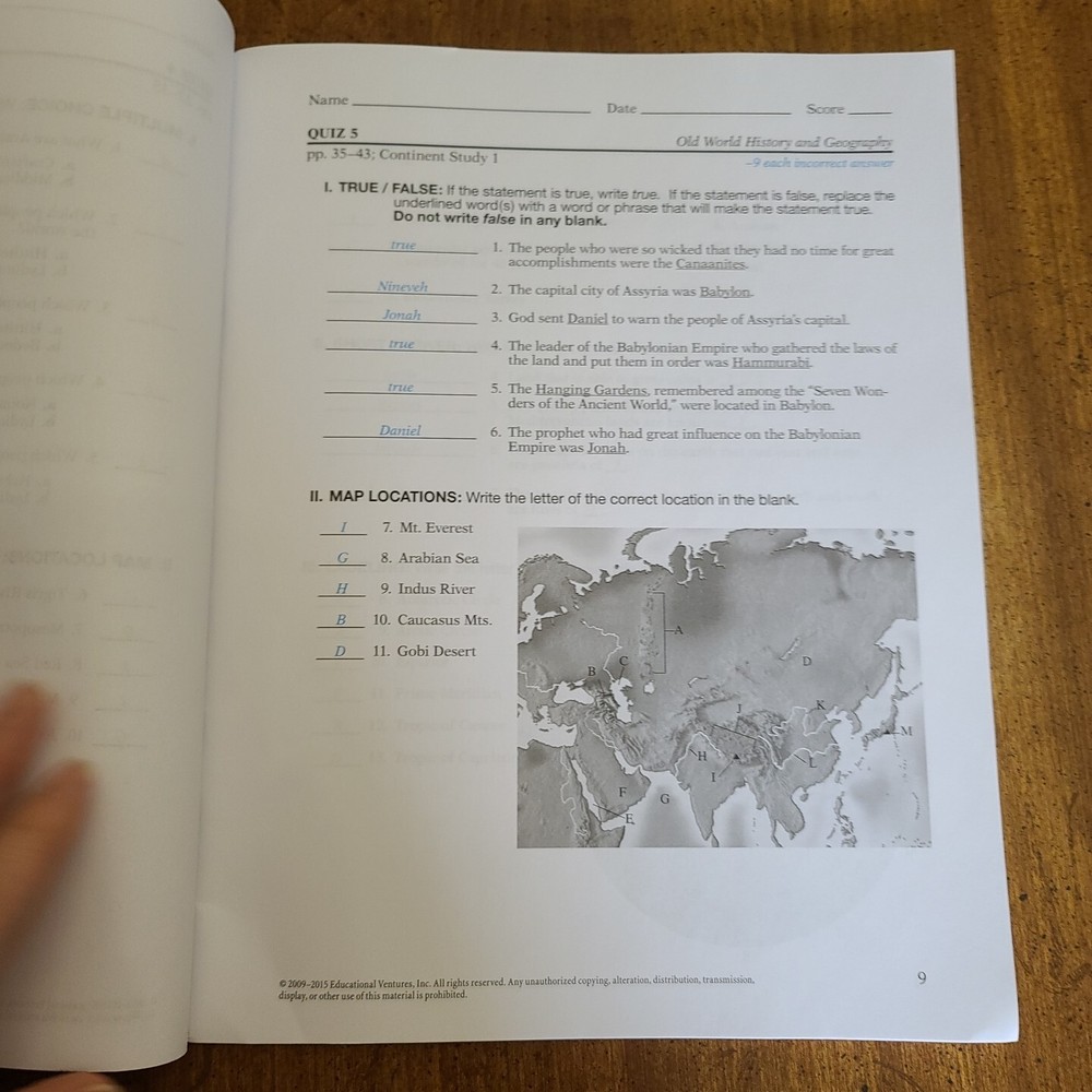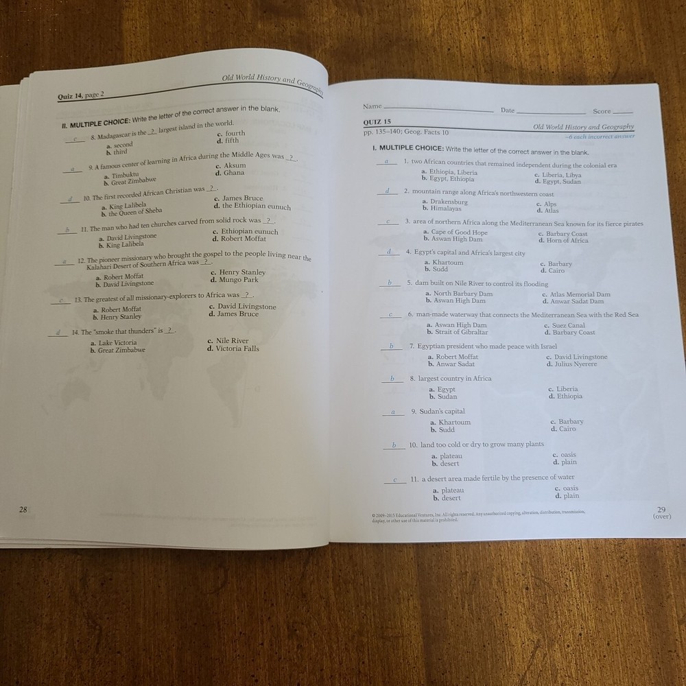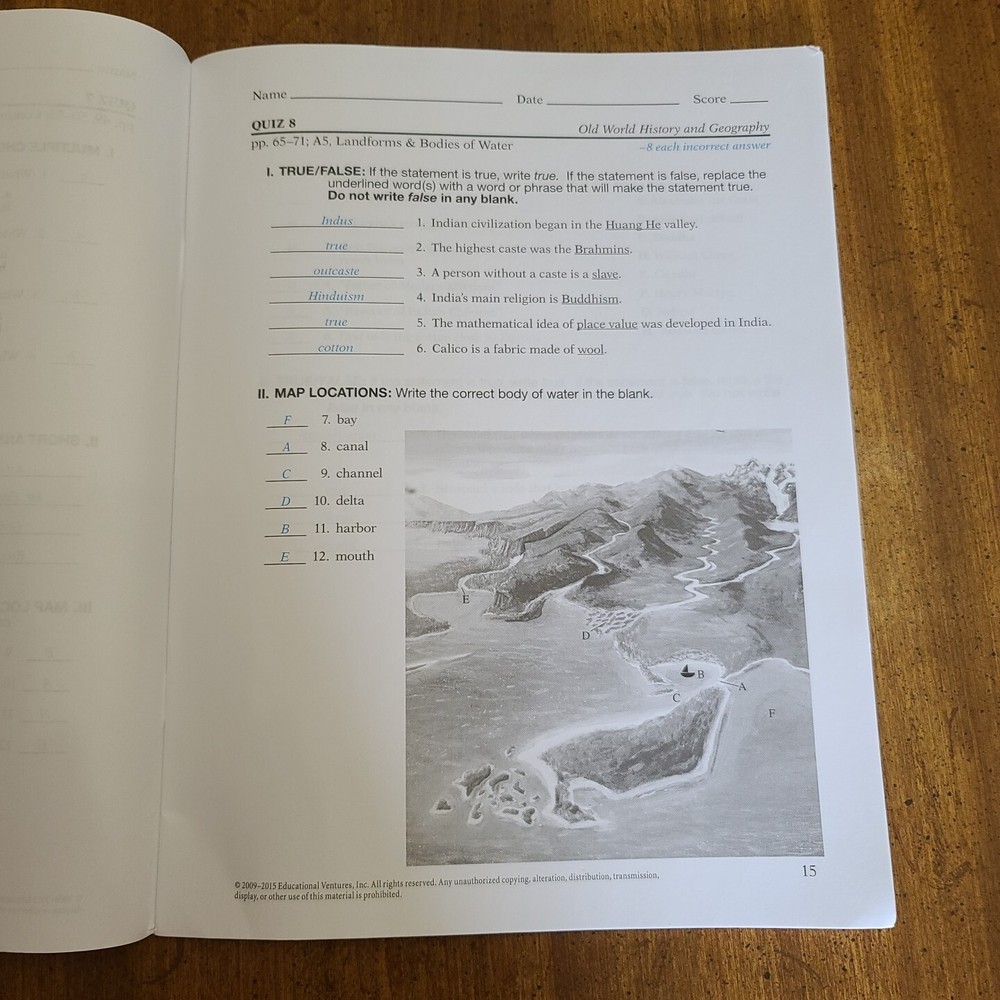 Abeka Old World History and Geography Teacher Quiz Key. The book has a whited out spot on inside cover where a name had been. However, it is in very good condition for class. Very Good Condition.