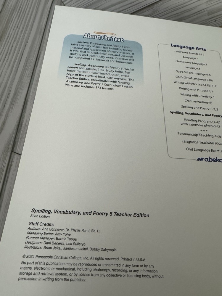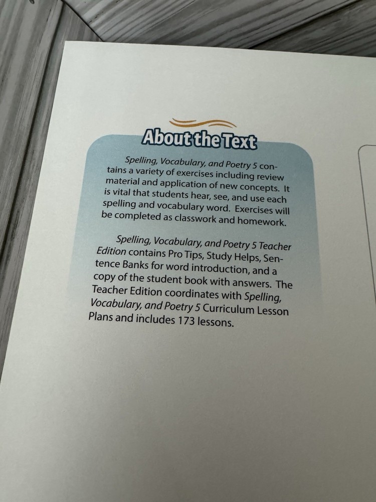 Abeka Spelling, Vocabulary, and Poetry 5 Teacher Edition, Sixth Edition (2024). Spiral bound format. Includes teacher helps, pro tips, study helps, sentence banks, and answer keys. Coordinates with Abeka Grade 5 language arts curriculum. Book is in very good condition with clean pages and tight spiral binding. No known writing or markings unless shown. Great for homeschool or classroom use. SKU B-2