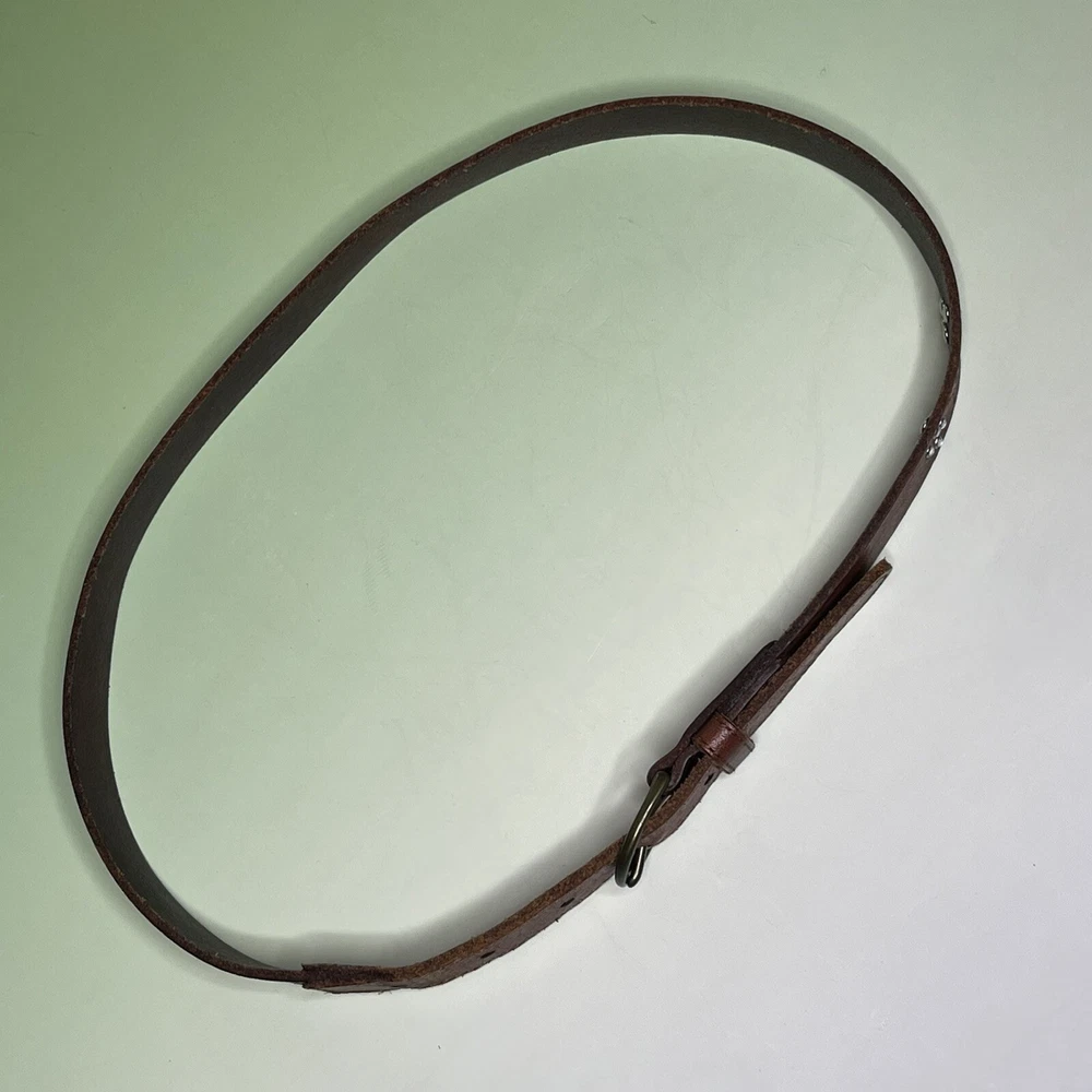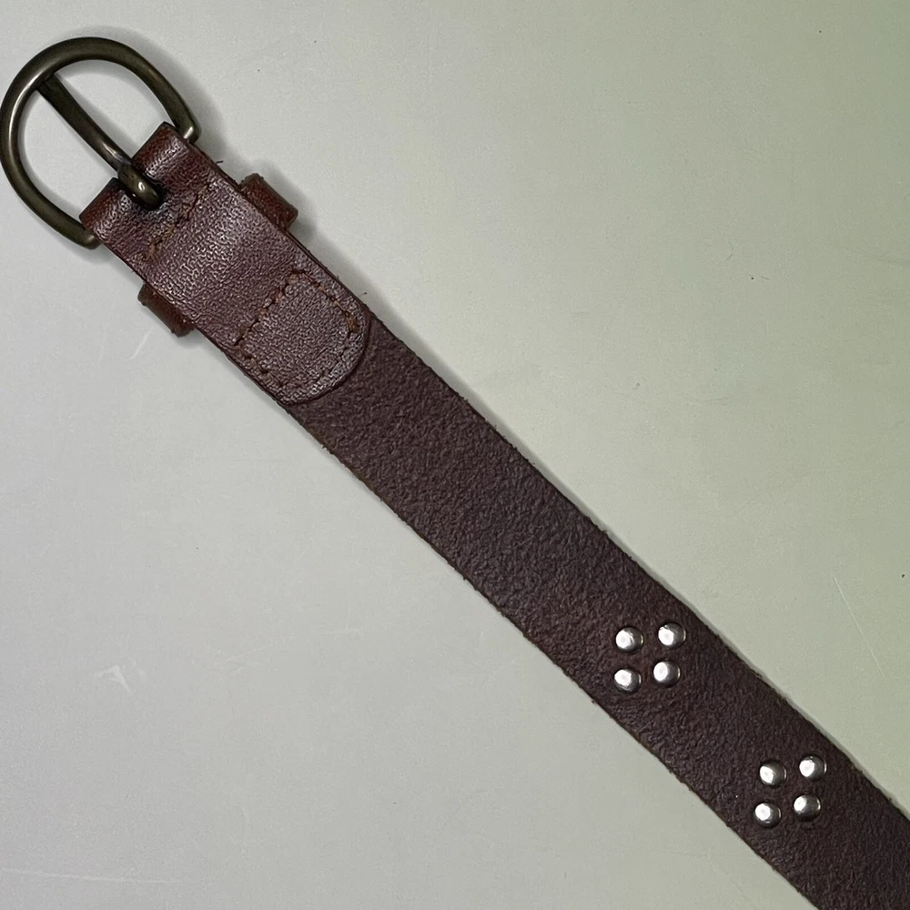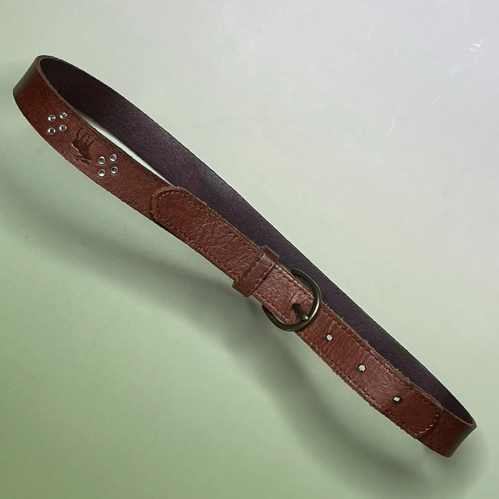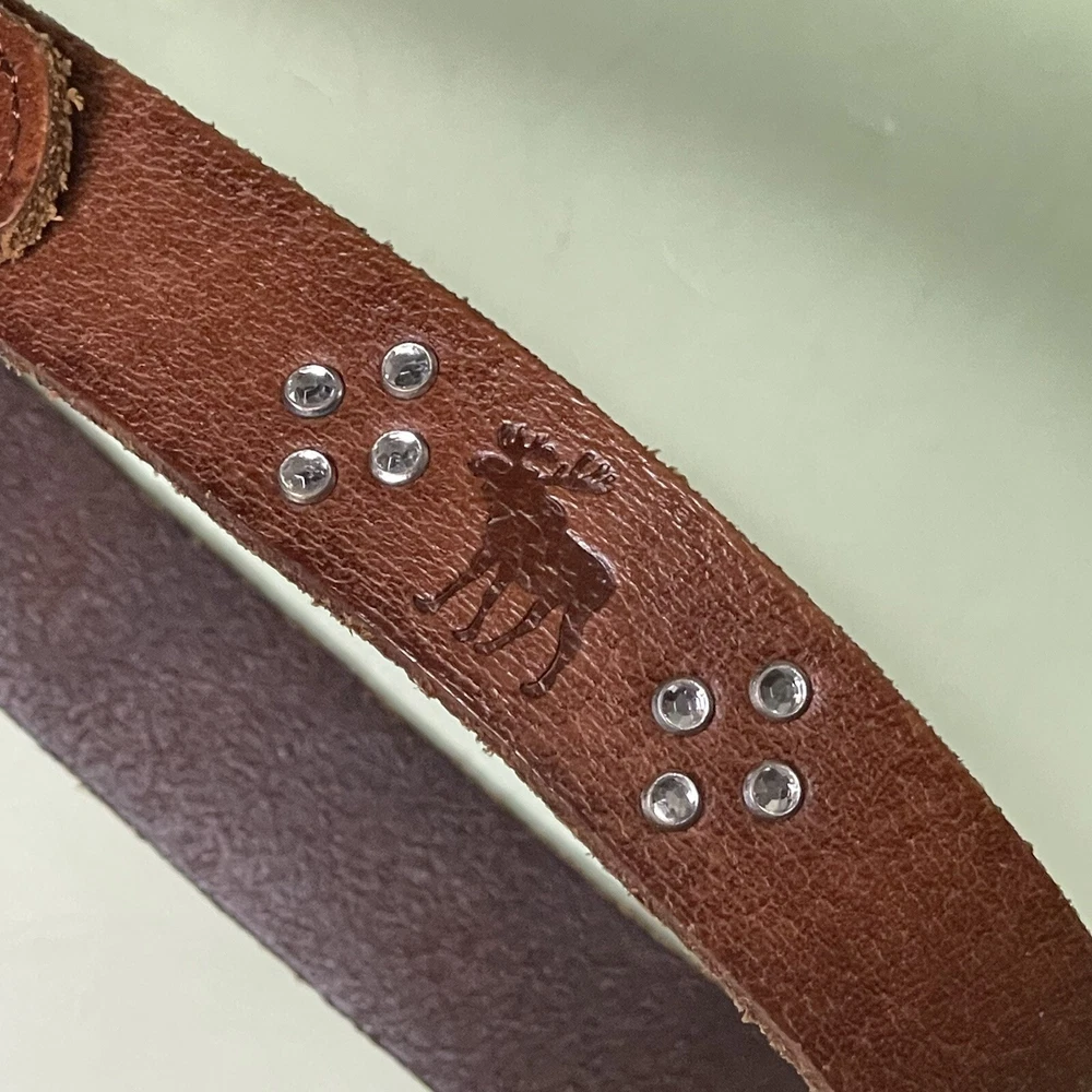 Elevate your wardrobe with this stunning Abercrombie & Fitch belt for women. Crafted from high-quality brown leather, this belt features a classic moose logo and studded accents, making it a perfect addition to any outfit. The buckle and adjustable features ensure a comfortable fit, while the silver hardware material adds a touch of elegance. This handmade belt is perfect for outdoor and casual occasions, and its solid pattern and XS size make it a versatile accessory for any wardrobe. Whether you're a fan of metal or logo themes, this studded belt is a must-have.