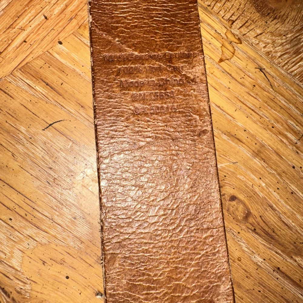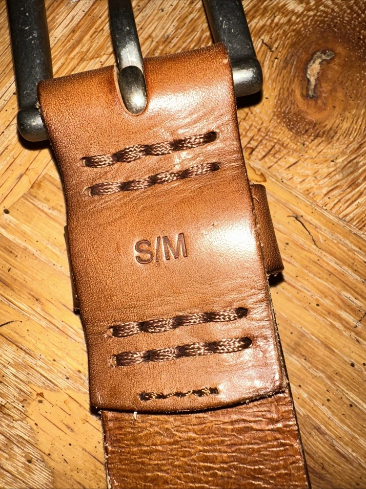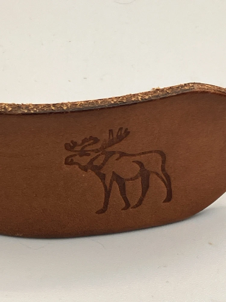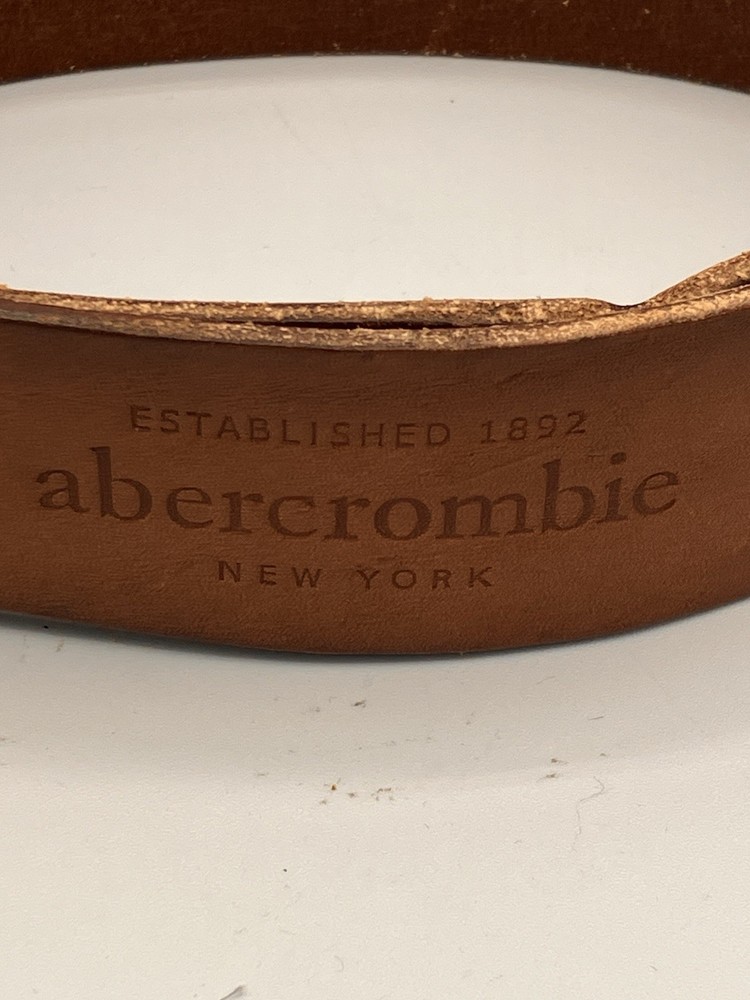 Authentic Abercrombie & Fitch brown leather belt featuring the classic moose logo and “Established 1892 · New York” stamp. Made from thick, full-grain leather with a solid metal buckle and traditional stitched keeper. Shows natural wear and patina consistent with normal use; no cracks, splits, or loose stitching. Size S/M — center hole measures 28 inches, adjustable from approximately 25 to 31 inches with 6 holes. Please see photos and measurements to ensure proper fit. The Abercrombie & Fitch Brown Leather Belt is a classic heritage style accessory for men. Made from high-quality leather with a solid brown color and a 1.5 inch width, this belt features a moose logo accent, brass hardware, and an adjustable buckle for a comfortable fit. With a vintage appeal and a Y2K theme, this belt is perfect for adding a touch of timeless style to any outfit.