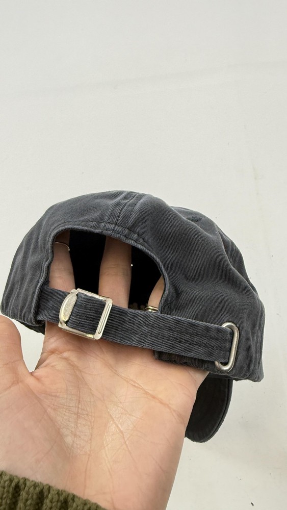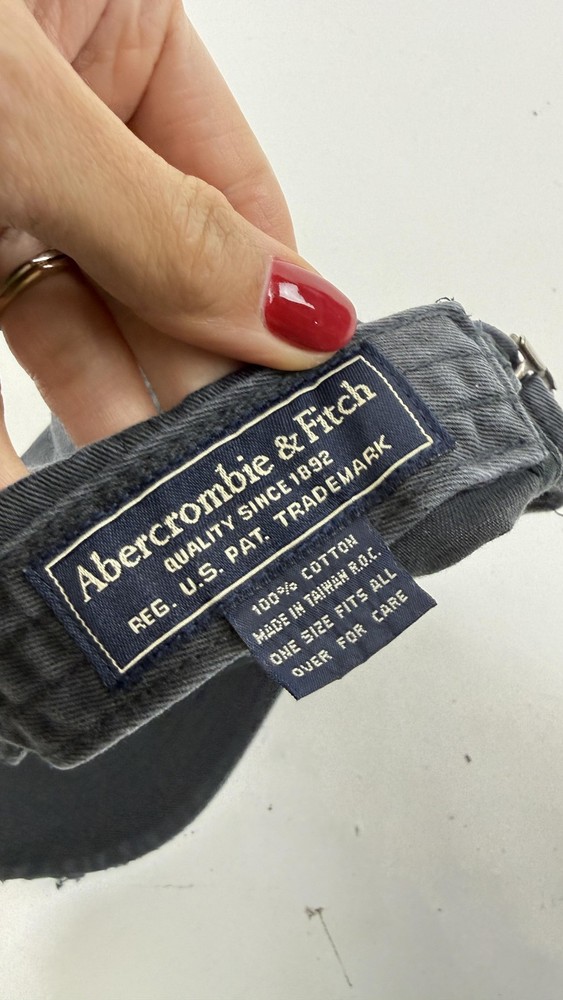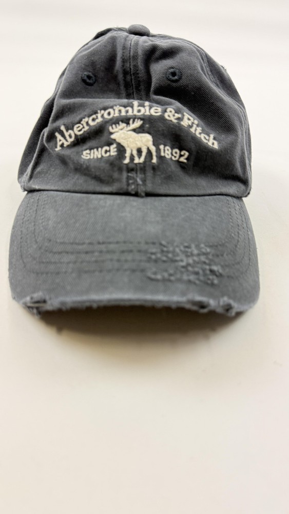 Abercrombie & Fitch Hat Cap Strap Back Mens One Size Gray Distressed Moose Logo Shows moderate wear with noticeable fading and fraying on the front brim and edges. Interior lining shows light wear but is generally clean; strap and hardware work properly. Brand: Abercrombie & Fitch Item: Casual baseball hat cap with curved brim and front embroidery. Color: Faded dark gray. Material: 100% cotton (per tag); made in Taiwan R.O.C. Size on tag: One Size Fits All (adjustable strap back). Details: Embroidered Abercrombie & Fitch Since 1892 moose logo on front, metal slide strap back closure, pre-curved bill, distressed frayed brim edge, tonal embroidered eyelets, unstructured crown. a3524
