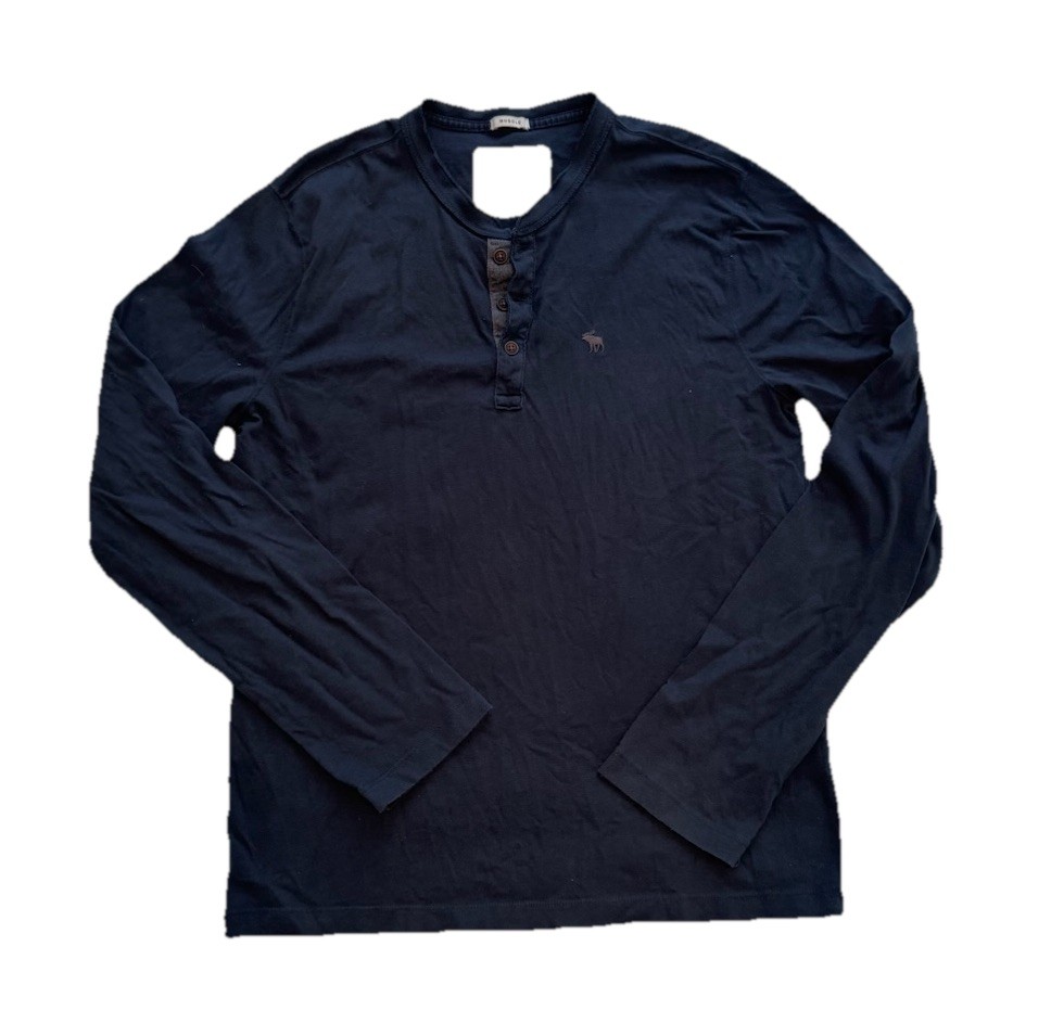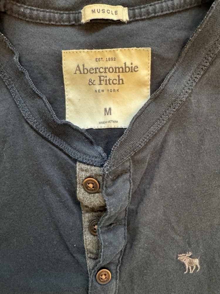 Pre-owned Abercrombie & Fitch men’s long sleeve Henley shirt in navy blue, size Medium. Features a 3-button front placket, soft cotton fabric, and the classic moose logo embroidered on the chest. Tagged MUSCLE, which offers a more fitted, athletic style. Item Details: • Brand: Abercrombie & Fitch • Size: M (Medium) • Fit: Muscle fit • Color: Navy • Style: Long sleeve Henley • Closure: 3-button placket • Logo: Embroidered moose • Material: Cotton • Made in: Vietnam Condition: Good pre-owned condition. Shows normal wear from washing (wrinkles, slight fade) but no major flaws noted. Please look through photos for exact condition. Comes from a smoke-free home. Great for: Casual everyday outfits, layering under flannels or jackets, college style, fall basics, and weekend wear. • Pit to pit: ~20–21” • Length: ~28” • Sleeve length: ~25” ⸻ abercrombie henley mens muscle fit navy long sleeve moose logo athletic style casual shirt layering top streetwear basics fall fashion ⸻ Weekend style Minimalist wardrobe College campus look Layering essentials