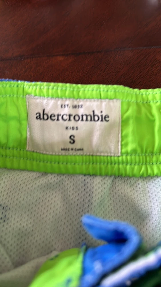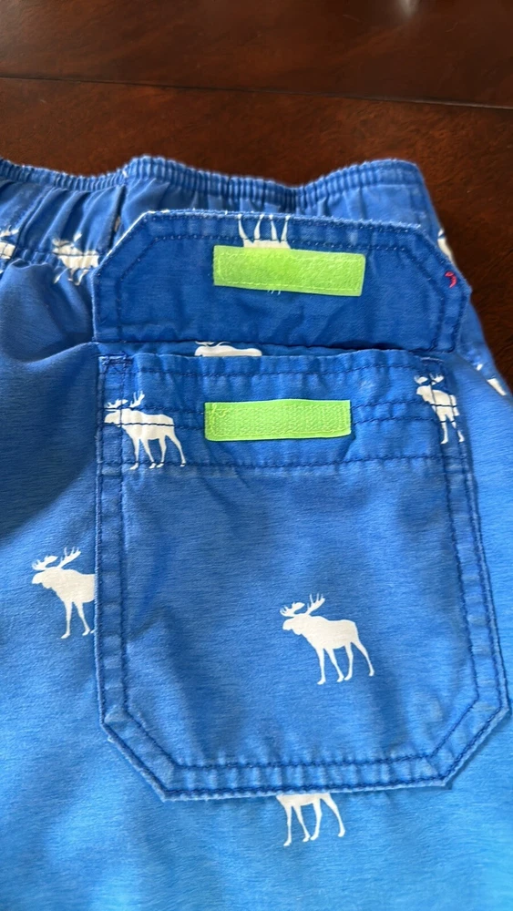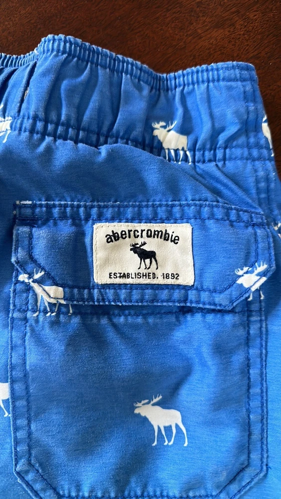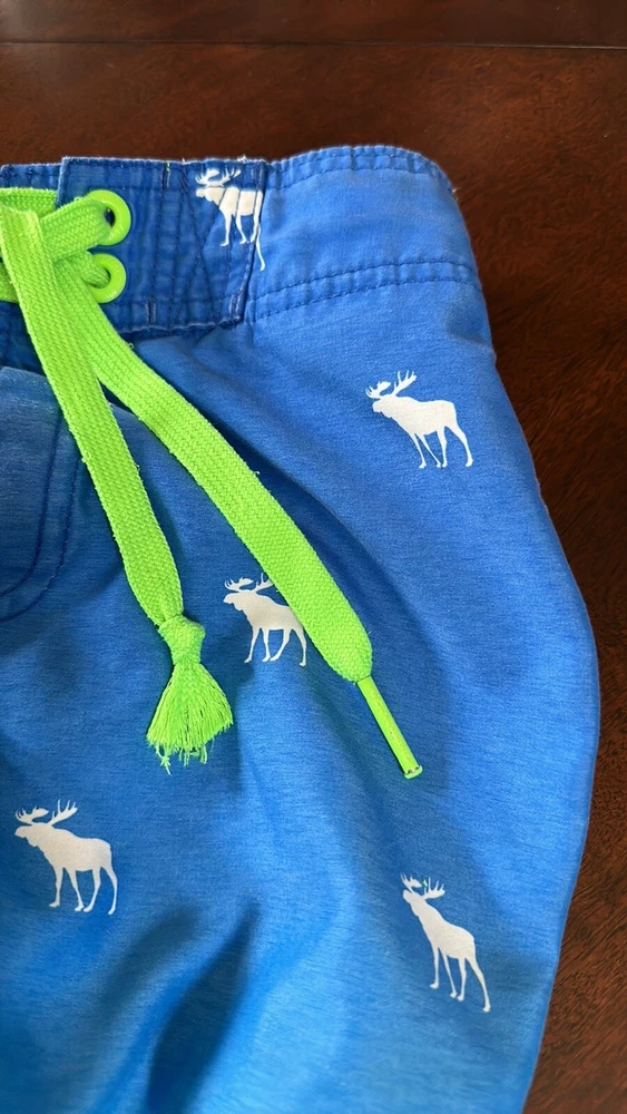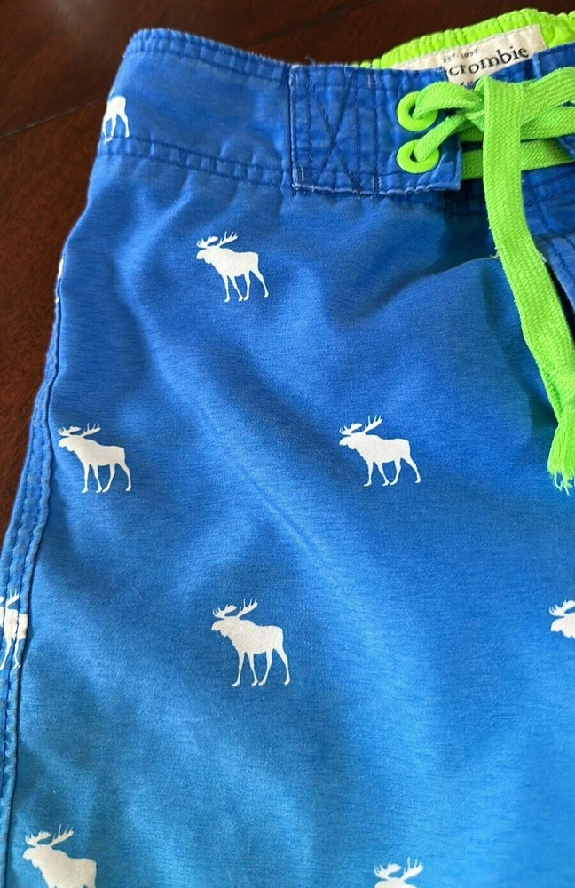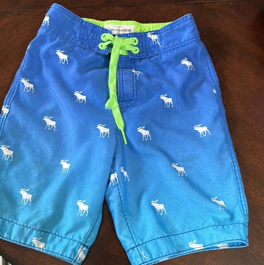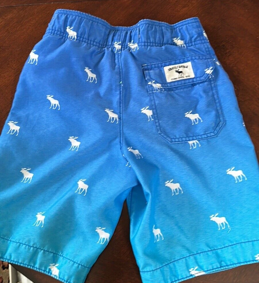Abercrombie & Fitch Kids Swim Shorts ~ Blue Ombré with Moose Pattern Size: small Missing one aglet; see all photos. Back pocket Inseam: 8” Waist when shorts are flat & unstretched: approx. 12"