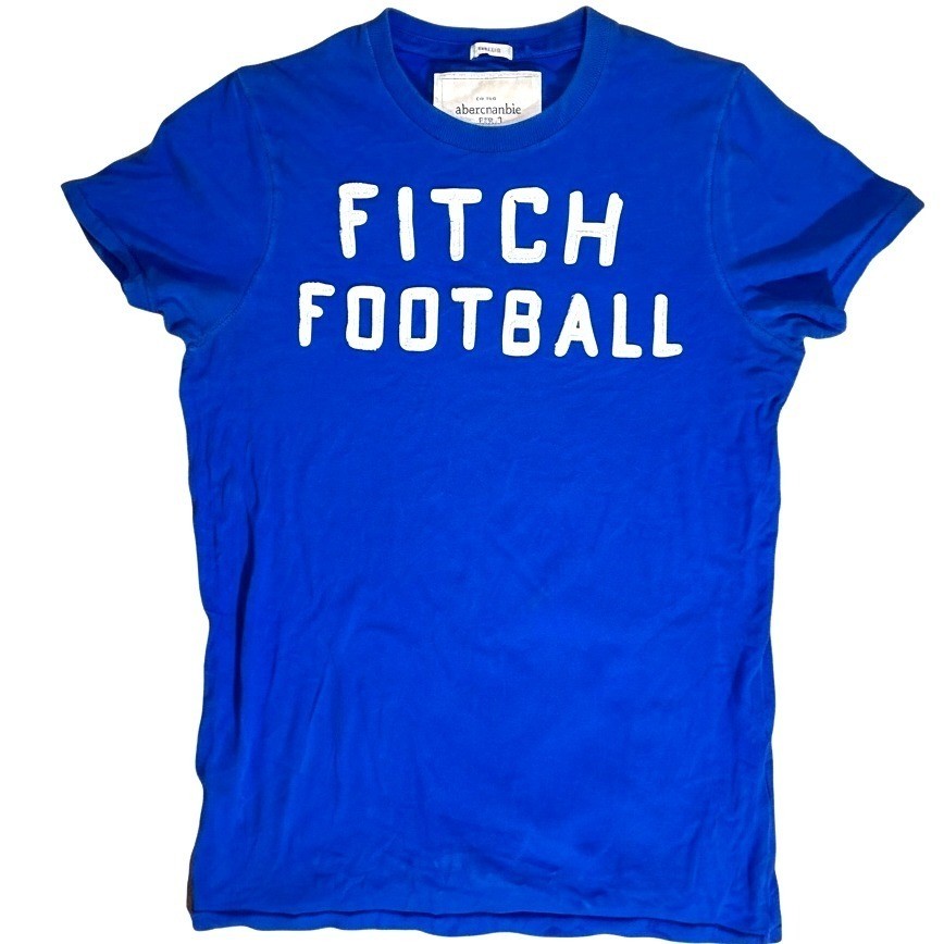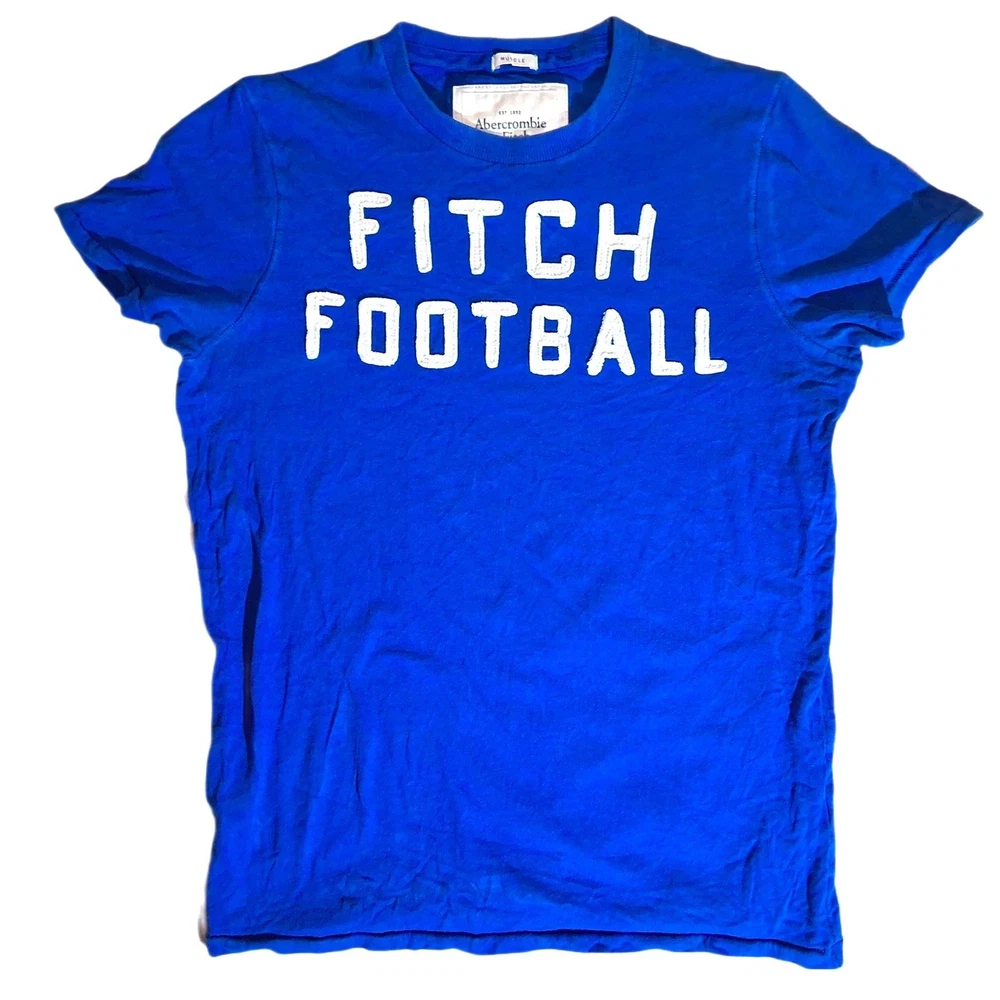 Sport this cool Abercrombie & Fitch t-shirt and score big on style. The vibrant blue hue and bold 'FITCH FOOTBALL' graphic make a statement, perfect for casual outings or cheering on your favorite team. Its comfortable fit ensures you'll feel great all day long, whether you're hitting the town or relaxing at home. Ideal for game days, weekend wear, or a laid-back brunch. Measurements: • Chest: 21 in • Length: 28 in • Shoulder to Shoulder: 17 in • Sleeve Length: 8 in Department: Men Theme: Sports, Football Fit: Regular Sleeve Length: Short Sleeve Pattern: Graphic Print Type: T-Shirt Features: Breathable Neckline: Round Neck Fabric Type: Jersey Material: Cotton Accents: Logo Season: Spring, Summer, Fall, Winter Model: Sportsman Garment Care: Machine Washable Country of Origin: China