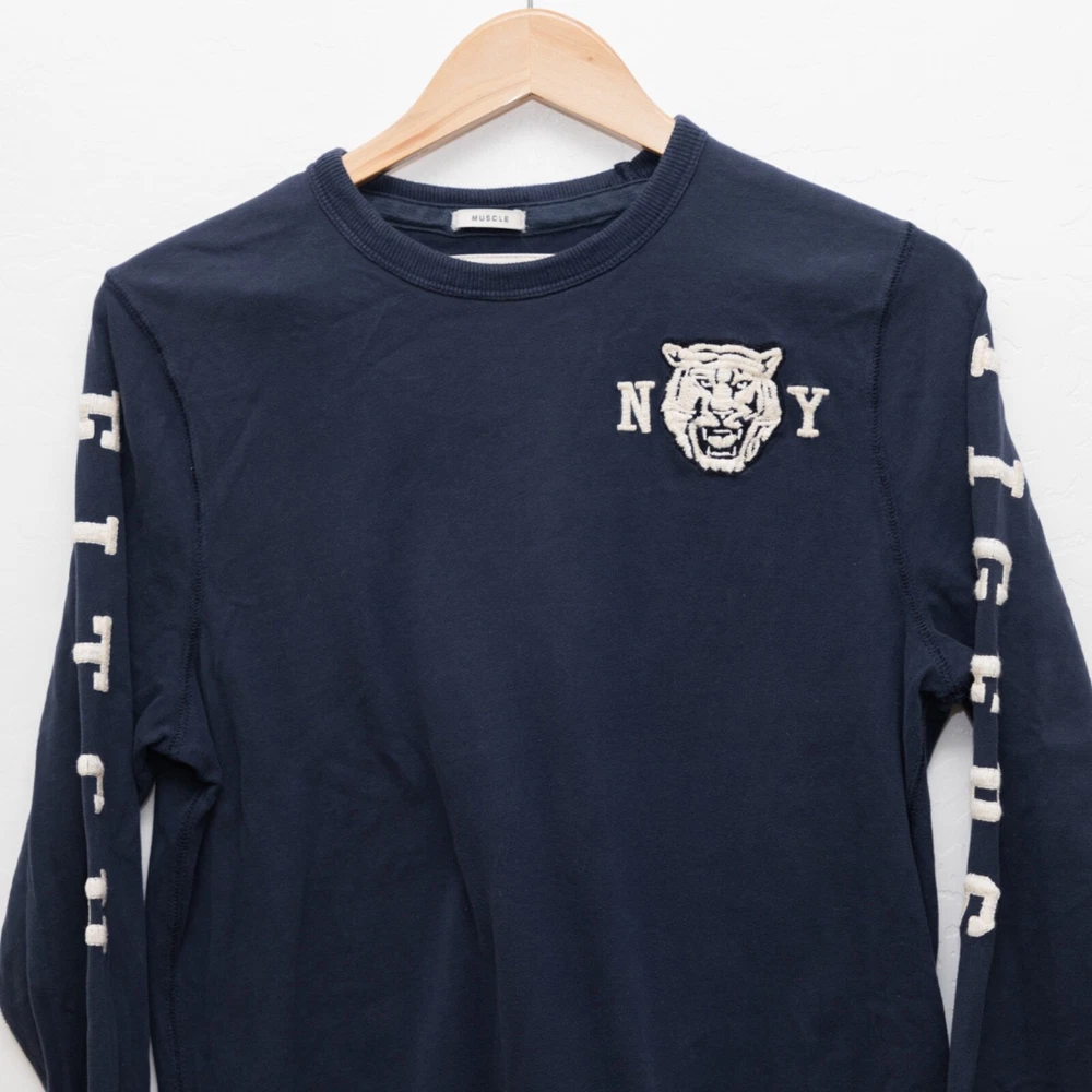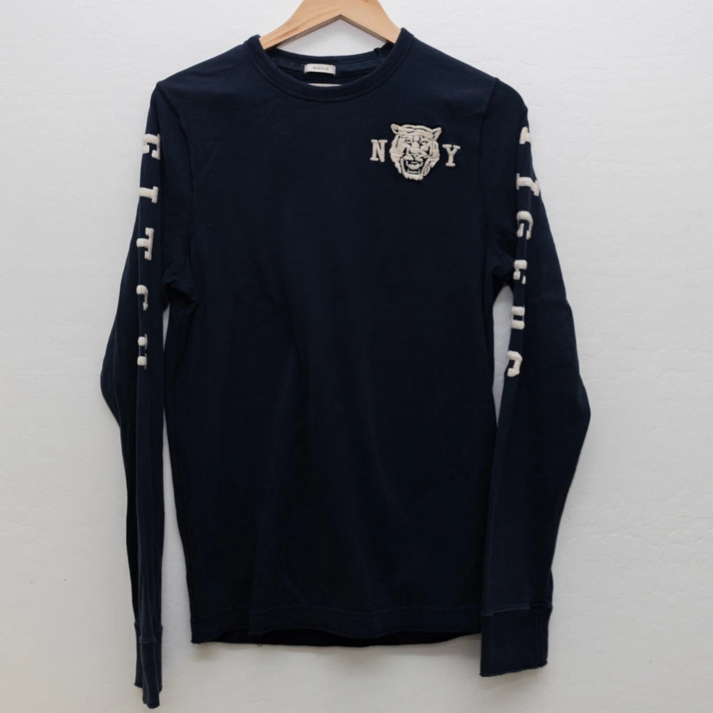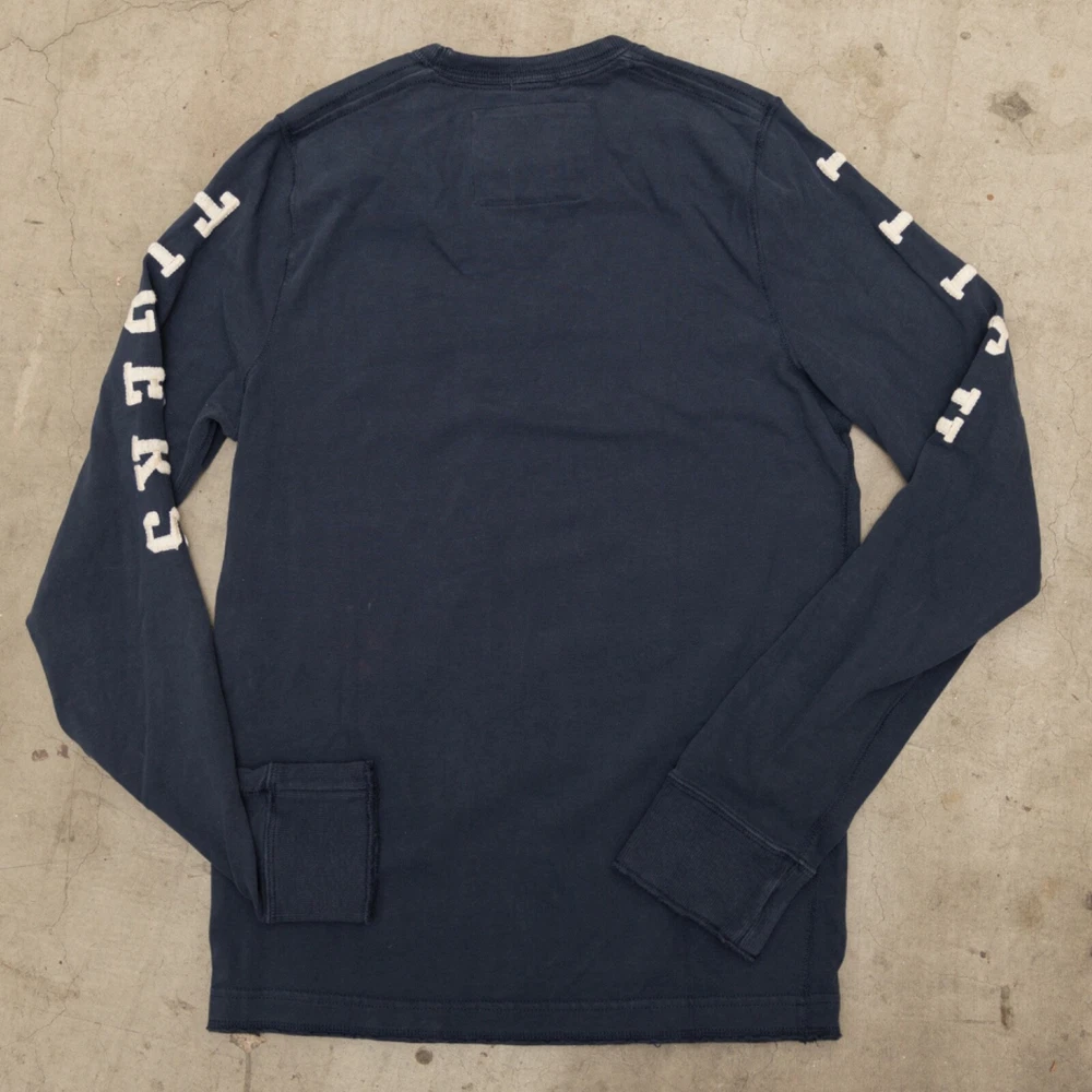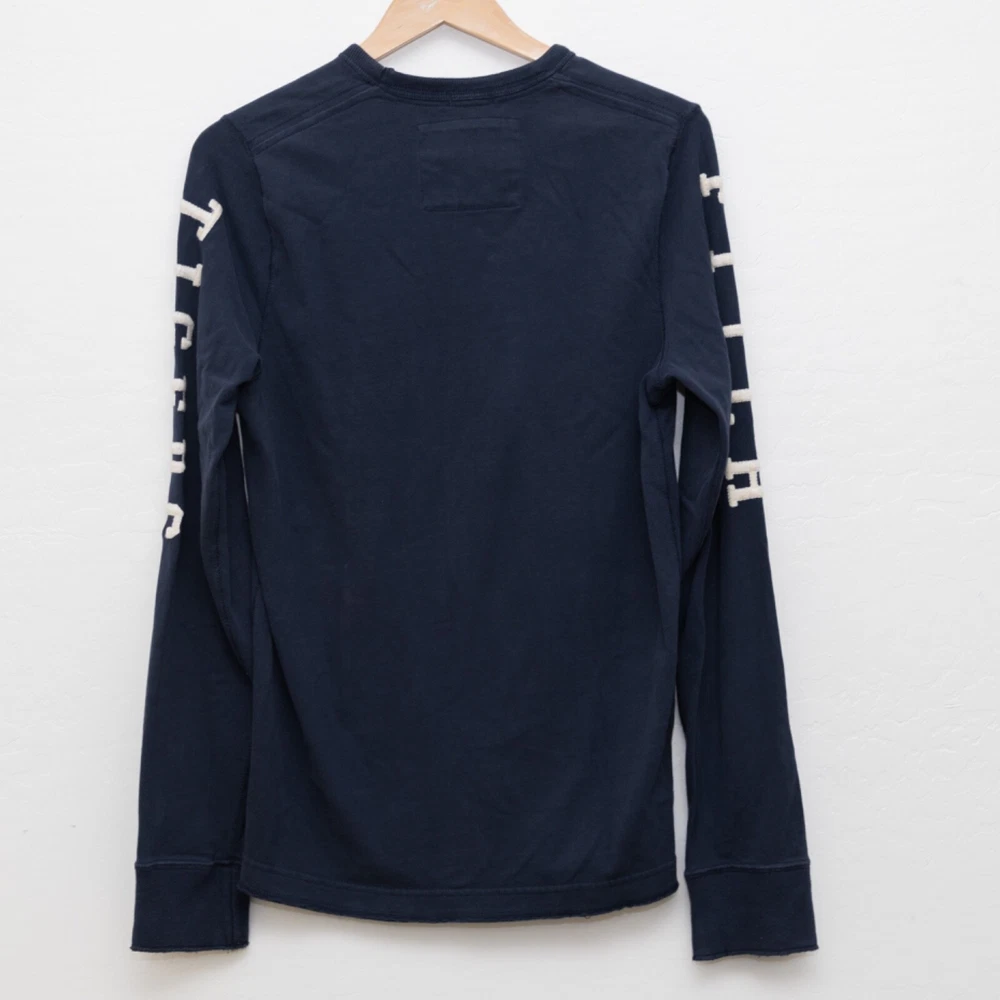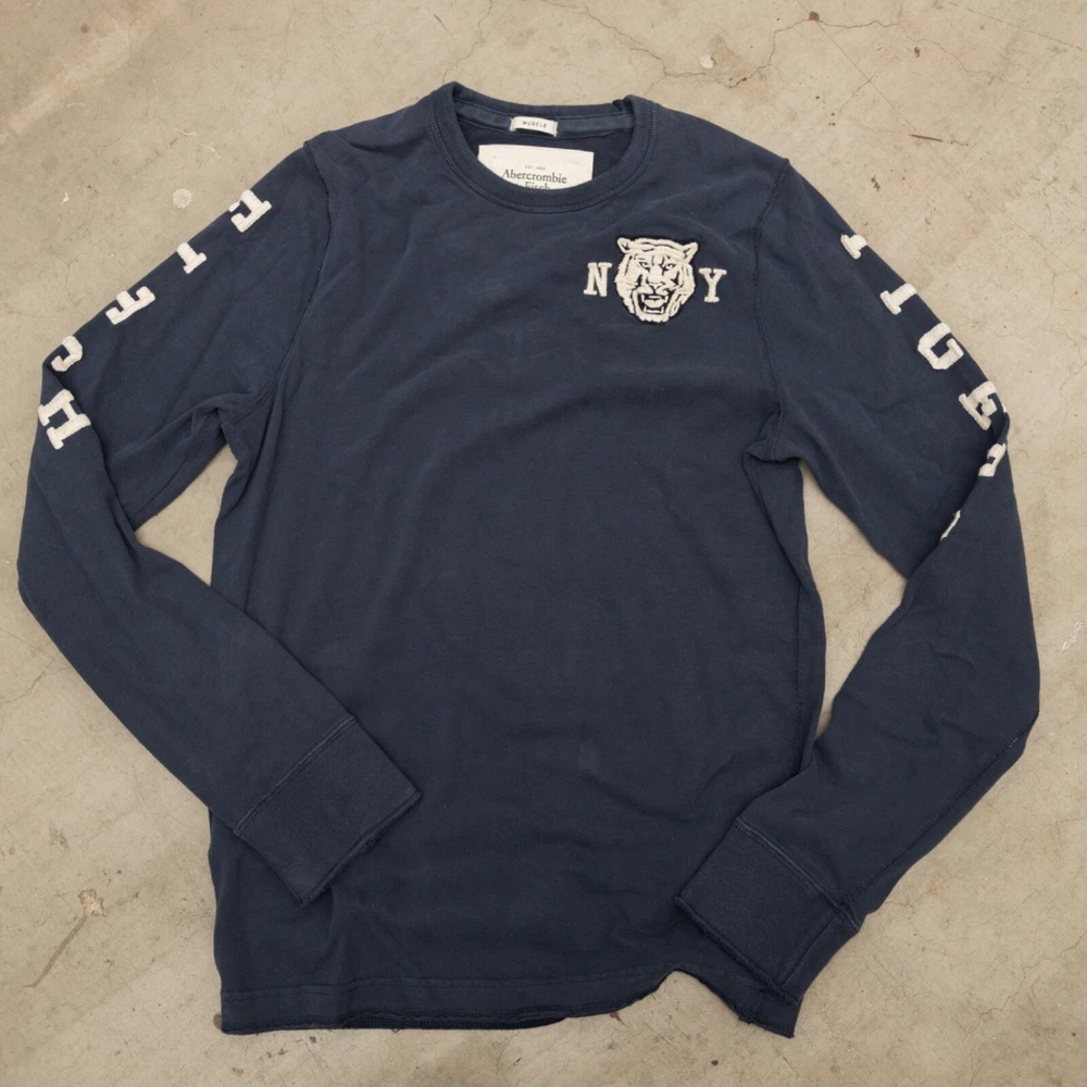 Abercrombie & Fitch Men's Medium Blue T-Shirt with a crew neck, long sleeves, and a solid design. Made of cotton, it features embroidered detailing and the brand's logo. The fit is athletic, ideal for a classic and preppy style, suitable for all seasons. Measurements: 20” pit to pit 30” length 29” sleeve