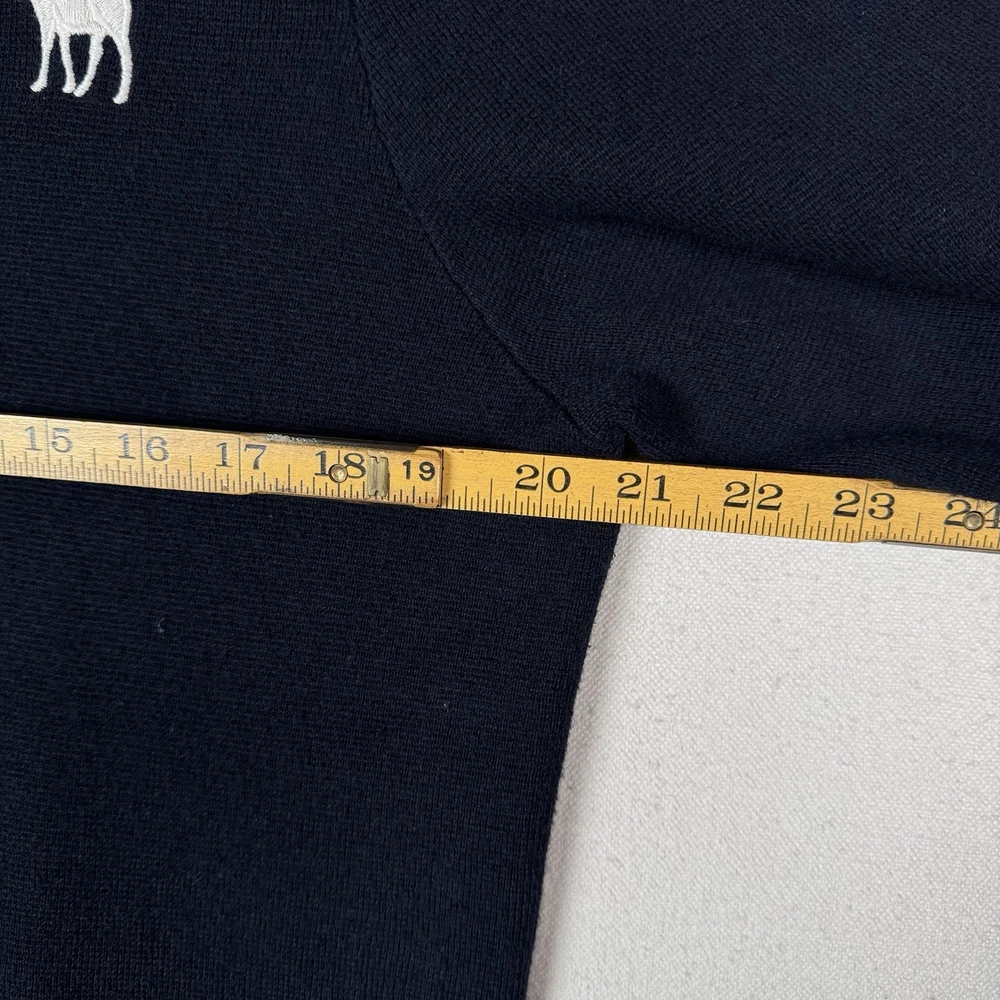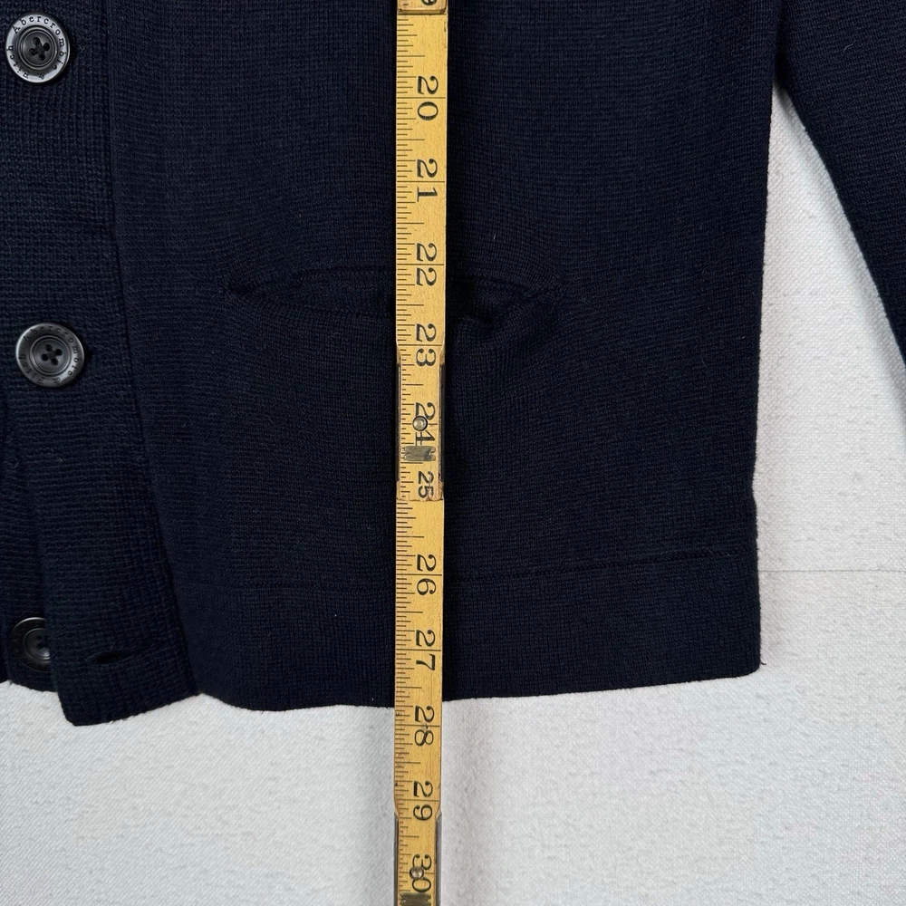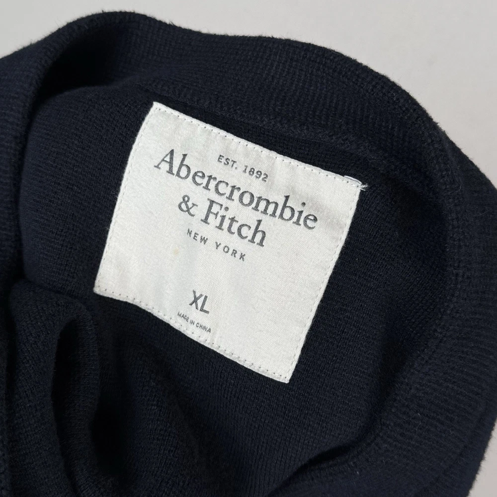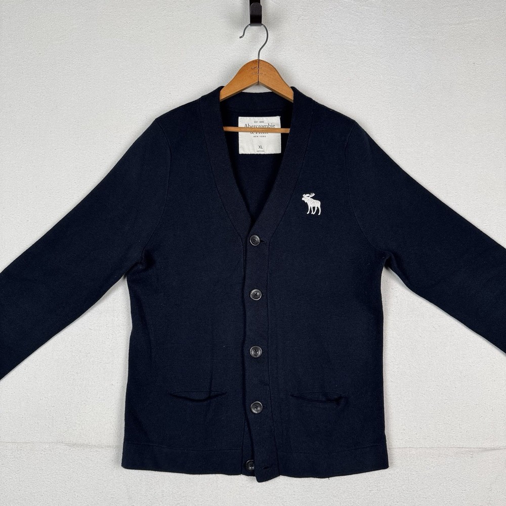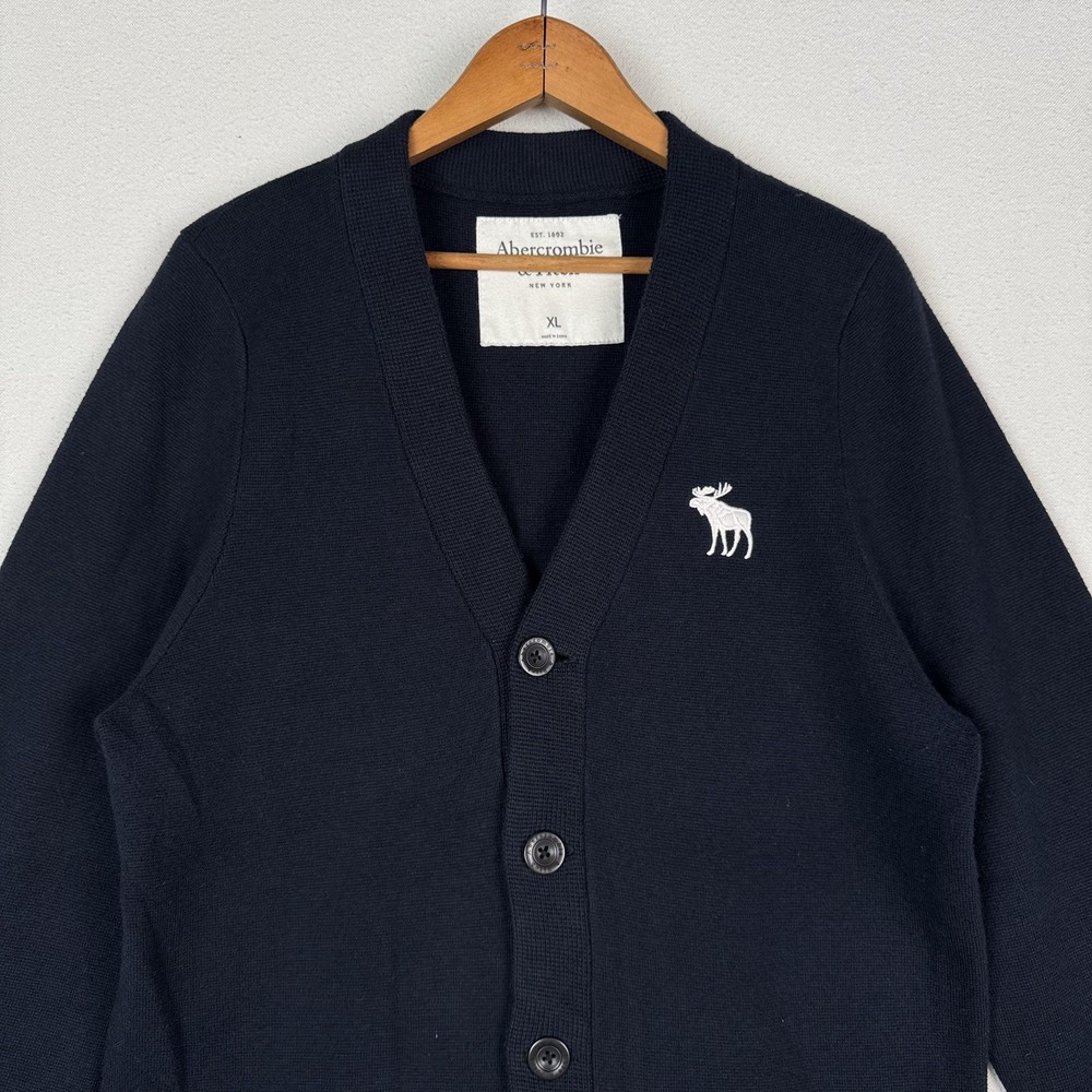 **chest/P2P: 21” length: 27”** Men's XL navy blue cardigan sweater from Abercrombie & Fitch. It features a tight-knit design with a solid pattern and long sleeves. Made from a blend of polyester, nylon, wool, and cotton, this sweater has an embroidered moose logo accent, button closure, and pockets. With a classic preppy style, it can be worn for school or college settings, embodying the brand's signature look. Made in China, this sweater is a versatile and stylish addition to any man's wardrobe.