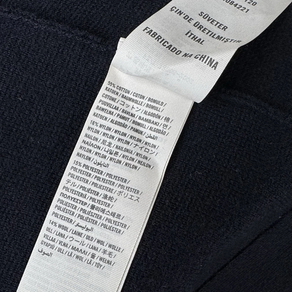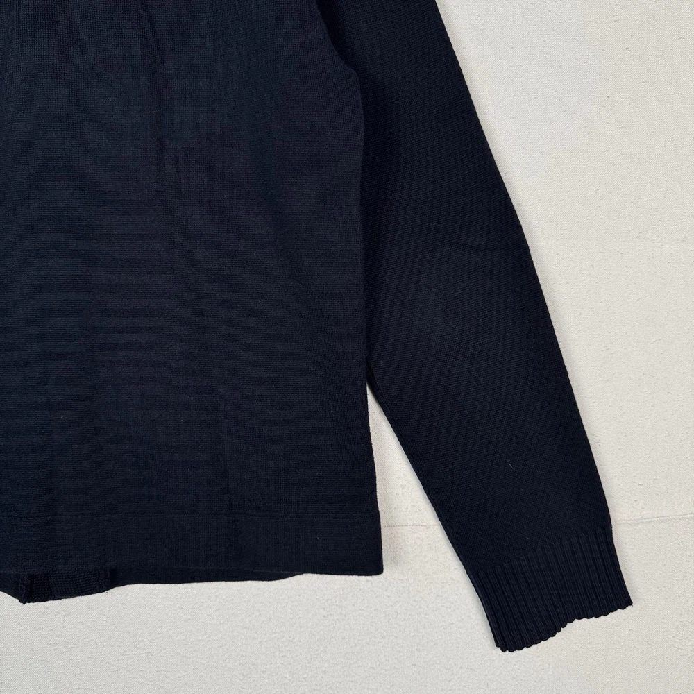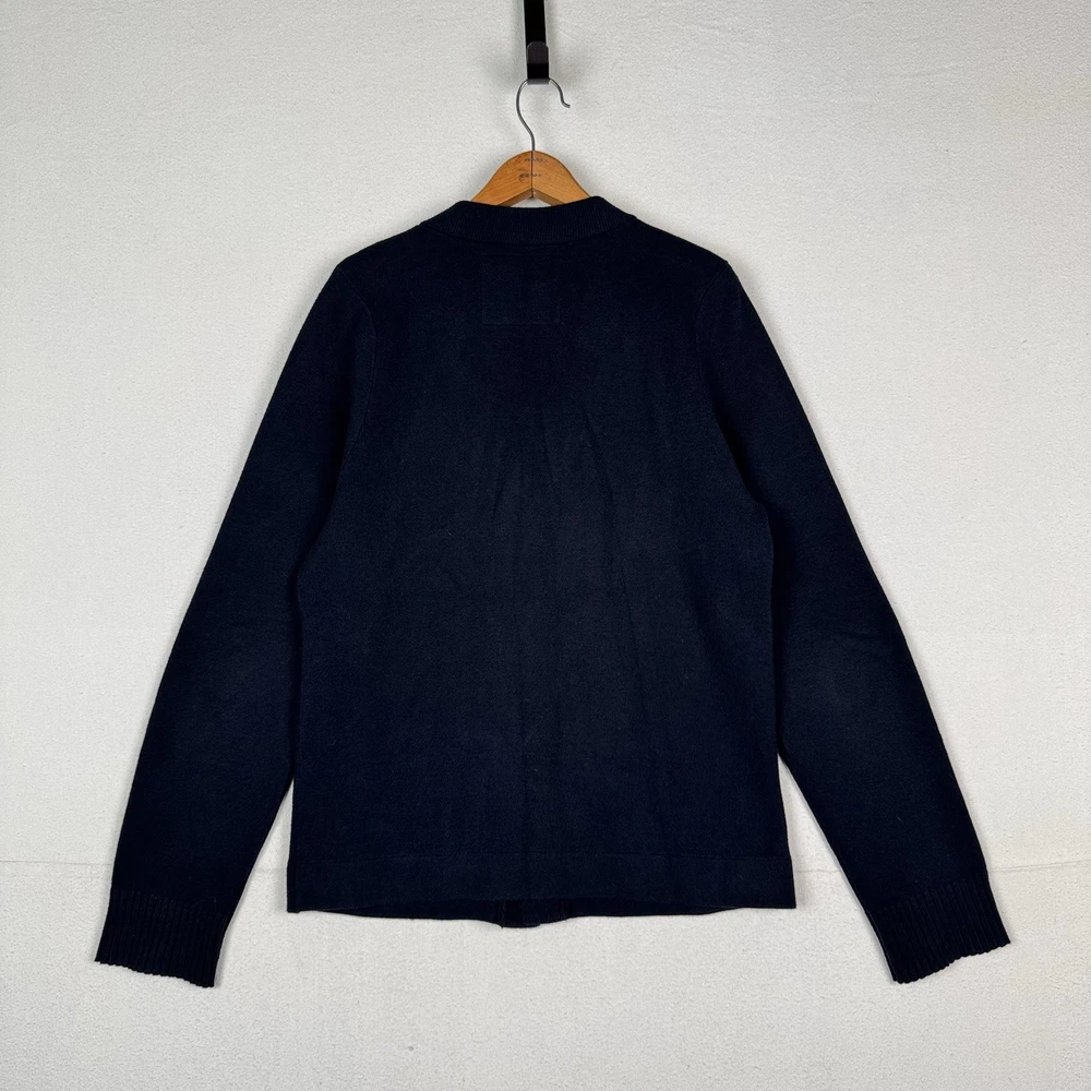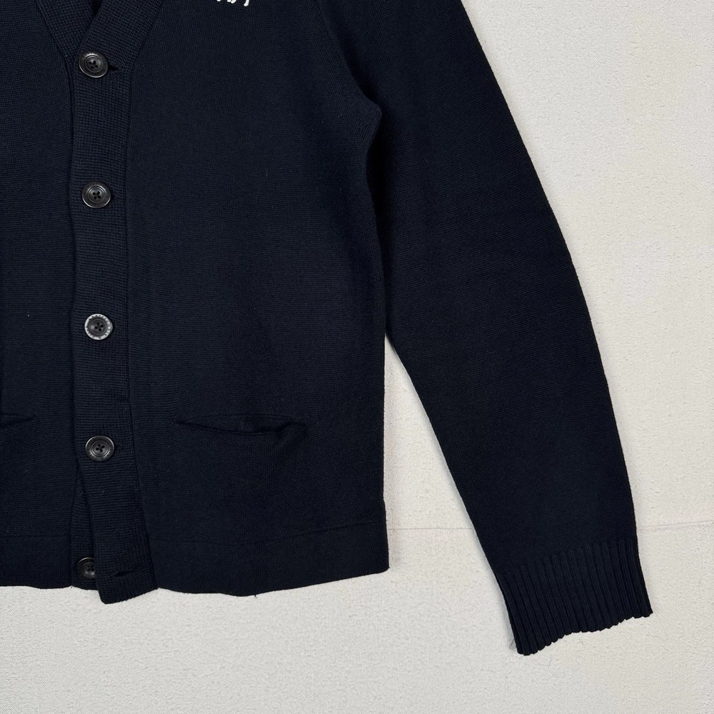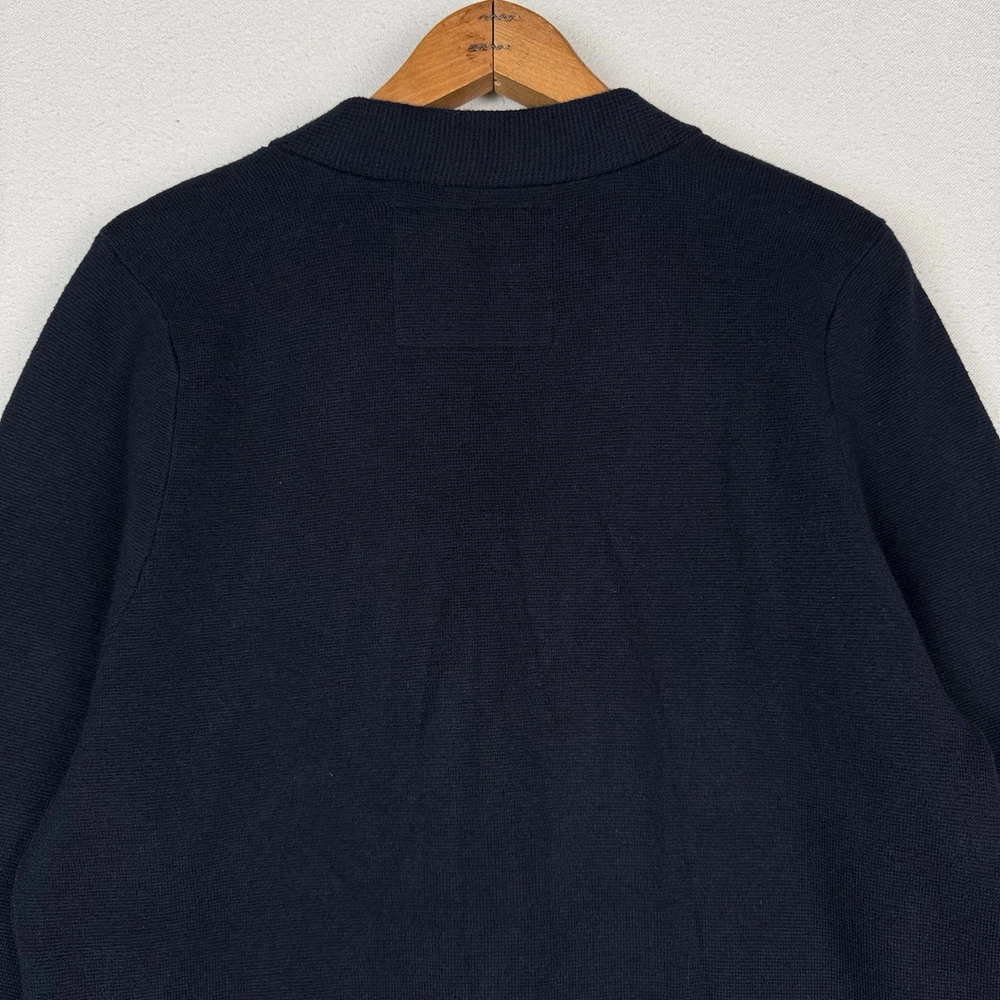 **chest/P2P: 21” length: 27”** Men's XL navy blue cardigan sweater from Abercrombie & Fitch. It features a tight-knit design with a solid pattern and long sleeves. Made from a blend of polyester, nylon, wool, and cotton, this sweater has an embroidered moose logo accent, button closure, and pockets. With a classic preppy style, it can be worn for school or college settings, embodying the brand's signature look. Made in China, this sweater is a versatile and stylish addition to any man's wardrobe.