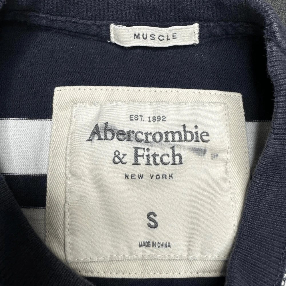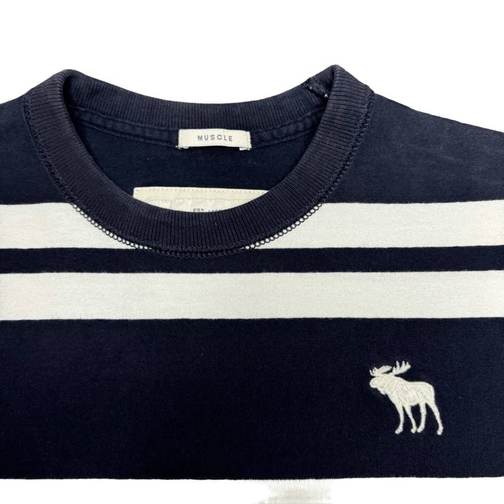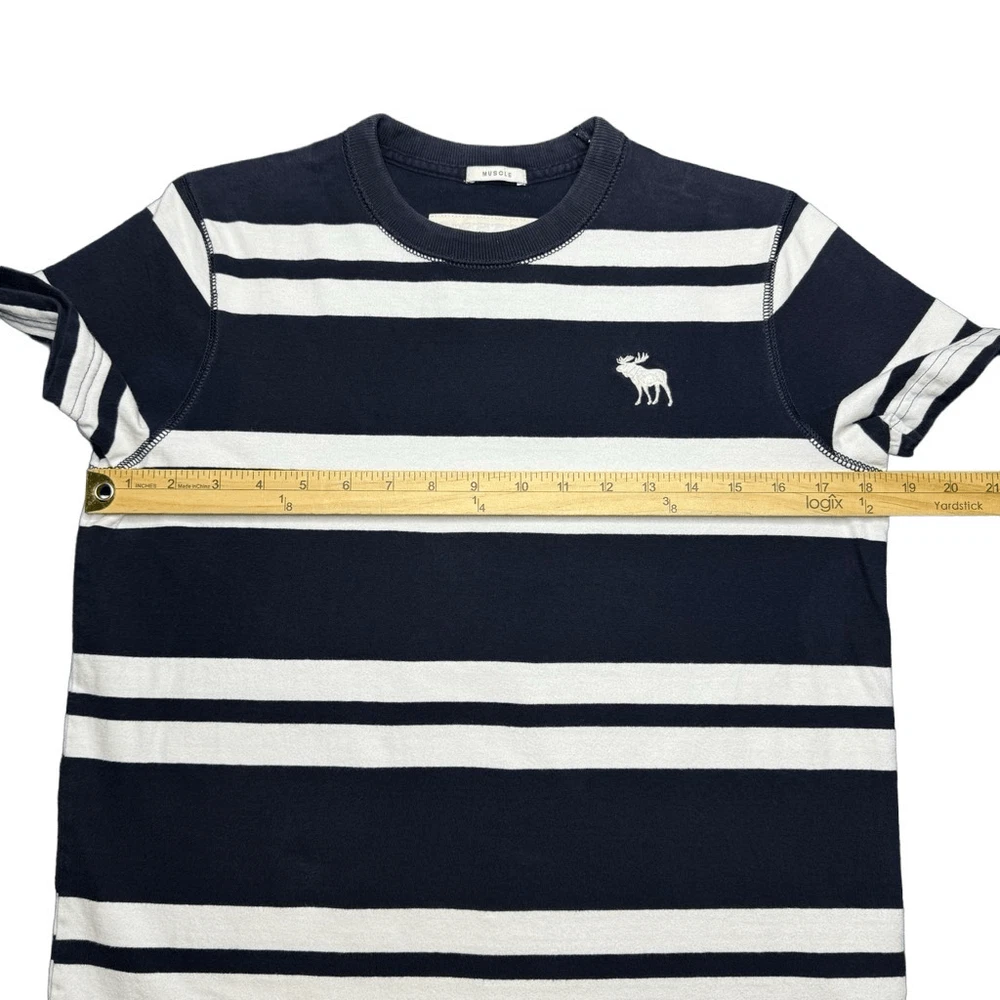 Abercrombie & Fitch Muscle Fit T Shirt Mens S Striped Navy Blue White Y2K Preppy In good condition with no rips, holes, or major stains. Has a very small very light spot on the back near the bottom. Also some very light fading overall. All can be seen in the pictures. Length - 25” Pit to Pit - 18”