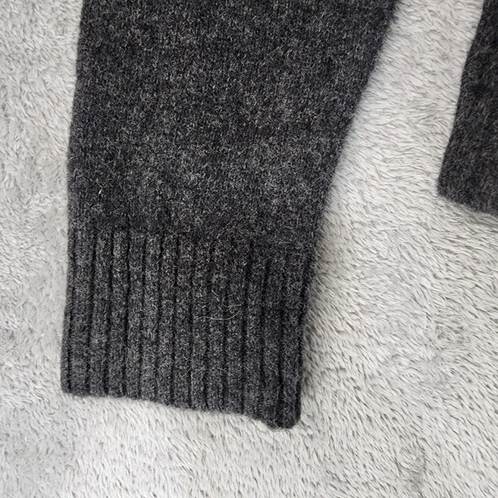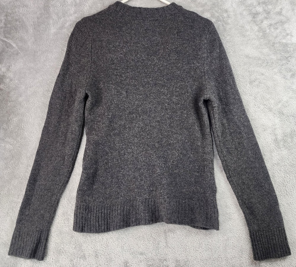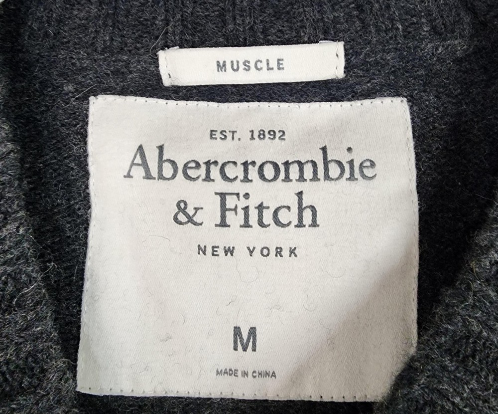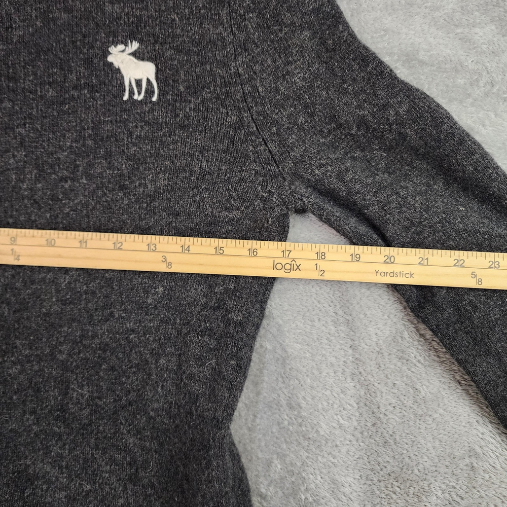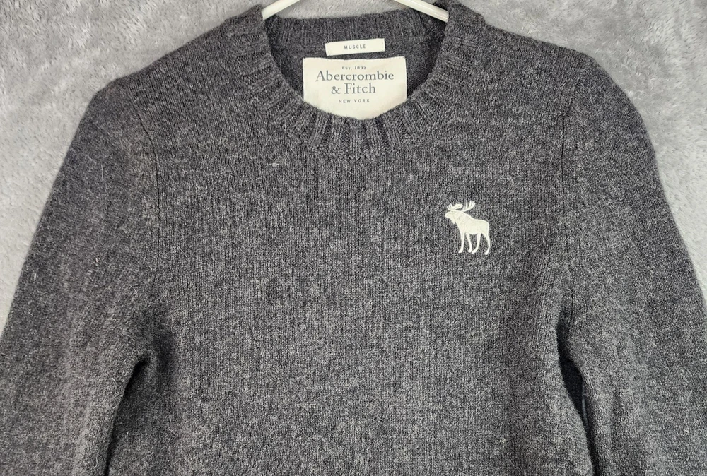 Brand: Abercrombie & Fitch, muscle fit line. Style: Mens crew neck wool sweater pullover with long sleeves and tight-knit construction. Color: dark heather gray; Material: 100% wool, exclusive of decoration; dry clean only. Tag size: Mens Medium (M). Pre-owned wool sweater with light overall fuzz and a few stray fibers from wear. Fabric clean and intact with no holes or stains. Interior tags present. Details: Ribbed neckline, cuffs, and hem, embroidered moose logo at left chest, classic preppy look. Made in China.