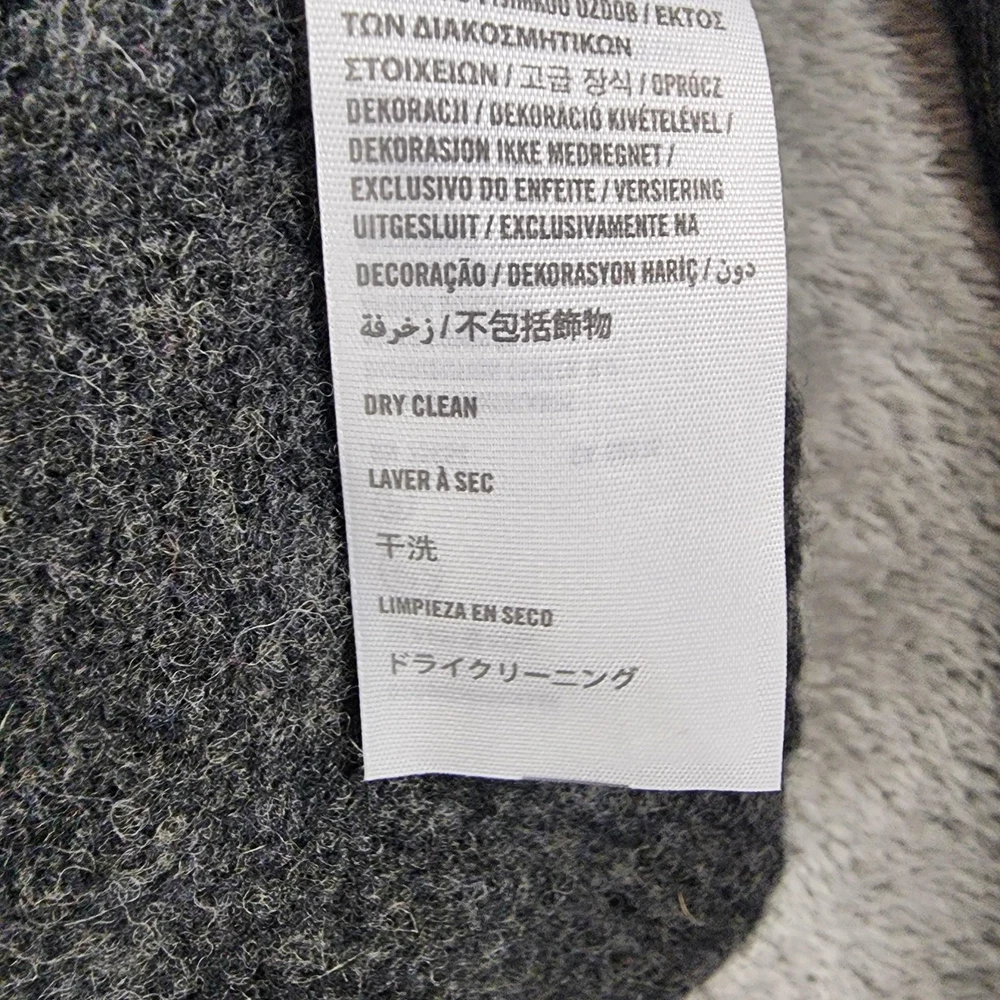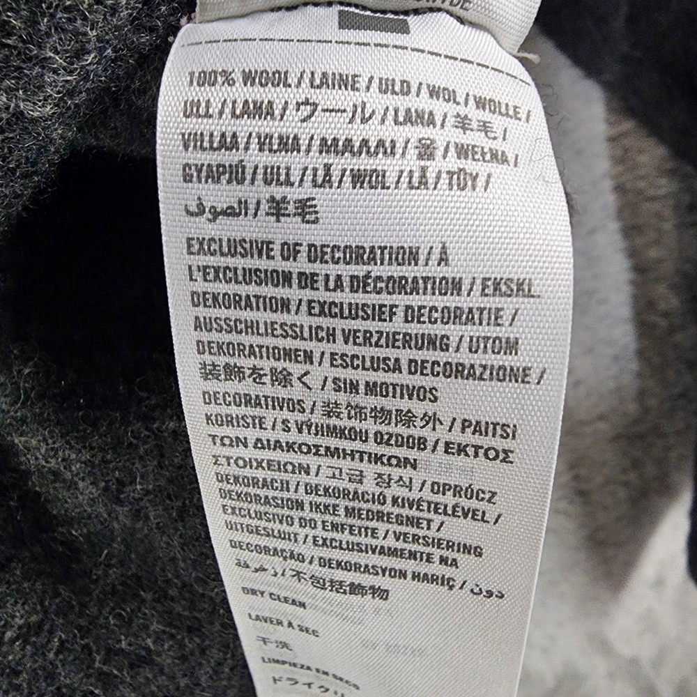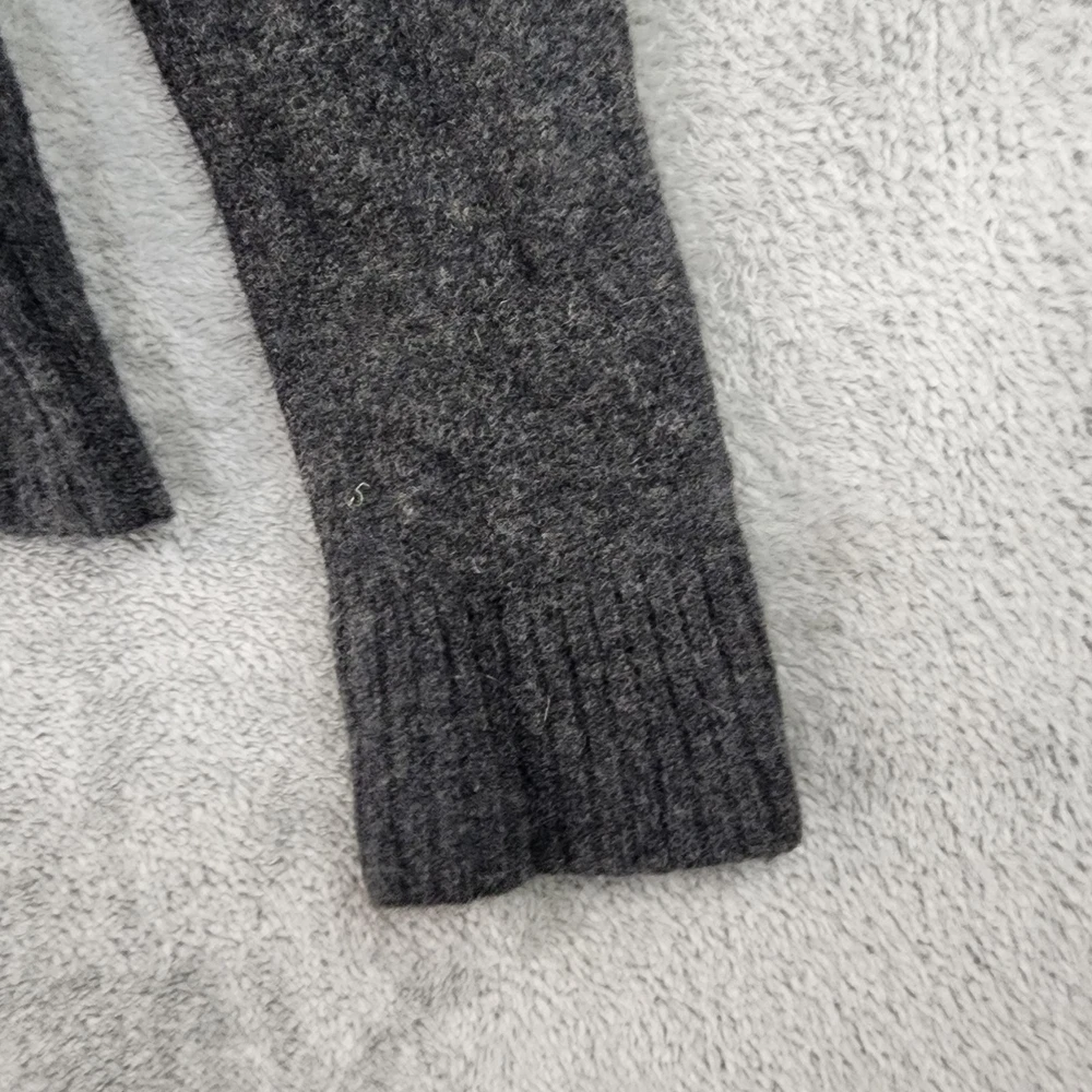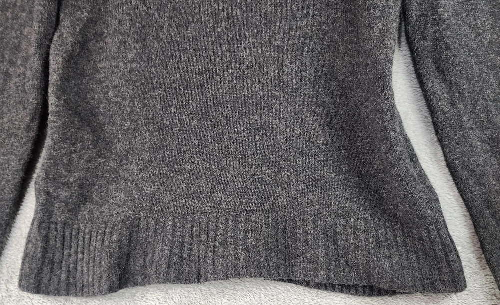 Brand: Abercrombie & Fitch, muscle fit line. Style: Mens crew neck wool sweater pullover with long sleeves and tight-knit construction. Color: dark heather gray; Material: 100% wool, exclusive of decoration; dry clean only. Tag size: Mens Medium (M). Pre-owned wool sweater with light overall fuzz and a few stray fibers from wear. Fabric clean and intact with no holes or stains. Interior tags present. Details: Ribbed neckline, cuffs, and hem, embroidered moose logo at left chest, classic preppy look. Made in China.
