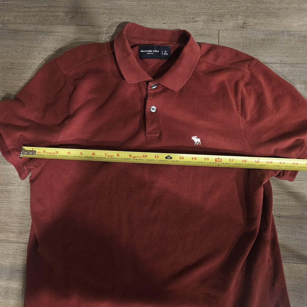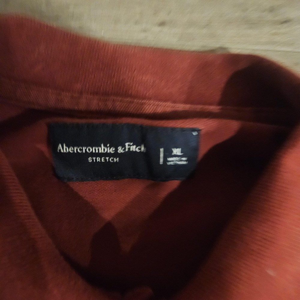 Brand: Abercrombie & Fitch. Style: Mens stretch polo shirt designed for casual everyday wear. Color: Solid brick red / rust tone. Size: Mens XL (Extra Large) per interior neck tag; regular size type. Material: Soft stretch knit polo fabric with a comfortable hand feel; exact fiber content is not visible on the tags shown. Details: Collared neckline, two-button front placket with matching buttons, short sleeves, ribbed collar and sleeve cuffs, small contrasting embroidered moose logo at the left chest, and straight hem. Notes: Shirt is shown laid flat in photos and is stored in a clear protective plastic bag with a SEA-DEALS inventory label on the bag; this label is for storage and identification only and is not original retail packaging.