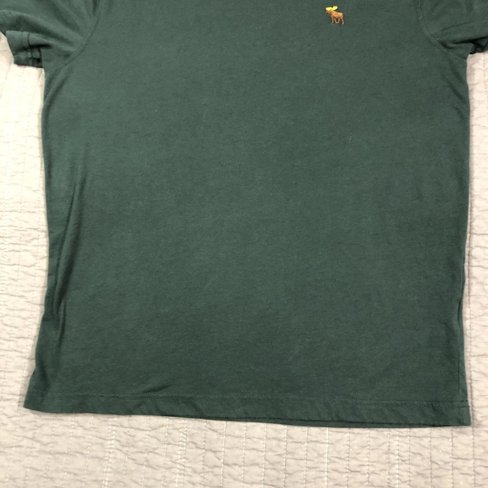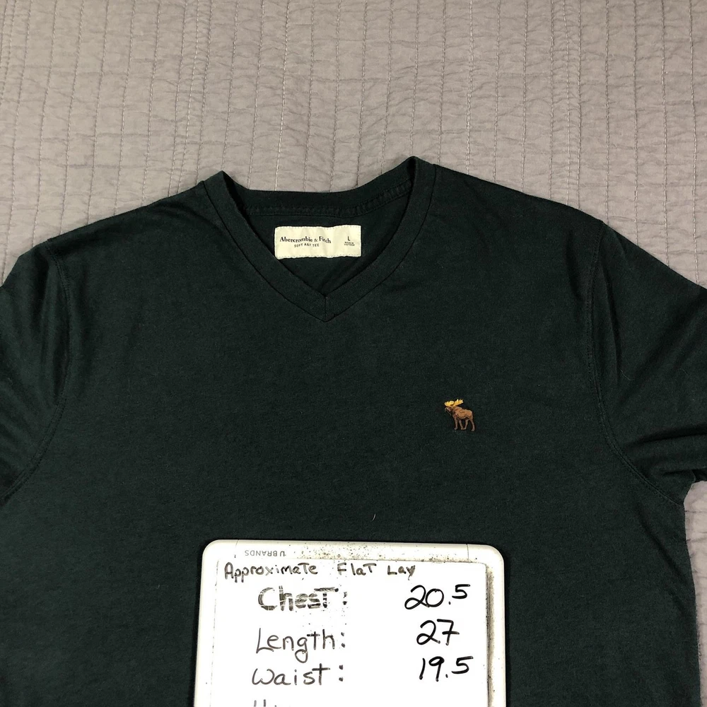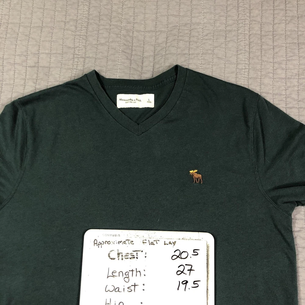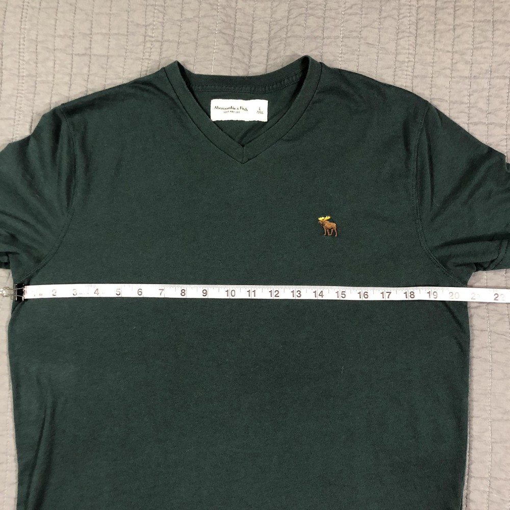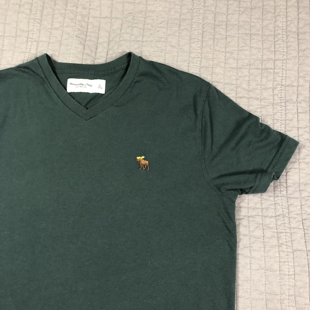 Brand: Abercrombie & Fitch Style: Mens short sleeve V-neck solid knit t-shirt from the Soft A&F Tee line. Color: Dark forest green with contrasting brown and yellow embroidered moose logo at the left chest. Size: Mens Large (L) per woven neck label; regular fit. Material: Soft lightweight knit; specific fiber content not visible in photos. Country of origin: Made in Vietnam. Style / model details: Classic Abercrombie & Fitch basics tee with minimal branding and small moose chest embroidery. Features: V-neckline, short sleeves, solid dark green body, small embroidered moose logo at left chest, straight hem, soft casual knit suitable for everyday wear or layering. Actual Measurements: Chest: 20.5 in, Length: 27 in, Waist: 19.5 in. Condition: Softly worn dark green Abercrombie & Fitch V-neck tee with light wash wear and fabric softening from normal use. Fabric is clean and intact with no holes, tears, or stains; seams, hems, and neckline remain secure. Embroidered moose chest logo is crisp with no fraying; interior size label present, no original retail tags or packaging. Please review all photos for close-up views of the color, fabric texture, measurements, and overall condition. Be sure to compare the measurements with your own. Check out my other items Most of my items now offer combined shipping of just $1.00 more per item! Be sure to follow my store for updates on new listings! Store: Daisy Mae Dixie I ship same or next day with the exception of weekends and postal holidays.