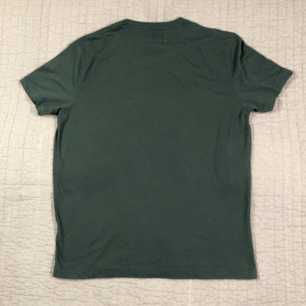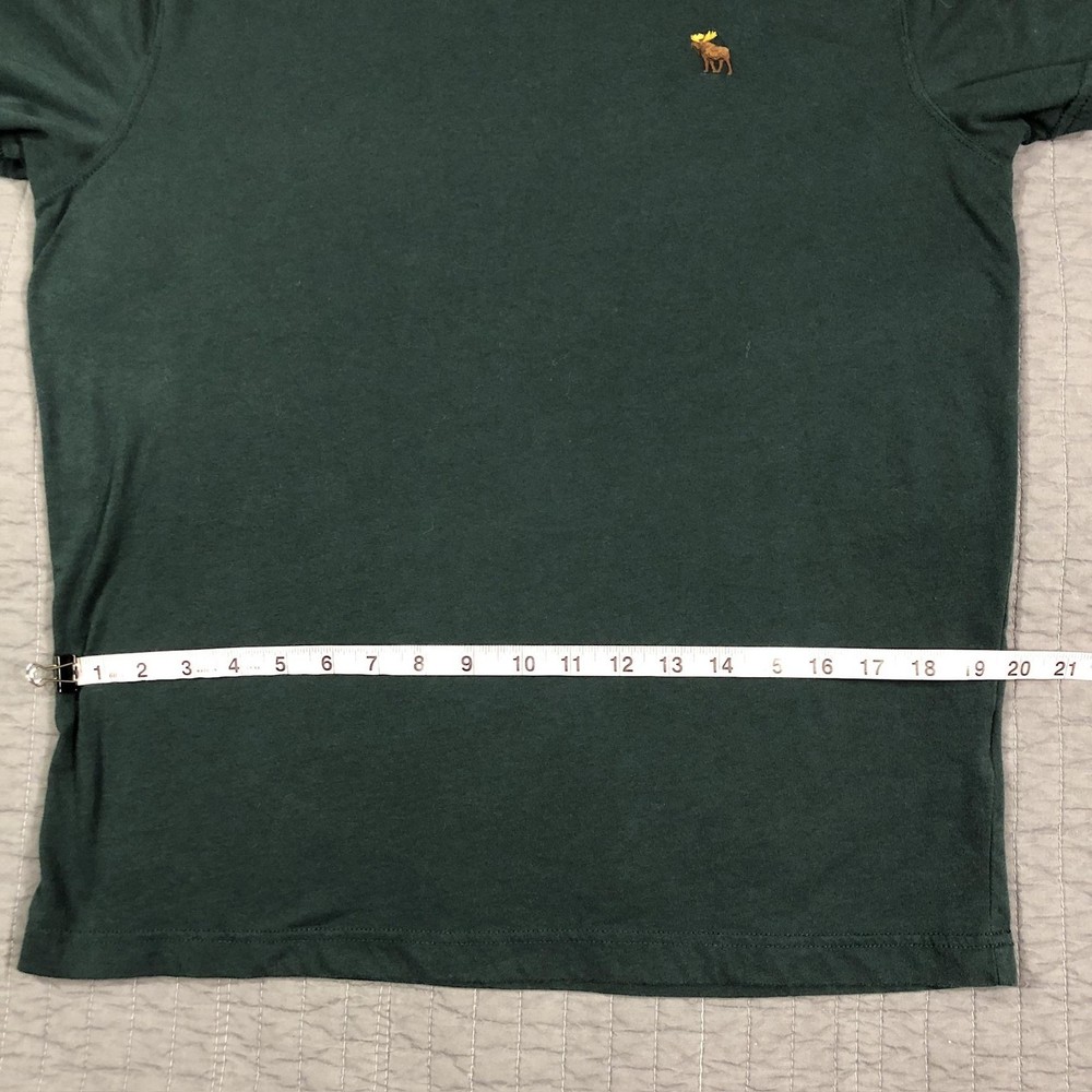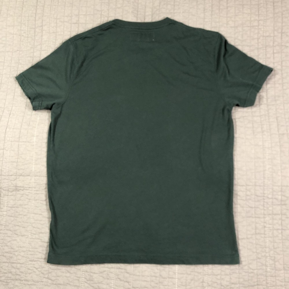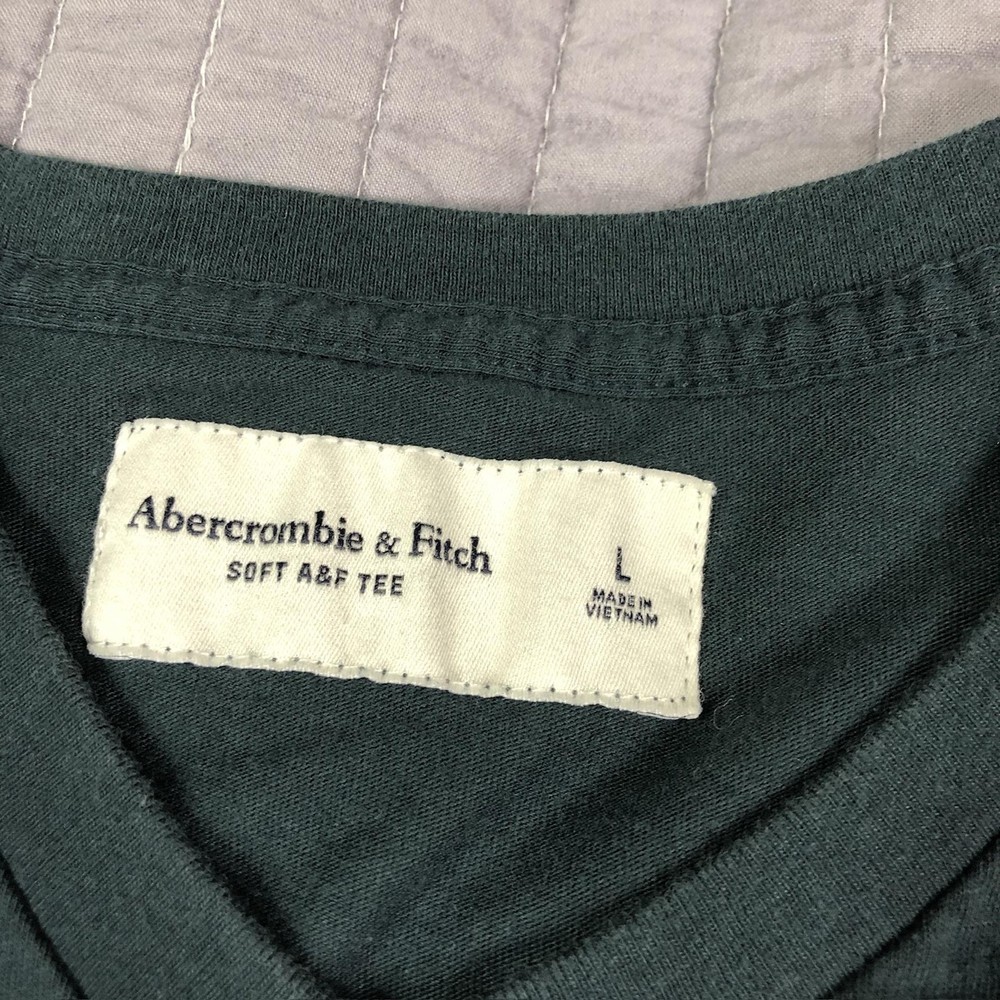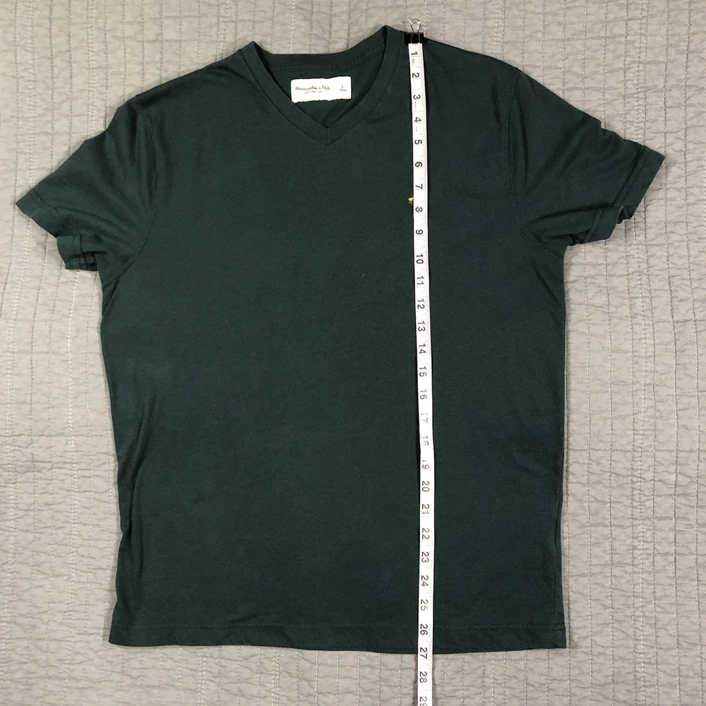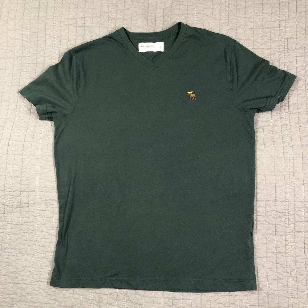 Brand: Abercrombie & Fitch Style: Mens short sleeve V-neck solid knit t-shirt from the Soft A&F Tee line. Color: Dark forest green with contrasting brown and yellow embroidered moose logo at the left chest. Size: Mens Large (L) per woven neck label; regular fit. Material: Soft lightweight knit; specific fiber content not visible in photos. Country of origin: Made in Vietnam. Style / model details: Classic Abercrombie & Fitch basics tee with minimal branding and small moose chest embroidery. Features: V-neckline, short sleeves, solid dark green body, small embroidered moose logo at left chest, straight hem, soft casual knit suitable for everyday wear or layering. Actual Measurements: Chest: 20.5 in, Length: 27 in, Waist: 19.5 in. Condition: Softly worn dark green Abercrombie & Fitch V-neck tee with light wash wear and fabric softening from normal use. Fabric is clean and intact with no holes, tears, or stains; seams, hems, and neckline remain secure. Embroidered moose chest logo is crisp with no fraying; interior size label present, no original retail tags or packaging. Please review all photos for close-up views of the color, fabric texture, measurements, and overall condition. Be sure to compare the measurements with your own. Check out my other items Most of my items now offer combined shipping of just $1.00 more per item! Be sure to follow my store for updates on new listings! Store: Daisy Mae Dixie I ship same or next day with the exception of weekends and postal holidays.