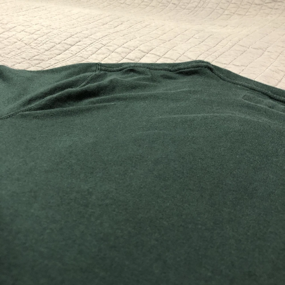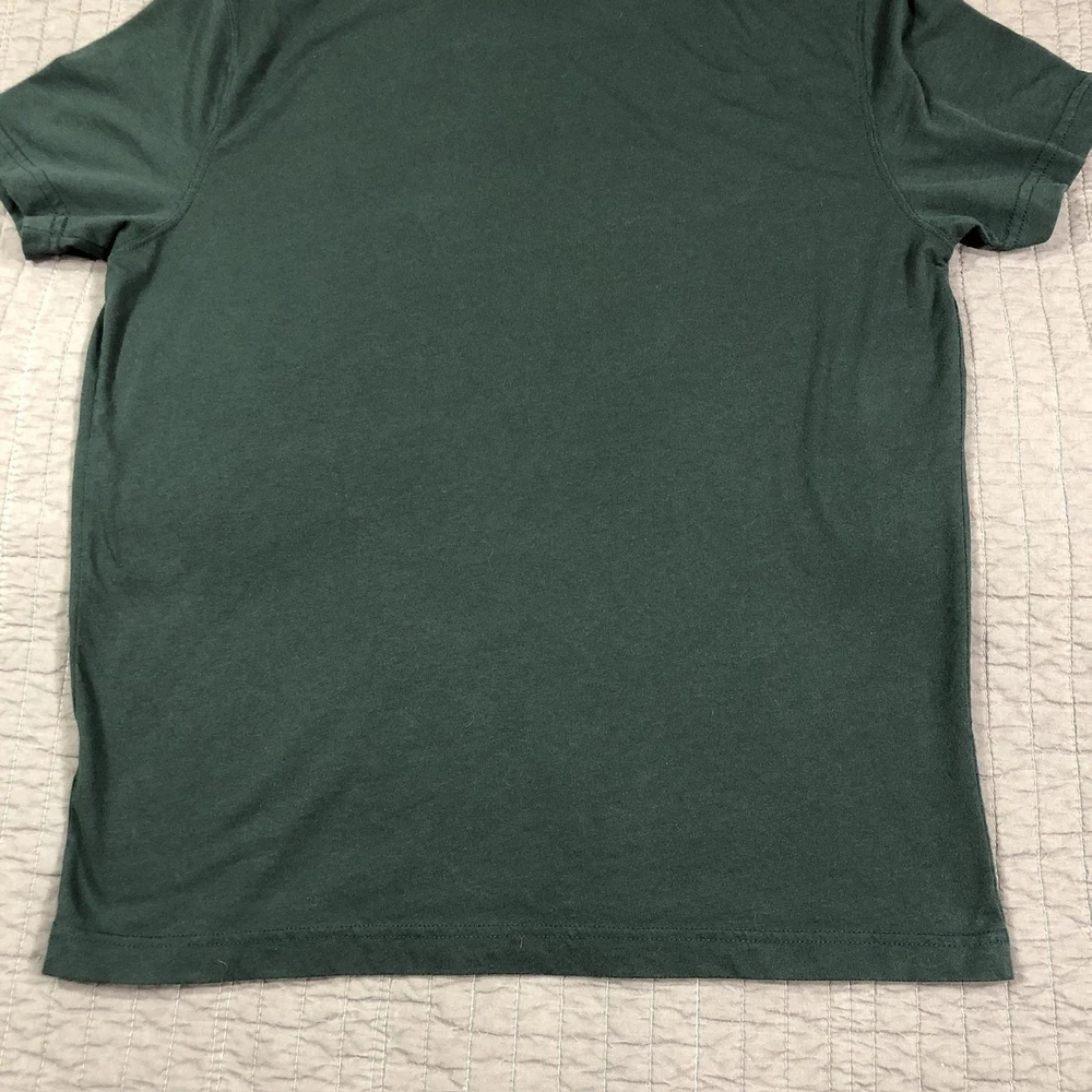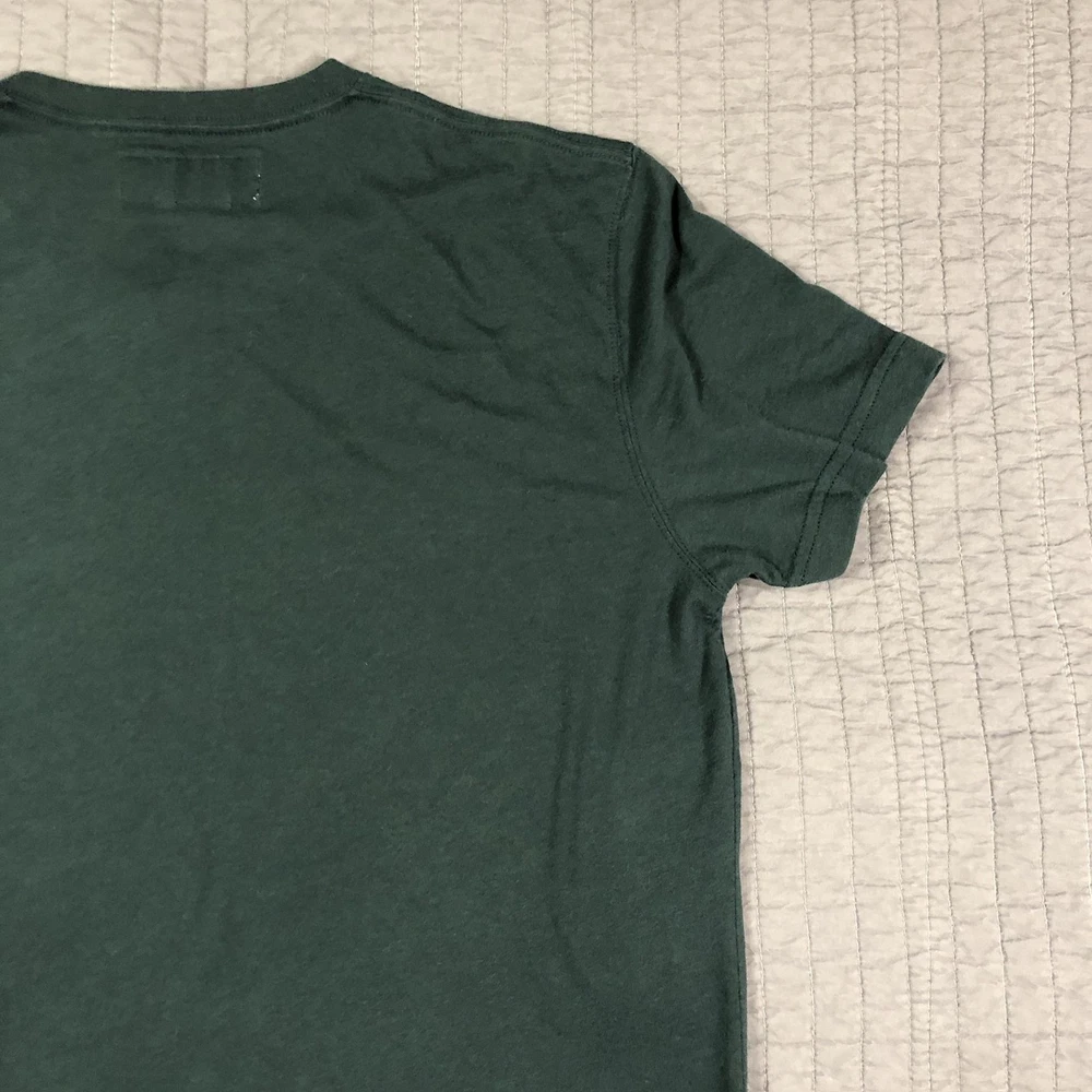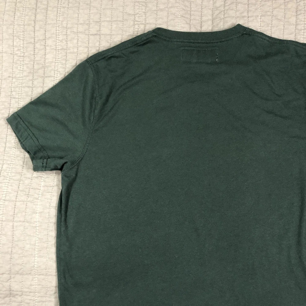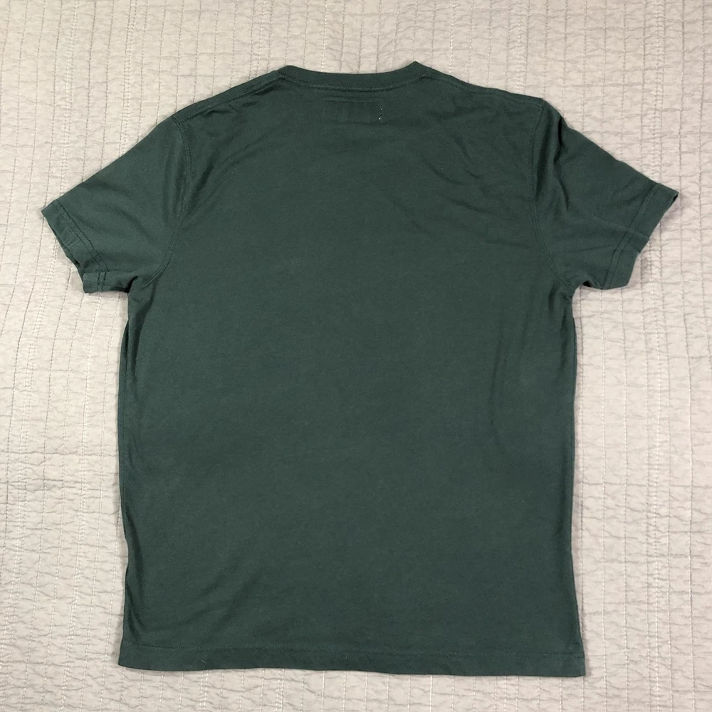 Brand: Abercrombie & Fitch Style: Mens short sleeve V-neck solid knit t-shirt from the Soft A&F Tee line. Color: Dark forest green with contrasting brown and yellow embroidered moose logo at the left chest. Size: Mens Large (L) per woven neck label; regular fit. Material: Soft lightweight knit; specific fiber content not visible in photos. Country of origin: Made in Vietnam. Style / model details: Classic Abercrombie & Fitch basics tee with minimal branding and small moose chest embroidery. Features: V-neckline, short sleeves, solid dark green body, small embroidered moose logo at left chest, straight hem, soft casual knit suitable for everyday wear or layering. Actual Measurements: Chest: 20.5 in, Length: 27 in, Waist: 19.5 in. Condition: Softly worn dark green Abercrombie & Fitch V-neck tee with light wash wear and fabric softening from normal use. Fabric is clean and intact with no holes, tears, or stains; seams, hems, and neckline remain secure. Embroidered moose chest logo is crisp with no fraying; interior size label present, no original retail tags or packaging. Please review all photos for close-up views of the color, fabric texture, measurements, and overall condition. Be sure to compare the measurements with your own. Check out my other items Most of my items now offer combined shipping of just $1.00 more per item! Be sure to follow my store for updates on new listings! Store: Daisy Mae Dixie I ship same or next day with the exception of weekends and postal holidays.