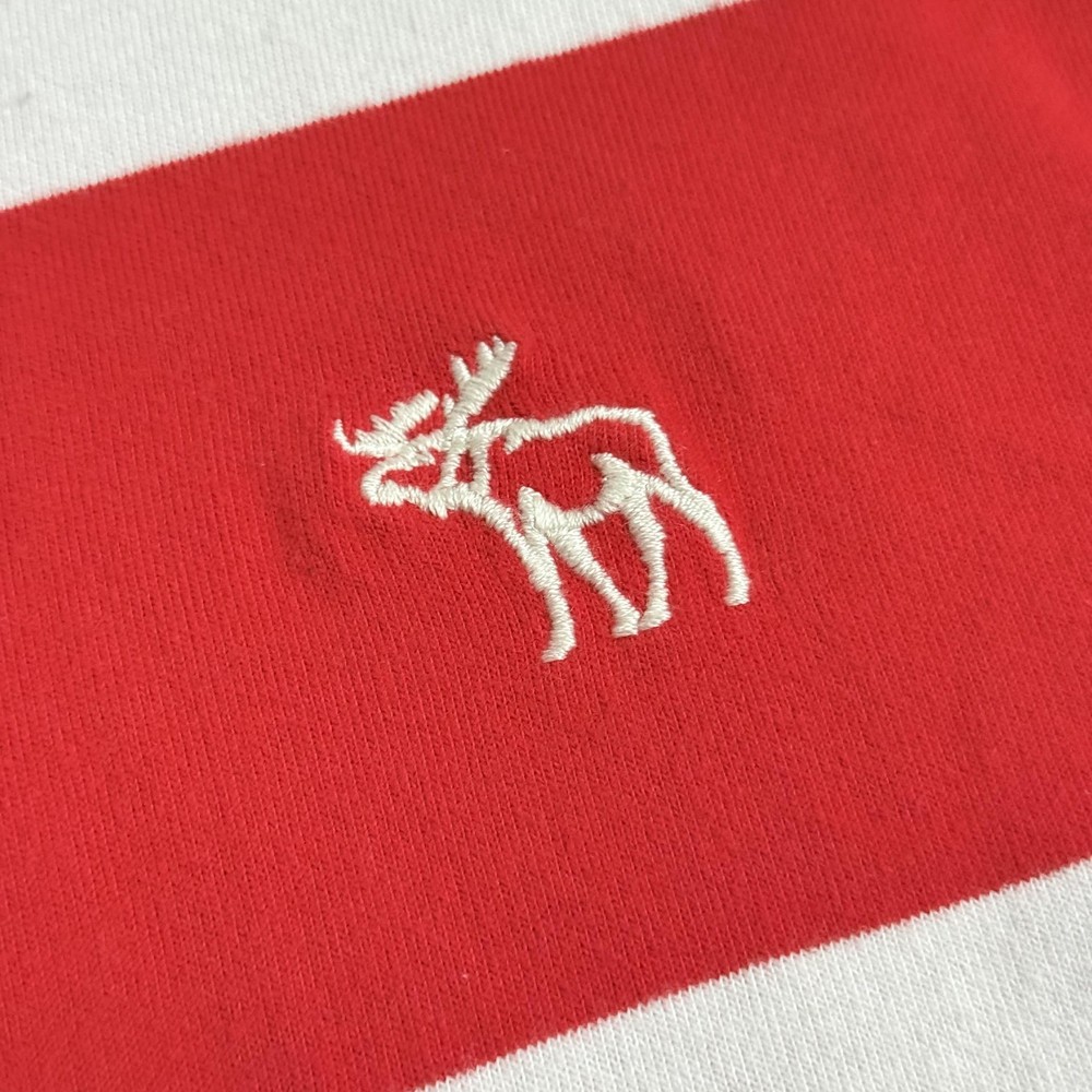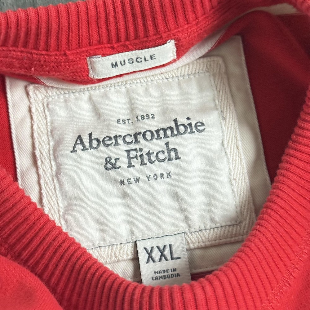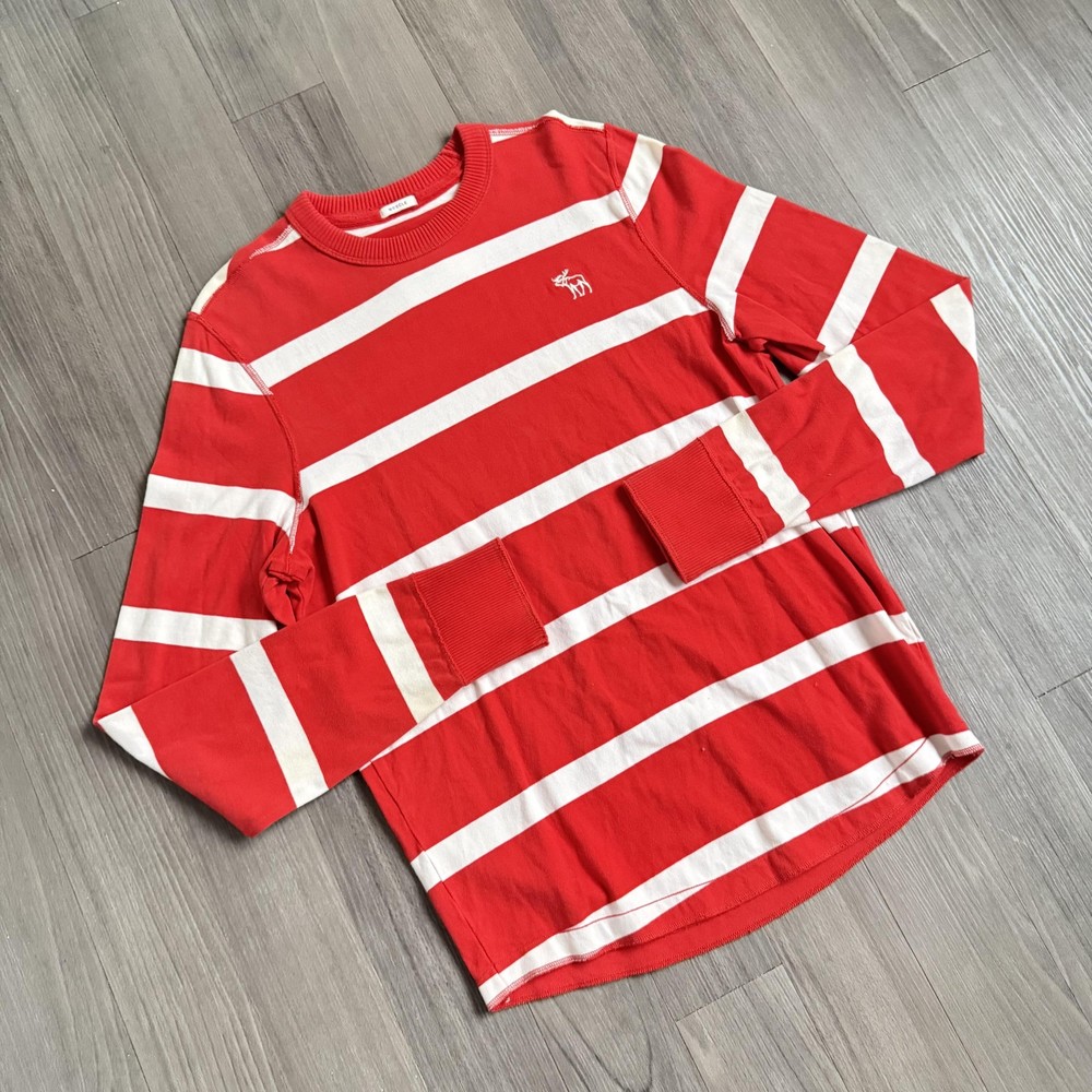 Abercrombie & Fitch Shirt Mens 2XL Red Striped Long Sleeve Moose Logo Muscle Pre-owned long sleeve shirt with soft fabric and light overall wash wear. Small faint mark near the chest moose logo as shown in photos. Fabric, seams, and cuffs are intact with no holes; interior tags present, no retail tags included. Brand: Abercrombie & Fitch Style: Mens long sleeve crew neck graphic shirt with horizontal stripes and chest logo. Color: Red with white horizontal stripe pattern. Size on tag: XXL (Mens 2XL), labeled Muscle fit for a slimmer silhouette through chest and body. Material: Soft midweight knit fabric with ribbed crew neckline and wide ribbed sleeve cuffs. Country of origin: Made in Cambodia. Details: Classic Abercrombie & Fitch embroidered moose logo at left chest, straight hem with slight curve at back, all-season weight suitable for layering or standalone wear, casual preppy look ideal for everyday outfits. 1622
