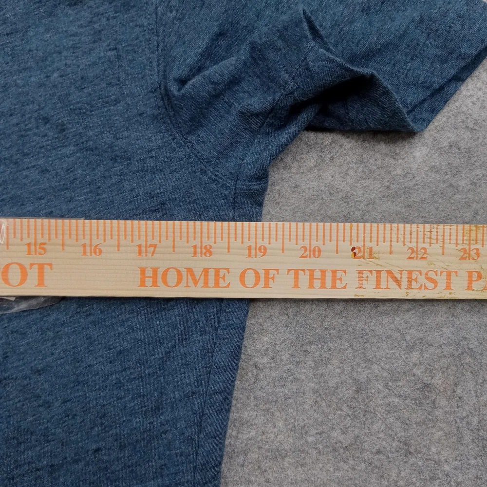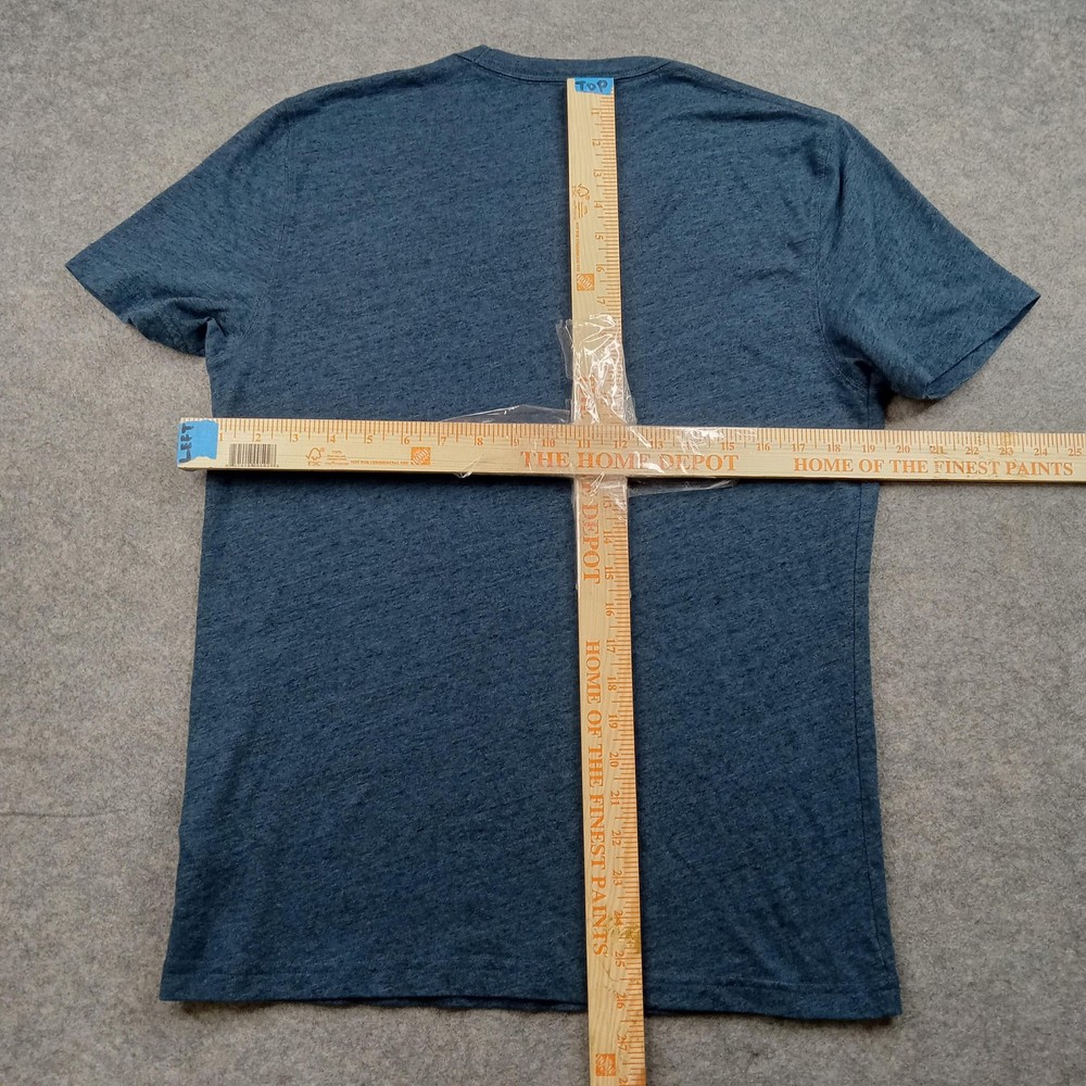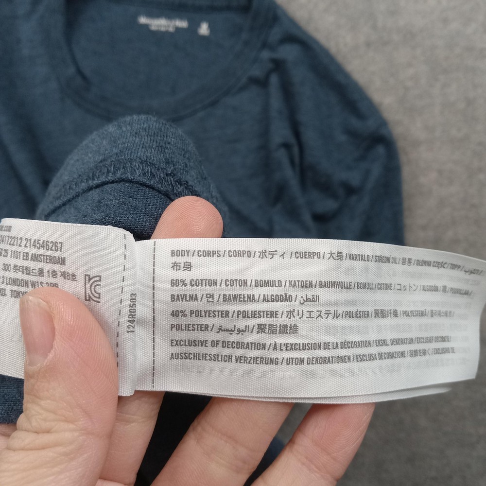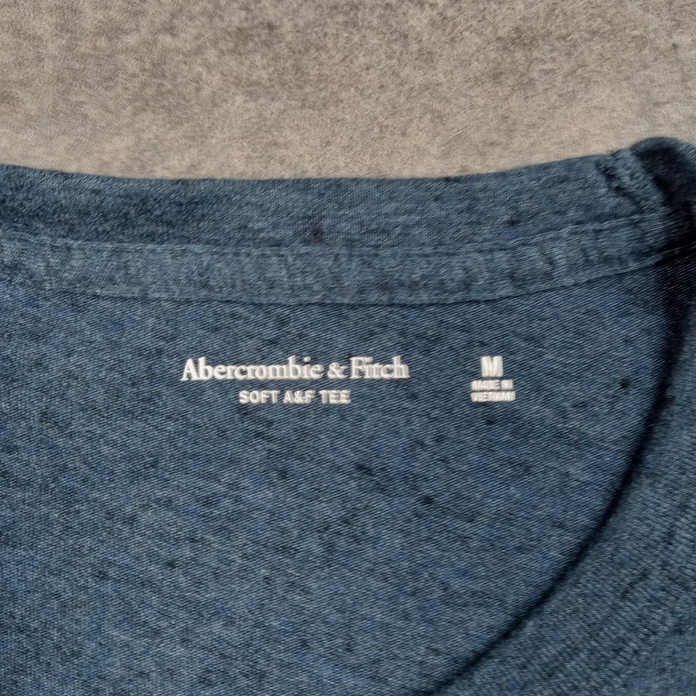 Brand: Abercrombie & Fitch. Style: Mens short sleeve crewneck Soft A&F Tee shirt. Color: Heathered blue solid body. Size: Mens Medium (tag size M). Material: 60% cotton and 40% polyester knit fabric. Country of origin: Made in Vietnam. Neck label details: Tagless printed Abercrombie & Fitch logo with Soft A&F Tee text, size M, and Made in Vietnam. Interior care tag details: Fiber content listed as 60% cotton and 40% polyester with multilingual care instructions. Design details: Classic crew neckline, short sleeves, straight hem, and small embroidered moose logo at the left chest. Features: Soft cotton-poly blend construction, tagless printed neck label for comfort, and versatile basic tee suitable for layering or standalone wear in multiple seasons. Special notes: Abercrombie & Fitch mens tee shirt; see condition description and all photos for close-up views of fabric, logo, and tags.