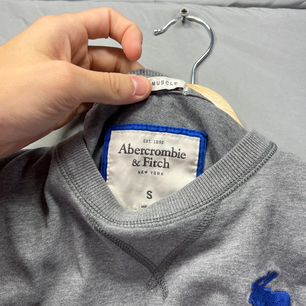 This Abercrombie & Fitch men's small gray long sleeve shirt is a classic and preppy addition to any wardrobe. Made of cotton knit fabric, this crew neck shirt features a solid gray color with a logo accent. The muscle fit design is perfect for a casual yet stylish look, suitable for all seasons. With its vintage-inspired design from the 2000s, this shirt is a versatile and timeless piece for any man's closet.