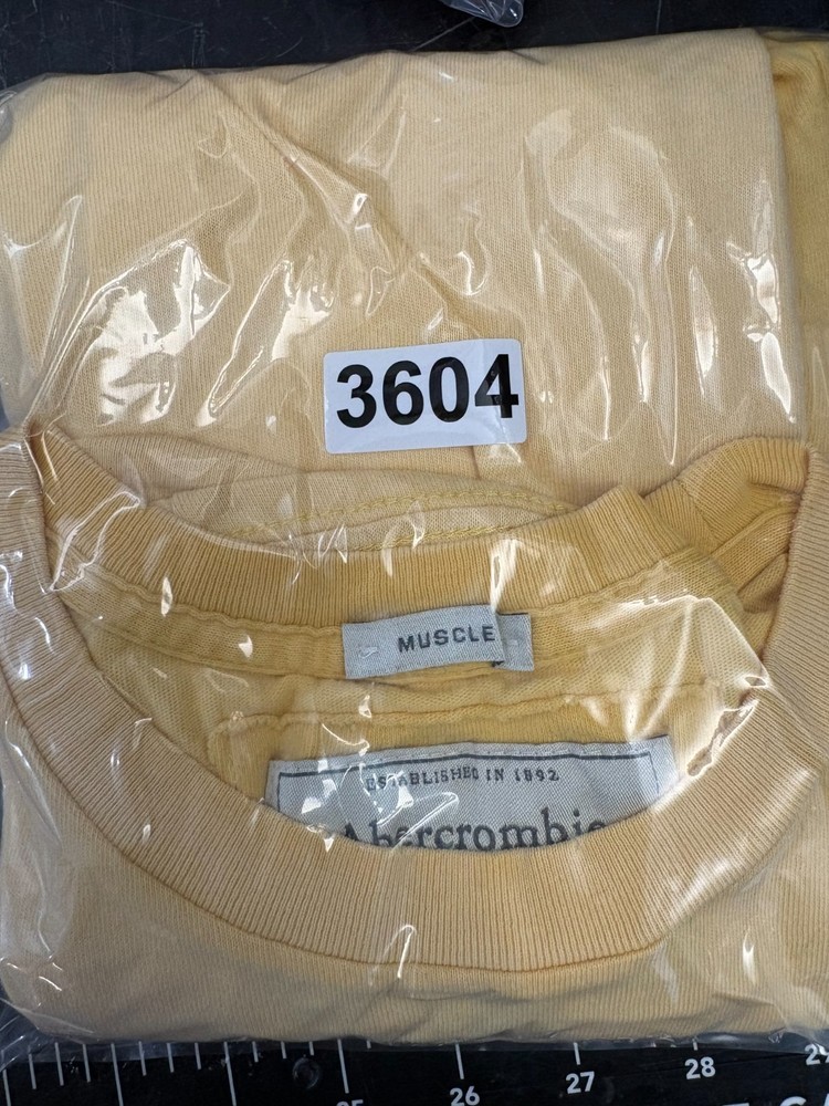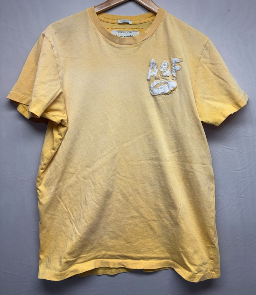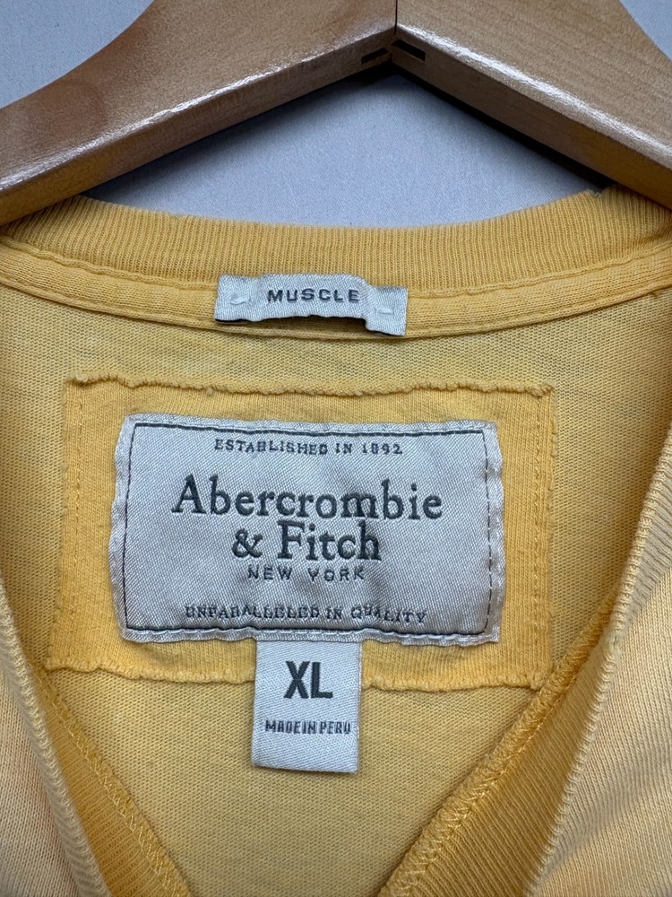 The Abercrombie & Fitch T-Shirt in size XL is a classic men's wardrobe staple, featuring a solid yellow color with the brand's logo accent. This short sleeve crew neck shirt is made for a regular fit, perfect for a preppy and stylish look. Easy to care for and breathable, this shirt is ideal for wearing in the warmer seasons of summer, fall, and spring. Made in Peru, this T-shirt is a versatile and comfortable option for everyday wear. Thanks for choosing my store. Rest assured that your purchase comes from a smoke-free environment. Please let me know if you have any other questions or concerns.