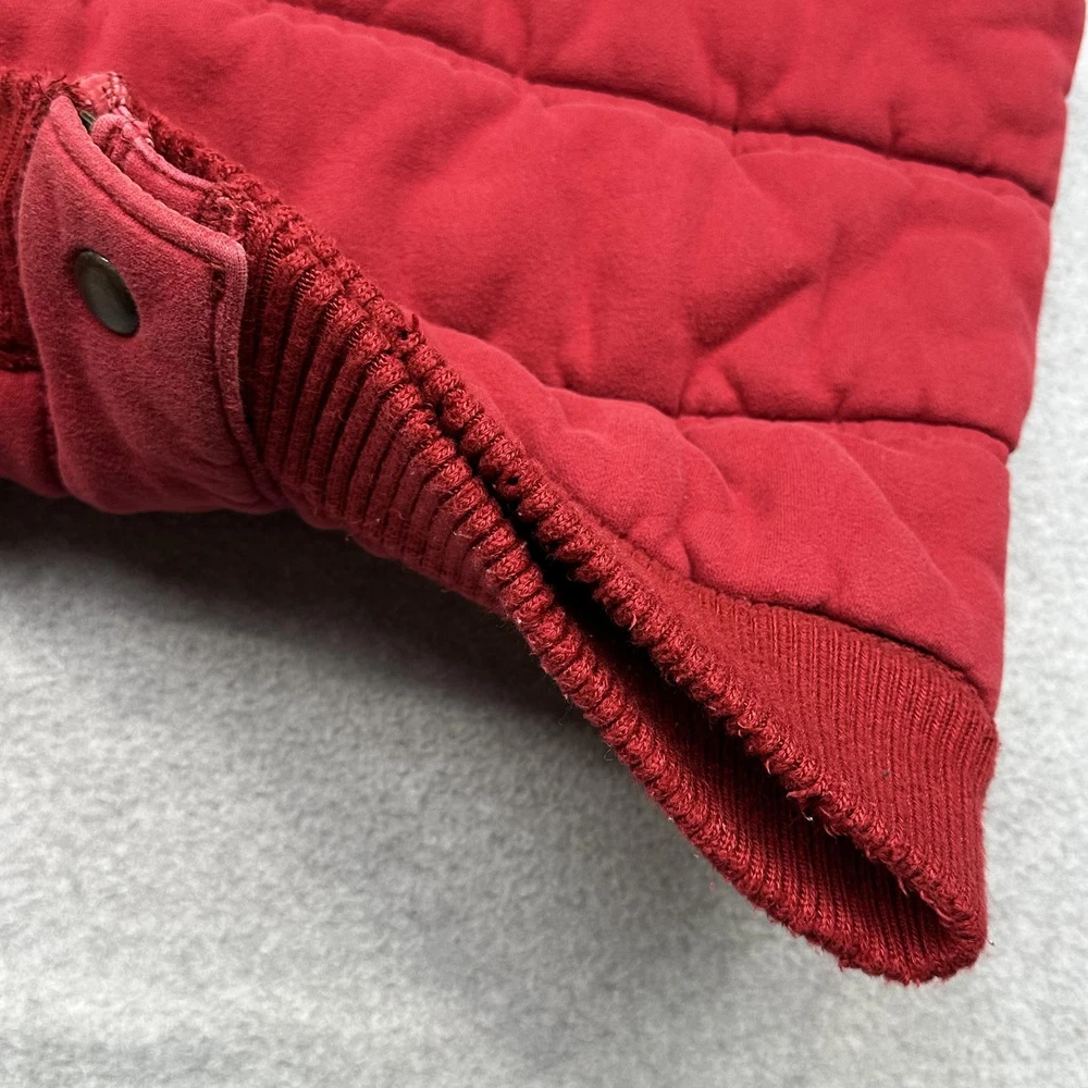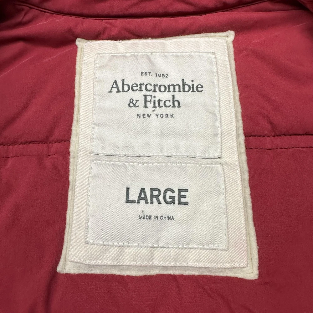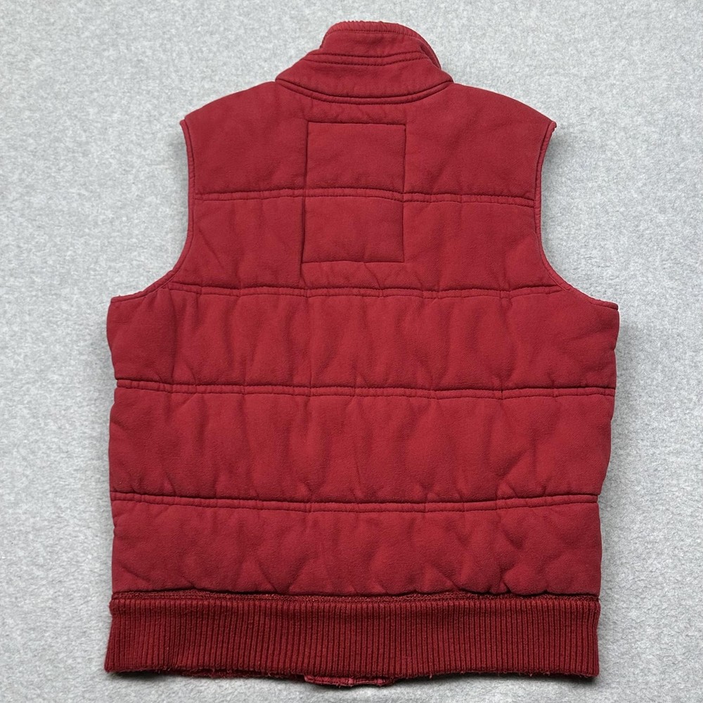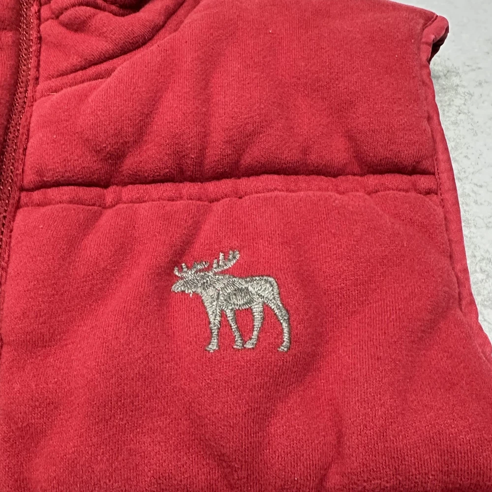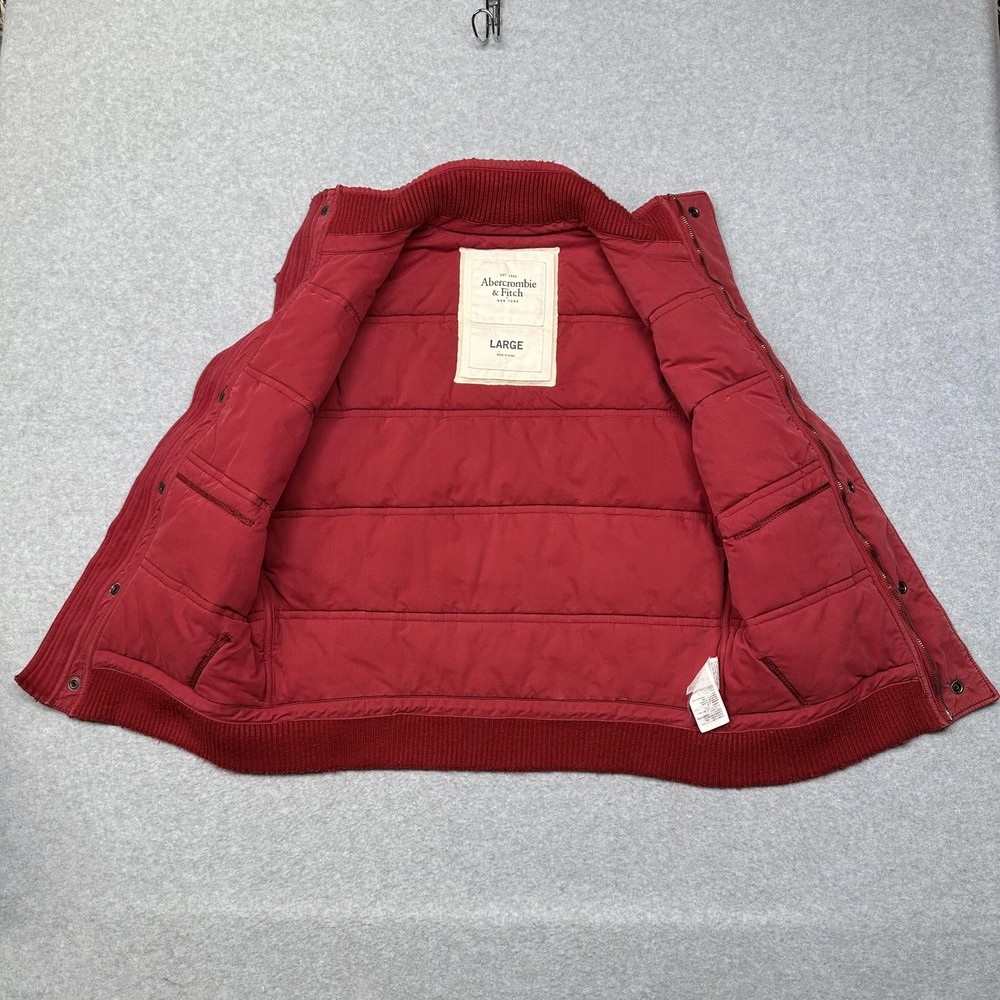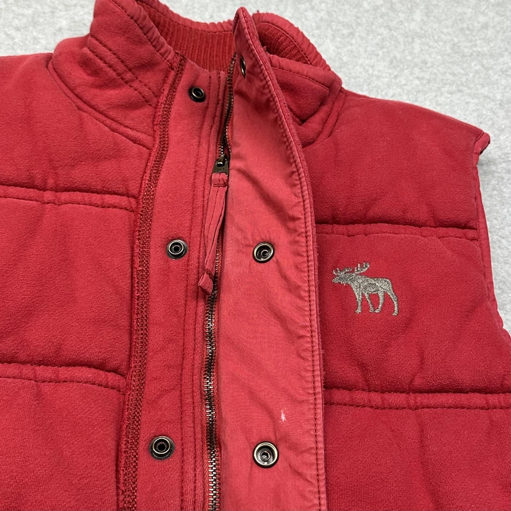 Brand: Abercrombie & Fitch (Est. 1892 label; New York) Item: Quilted puffer vest Condition: Clean and ready to wear. Light wear with minor signs of use. Tiny white spots noted on the front near the snaps and near the pocket (both shown in photos). Ribbed hem shows light pilling and edge wear. Fabric shows mild wash fade consistent with normal use. Snaps and zipper function properly; lining is clean with no holes or tears observed. Gender/Size: Mens Large (tag) Approx. flat measurements: Pit to Pit 21.5", Bottom hem (unstretched) 18.5", Length 25" Color: Red (burgundy tone) Materials (from care tag): Shell 75% cotton, 25% polyester; Lining 100% cotton; Fill 100% polyester; Rib 100% cotton Features: Stand collar; snap-front placket over full zipper; ribbed hem; two front hand pockets Logo: Embroidered moose at left chest Care: Machine wash cold with like colors; non-chlorine bleach only; tumble dry low; low iron if needed Origin: Made in China Codes on inner tag: 1B2532; 72227100 Notes: See photos for details and scale. Measurements shown with a ruler in photos for reference. ** SMOKE-FREE HOME **
