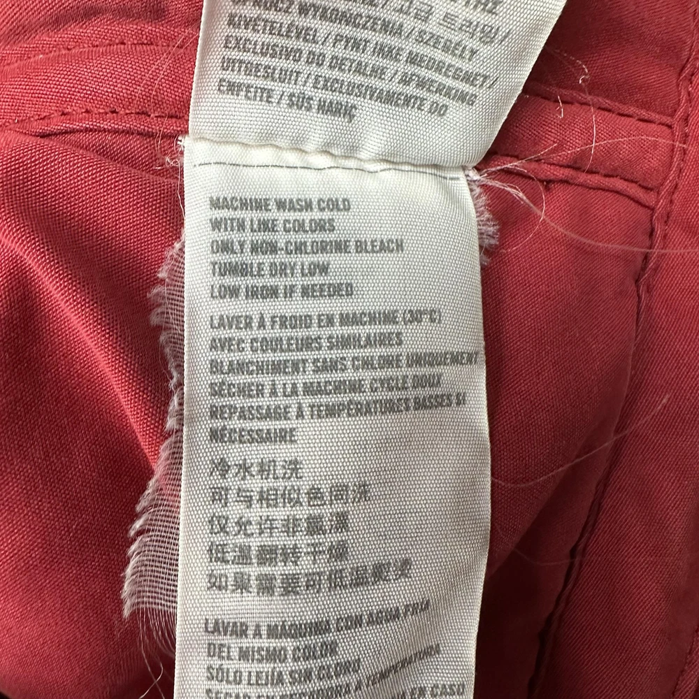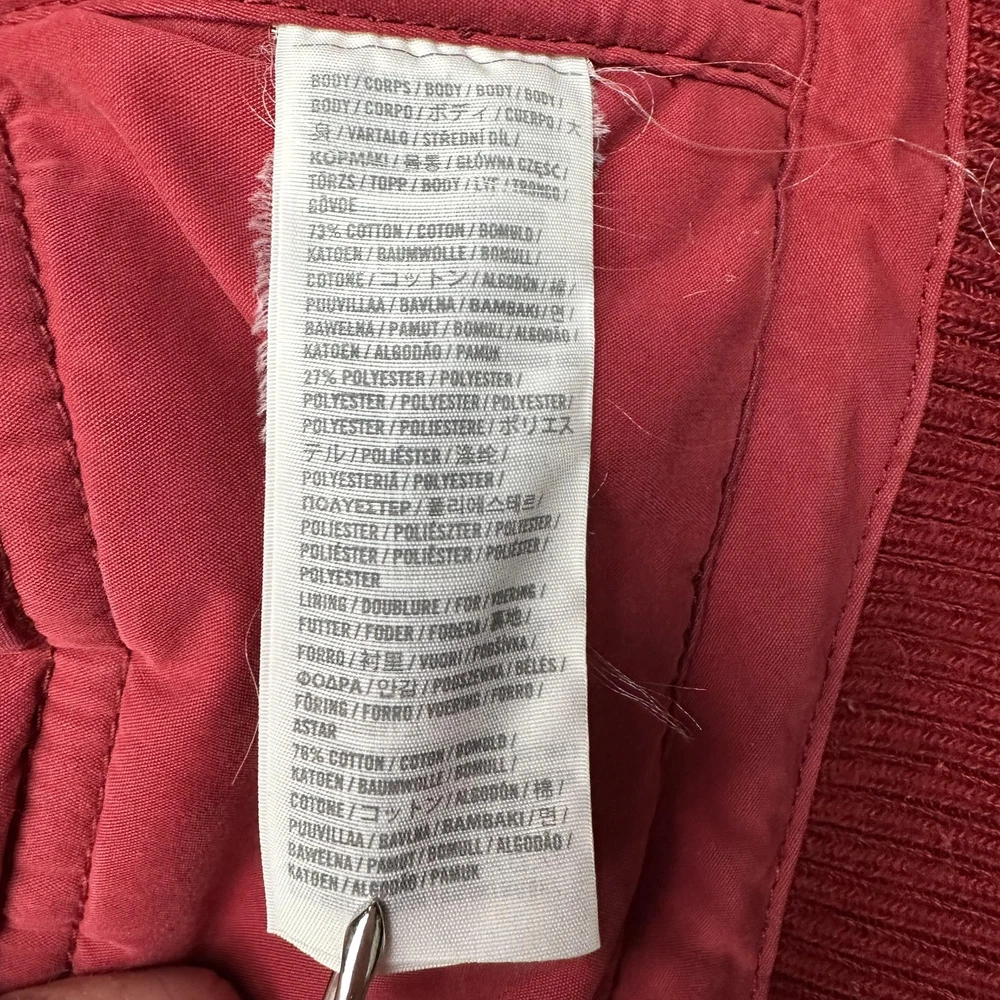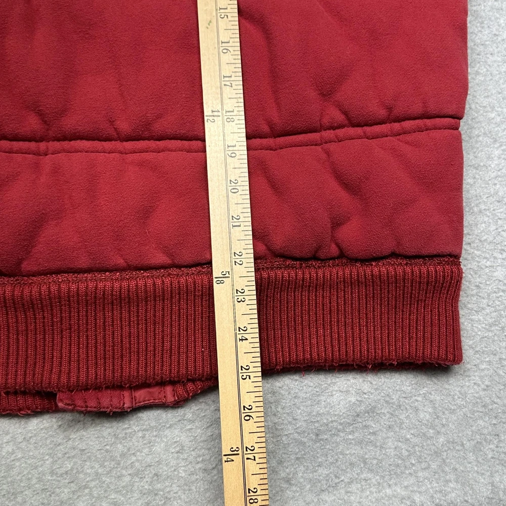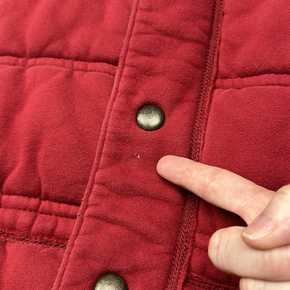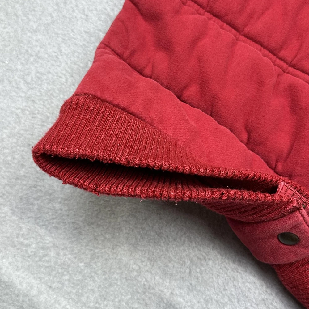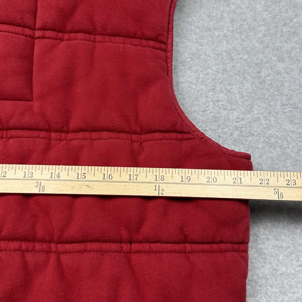 Brand: Abercrombie & Fitch (Est. 1892 label; New York) Item: Quilted puffer vest Condition: Clean and ready to wear. Light wear with minor signs of use. Tiny white spots noted on the front near the snaps and near the pocket (both shown in photos). Ribbed hem shows light pilling and edge wear. Fabric shows mild wash fade consistent with normal use. Snaps and zipper function properly; lining is clean with no holes or tears observed. Gender/Size: Mens Large (tag) Approx. flat measurements: Pit to Pit 21.5", Bottom hem (unstretched) 18.5", Length 25" Color: Red (burgundy tone) Materials (from care tag): Shell 75% cotton, 25% polyester; Lining 100% cotton; Fill 100% polyester; Rib 100% cotton Features: Stand collar; snap-front placket over full zipper; ribbed hem; two front hand pockets Logo: Embroidered moose at left chest Care: Machine wash cold with like colors; non-chlorine bleach only; tumble dry low; low iron if needed Origin: Made in China Codes on inner tag: 1B2532; 72227100 Notes: See photos for details and scale. Measurements shown with a ruler in photos for reference. ** SMOKE-FREE HOME **