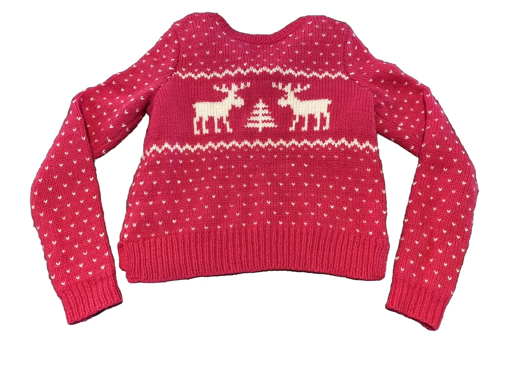 This Abercrombie & Fitch Women's Vintage Pink Moose Reindeer Cropped Sweater is the perfect addition to your winter wardrobe. The cable-knit sweater features a crew neckline, long sleeves, and a classic sleeve type. The sweater is made from a soft and warm blend of nylon, alpaca, wool, and acrylic materials, making it perfect for the chilly winter season. The sweater also features cute accents of bells and bows around neckline. It's perfect for any occasion, whether you're traveling, attending an “ugly” sweater party, or just having a casual day out. This sweater is a must-have for any fashion-forward woman who wants to stay cozy and stylish this winter. Pictures are part of description. Ask questions prior to purchase. Payment is appreciated within 72 hours.
