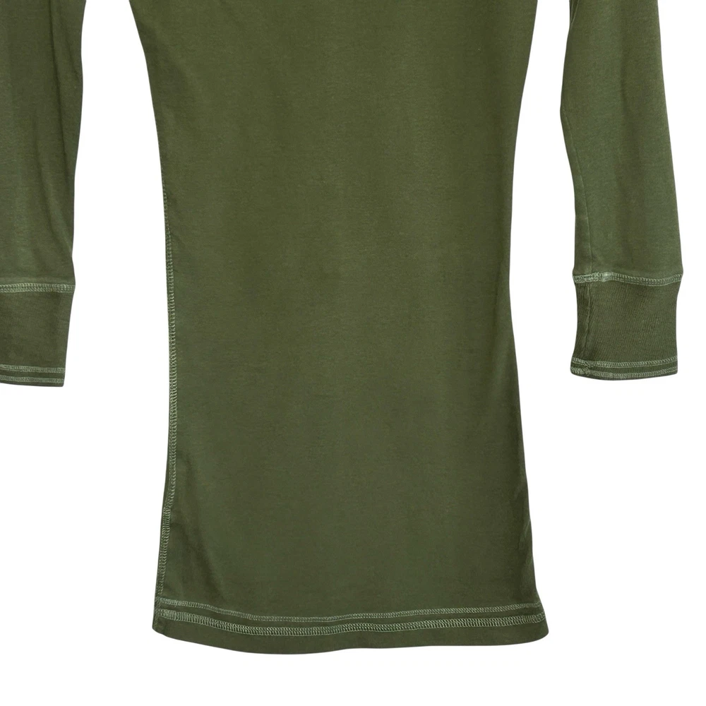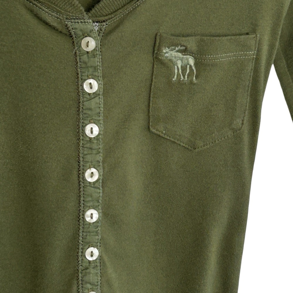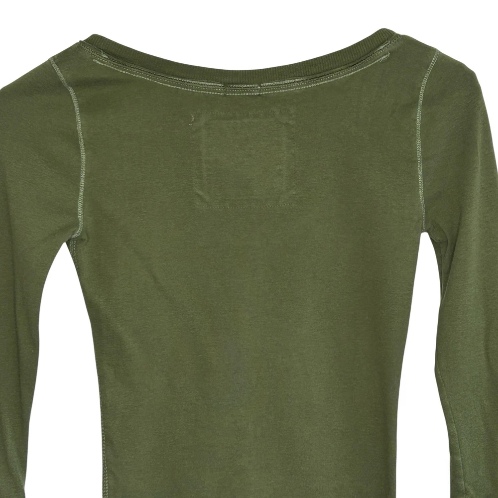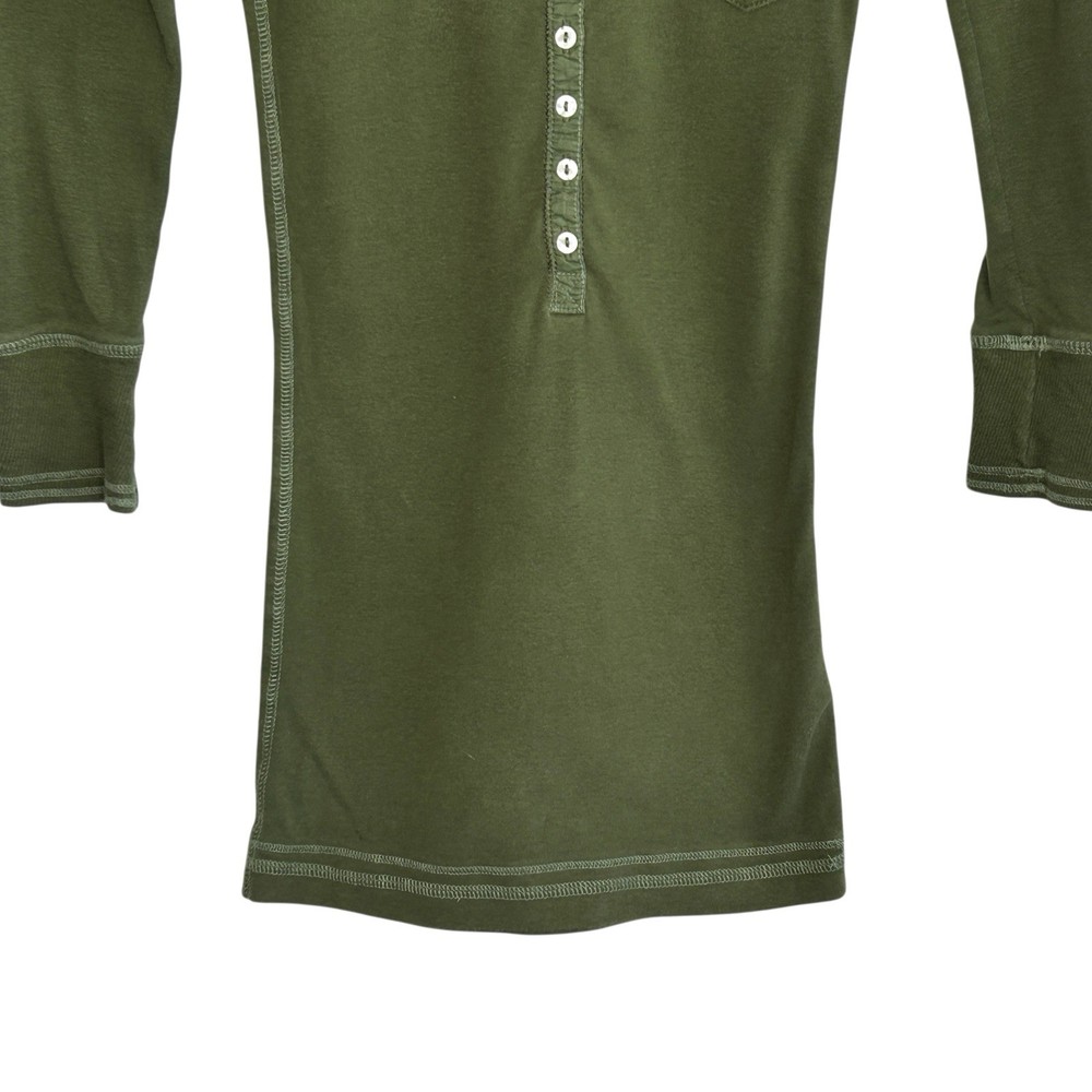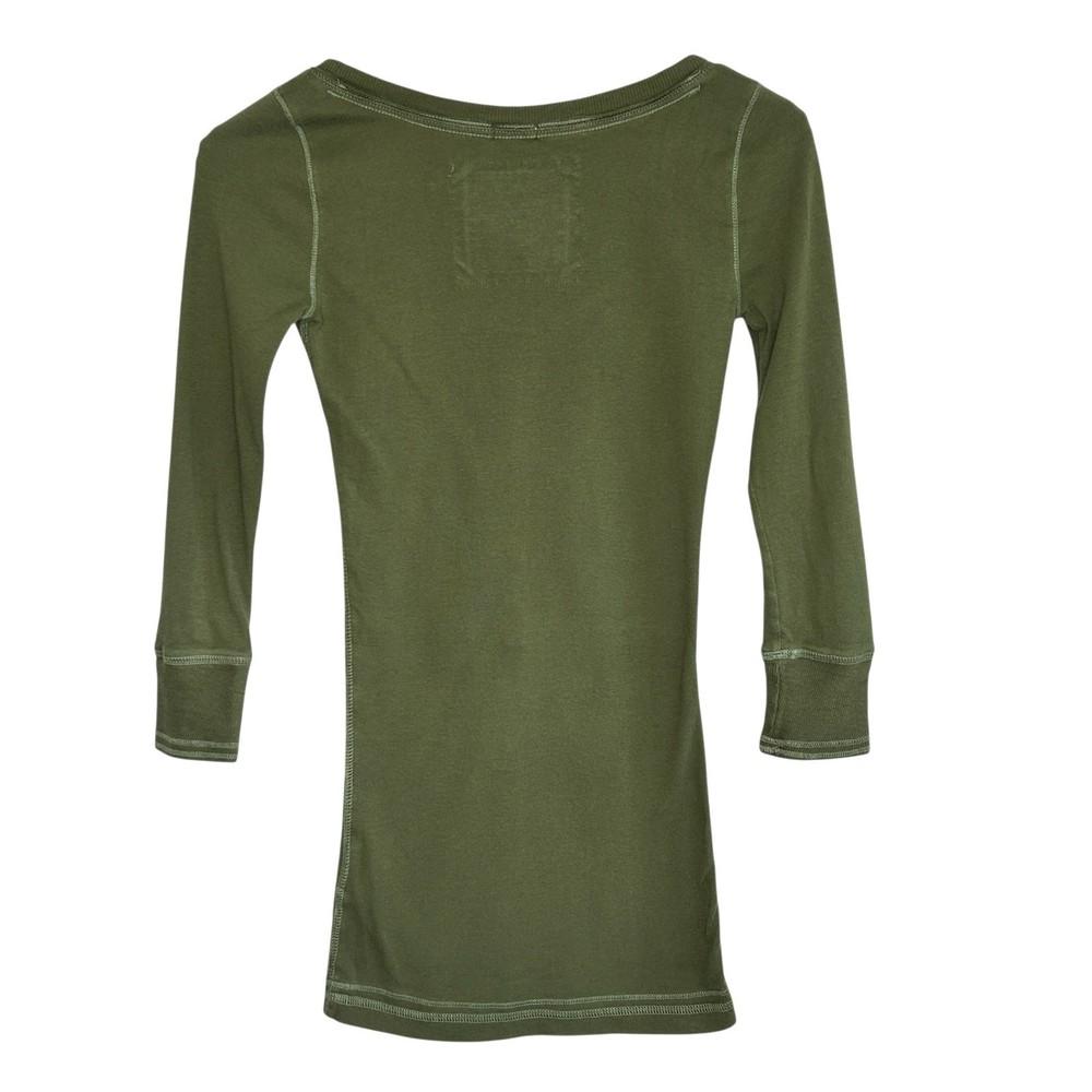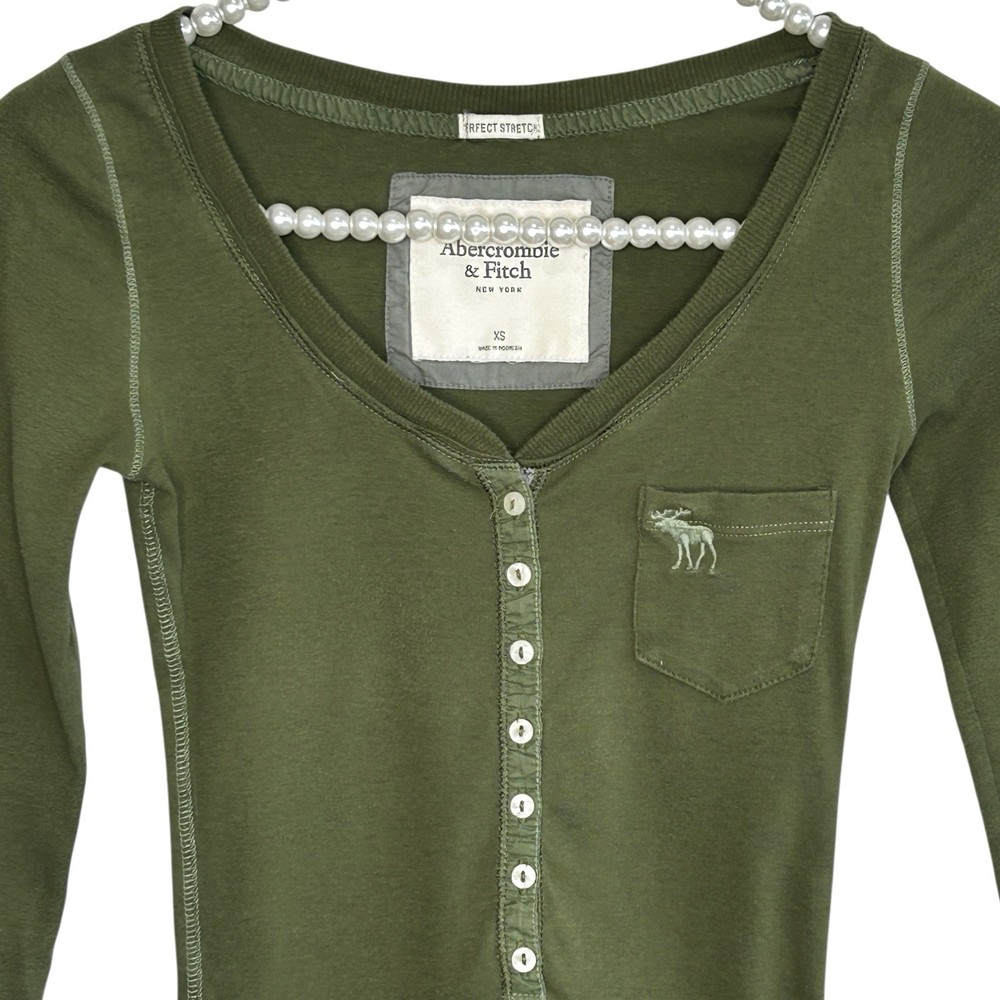 Abercrombie & Fitch Y2k Perfect Stretch Henley Top XS Army green Scoop neck Button closure Embroidered Moose logo Chest pocket 3/4 sleeve Fitted long length silhouette Lightweight breathable Stretchy 96% cotton 4% spandex Machine wash Made in Indonesia Very good preowned condition. NOTE light wash wear. See photos as part of the description. Measurements laid flat approx: 13" pit to pit 10" across waist 12" across bottom hem 26" length shoulder to bottom hem 18" sleeve length casual outdoors rare Bella Swan Elena Gilbert 90s 2000s retro preppy Old School coastal hamptons skater grunge Streetwear