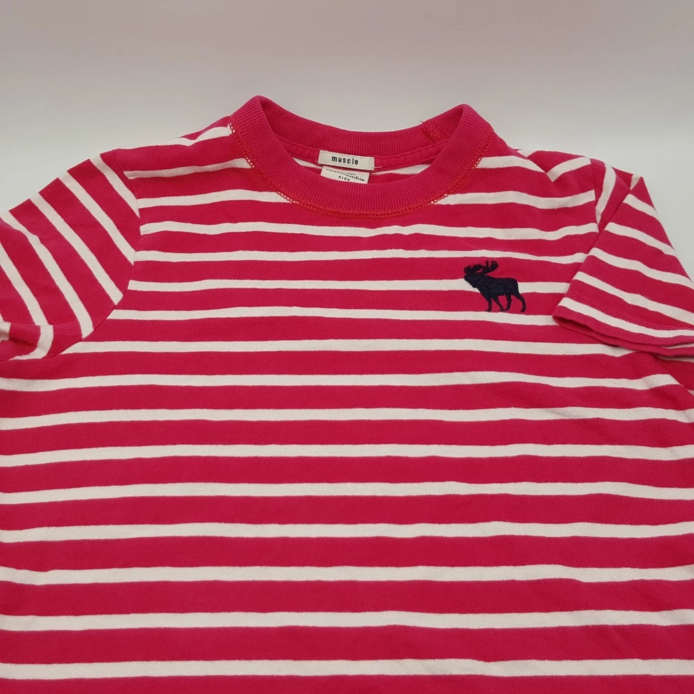 Abercrombie Kids Boys Muscle fit Tshirt Pink with white stripes Navy Blue Moose embroidered Size Large 21" down back Has scent of laundry detergent