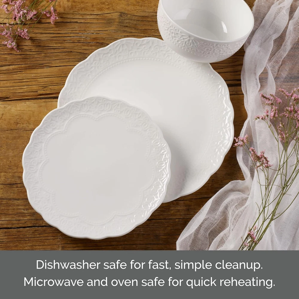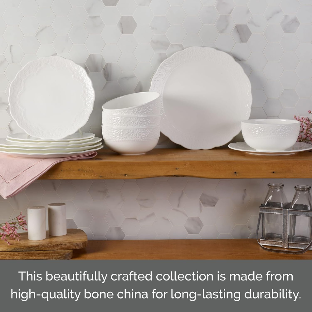 Store New Arrivals Add to Favorite View Feedback Contact Abigail Bone China Lightweight Chip Resistant 12 Piece Dinnerware Set, Service for 4, White Description Item model number 5293928 Global Trade Identification Number 00885991253310 Material Bone China Occasion Everyday Color White Pattern Solid Is Microwaveable Yes Item Weight 14.27 pounds Shape Round Is Dishwasher Safe Yes Collection Name All Finish Type Glossy Product Dimensions 12.5 x 11 x 12.5 inches Product Care Instructions Dishwasher Safe Number of Pieces 12 SIMPLE ELEGANCE: each individual piece in this stylish collection features a distinctly different embossed pattern around the rim STRONG & DURABLE FOR EVERYDAY USE: Chip Resistant and lightweight to use everyday. STUNNINGLY CRAFTED: made of high-quality bone china for crisp white color and long-lasting durability SERVICE FOR 4: 12 piece Set includes 4 each of 10.5-inch dinner plate, 8-inch salad plate, and a 6-inch all purpose bowl with a capacity of 27 ounces EASY CLEANING AND REHEATING: Dishwasher safe for fast, simple cleanup, oven safe and microwave safe for quick reheating Bring a touch of sophistication to your tabletop with the simple elegance of this Abigail 12-Piece Dinnerware Set by Mikasa. Beautifully crafted of chip-resistant, high-quality bone china, this stylish set features a distinctly different embossed pattern around the rim of each piece, bringing an eye-catching surprise to your place settings. The basic white bodies are perfect for casual or formal dining and complement any flatware or stemware. 12-piece set, service for 4, includes 4 each of 10-1/2 inch dinner plate, 8-inch salad plate, and a 6-inch all-purpose bowl with a 27-fluid ounce capacity. Microwave and dishwasher safe. ABOUT US We offer the best prices around on high quality products. Our E-store includes media such as books, movies, music and games while offering electronics, toys, sporting apparel, clothing, tools, general home, garden items and more. SHIPPING We are always working hard to ensure your package arrives as soon as possible. Please understand that some factors like weather, high postal traffic, and the performance of shipping companies are outside of our control. We offer free shipping to the lower 48 states and ship within 2 business days of payment, usually sooner. We do not accept P.O. Boxes. Please provide a physical address. For shipping outside of the continental USA, we only use eBay's Global Shipping Program.The item is shipped to KY and then sent to the rest of the world. International customers are responsible for all duties and taxes. Continue to check out in order to calculate costs for shipping the item to your country. Messages regarding eBay's Global Shipping Program MUST be directed at eBay EXCLUSIVELY. RETURNS We offer a 30-Day Return Policy on items which you are not completely satisfied with. You have the option for a full-refund or an exchange of the item. No returns are available on items shipped outside of the USA. PAYMENT We accept PayPal. CONTACT US This page content is yet to come Please ad us to your favorite seller and visit again later Thank You CUSTOMER SATISFACTION We try our very best to make sure every customer is completely satisfied. If there's a problem, message us! We're happy to help. WE ACCEPT Copyright © 2021 AutoDS. | All Rights Reserved