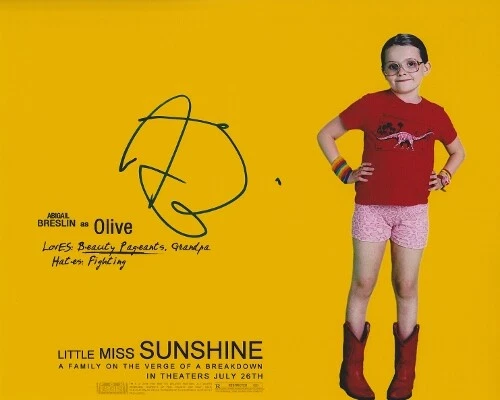 Abigail Breslin has personally hand signed this original 8x10 Photo with a sharpie pen. This item comes with The Real Deal Memorabilia authenticity sticker on the signed item and a Real Deal Memorabilia Certificate of Authenticity (COA), so get The REAL DEAL!
