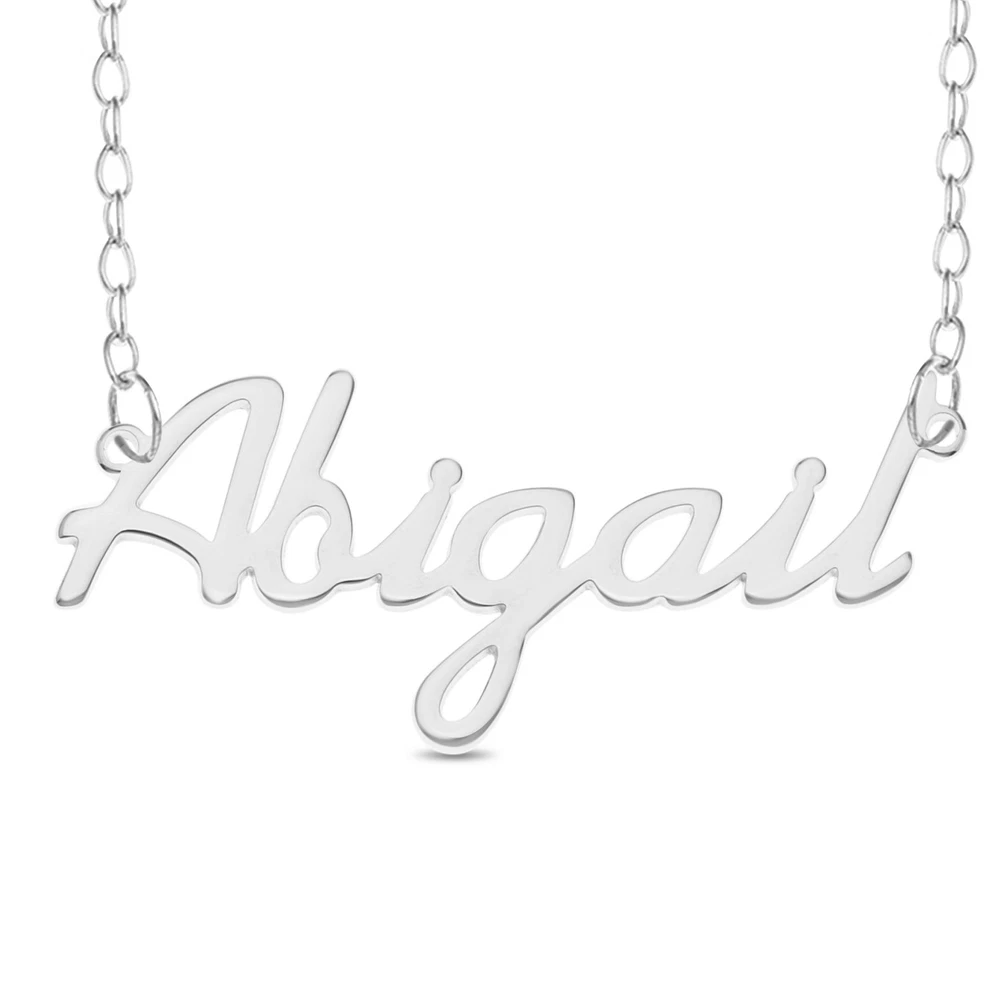 "Amanda" Laser Cut 925 Sterling Silver Name Rolo Necklace - Personalized Custom "Abigail" Laser Cut 925 Sterling Silver Name Rolo Necklace - Personalized Custom " Abigail " Laser Cut 925 Sterling Silver Name Rolo Necklace - Personalized Custom Sterling Silver Personalized Name Necklace on a beautiful Rolo/Trace Chain. Personalized in Alako Font style with Name - Abigail - Comes complete with superior mirror polish. Name Necklace details: - Sterling Silver 925 - Personalized Name Necklace with Name: Abigail - Thickness: 1mm of solid Sterling Silver - Chain style: Rolo/Trace Chain in solid Sterling Silver - Length: 16 inches BRAND NEW and custom laser cut. This is USA's most popular script font Necklace and the perfect gift for any occasion. Hand made and polished in the UK out of solid 1 mm thick silver sheet. This listing is for name: "Abigail" Please don't hesitate to contact me if you have any questions regarding this item. Click to edit text Listing and template services provided by inkFrog