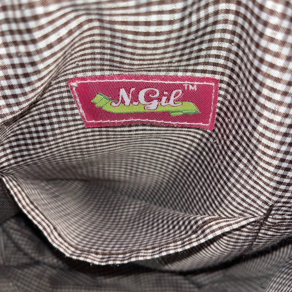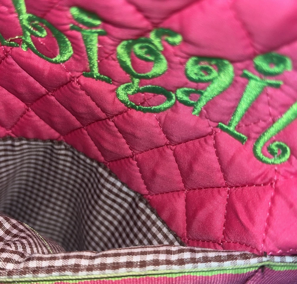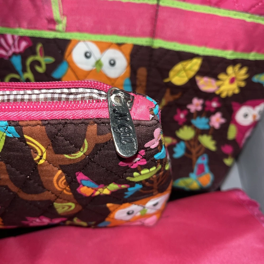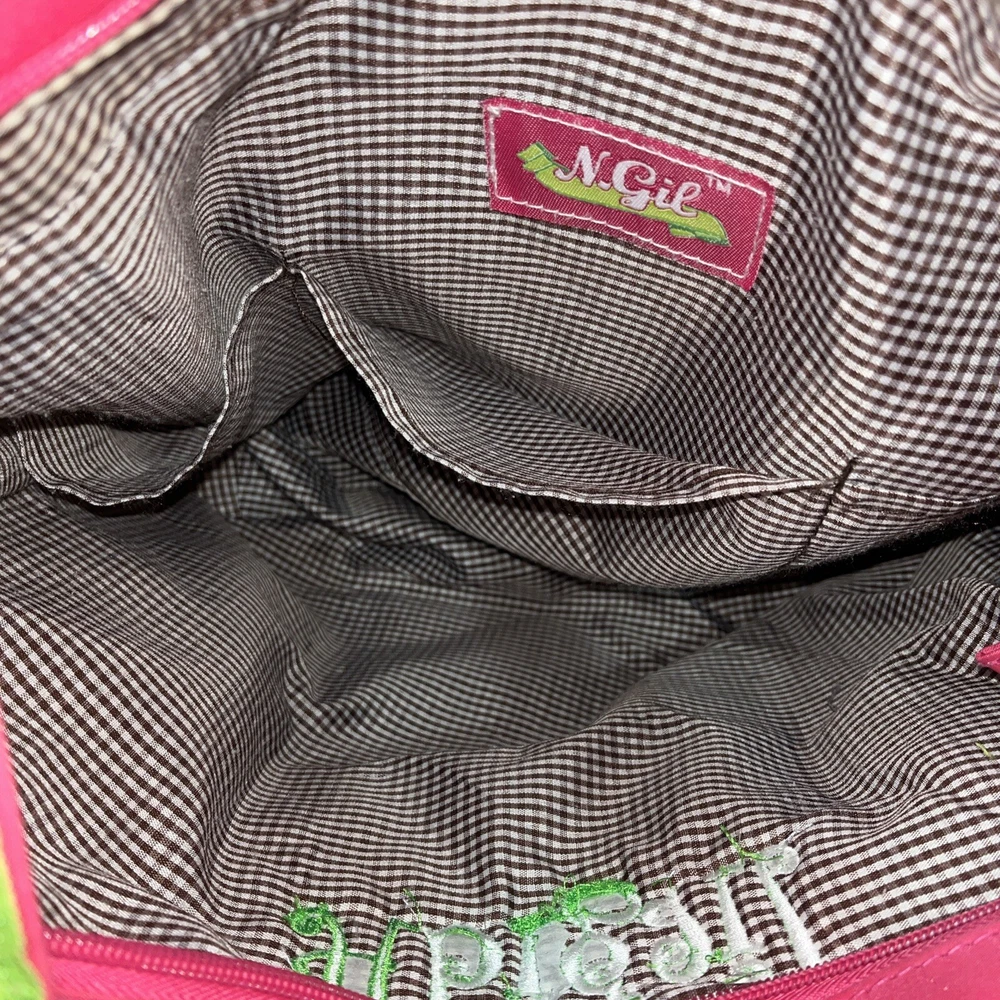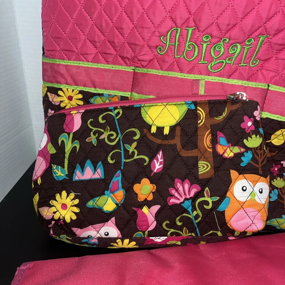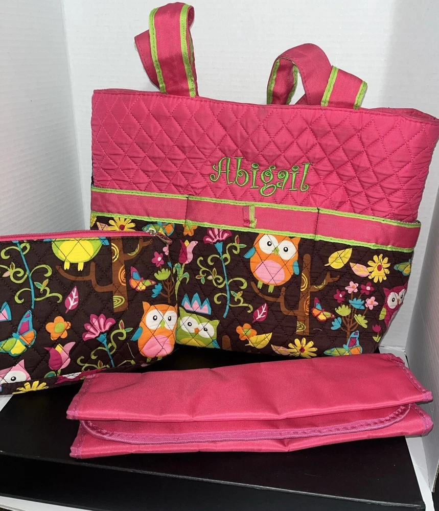 Condition issue: The straps had some seams coming loose and some trim frayed. I reinforced the seams on the parts that were coming loose and repaired it. See pictures of straps. Comes with a pouch and changing pad. This adorable N Gil diaper bag set features a charming floral pattern with pink owls and a personalized Abigail on the front. The bag is made of lightweight cotton material and includes inner and outer pockets, a changing pad, and a zipper for easy closure. It's perfect for girls and comes in a large size, making it ideal for carrying all your baby's essentials. The bag is not only stylish but also practical, with its many features making it easy to use and transport. It's a great choice for parents who want a fashionable yet functional accessory for their baby. Get your hands on this lovely N Gil diaper bag set today!