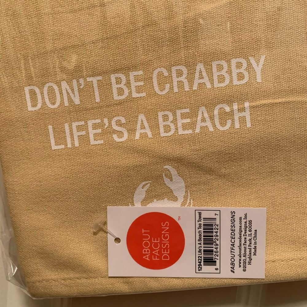 About face designs-kitchen/tea towel. A taupe /tan color with the words " Don't be crabby-life's a beach" with a picture of a crab on the bottom. Decorative towel. New in package. About 14 inches long My items are primarily Thrifted and I do my very best to note any imperfections/callouts. My items are stored, in a pet/smoke free home Thanks for stopping in and looking! Lisa