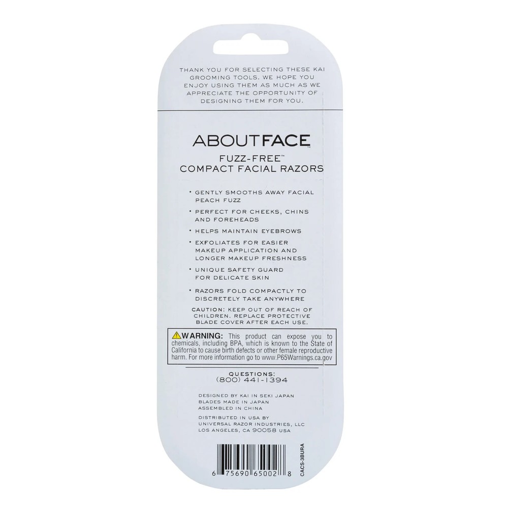 About Face Fuzz-Free Folding Facial Razors, 3 Beauty Groomers GENTLE FOLDING FACIAL RAZORS: Gently remove facial hair for softer, smoother skin with About Face Fuzz-Free Folding Facial Razors. Designed for women, these beauty razors shave unwanted peach fuzz. DISPOSABLE DERMAPLANING TOOL: Experience smoother and brighter skin after dermaplaning with the Fuzz-Free Folding Razor. Our exfoliating tool gently and effectively scrapes off dead skin and fine facial hair for a fresh and glowing face. SALON QUALITY AT HOME: Skip a trip to the salon and experience quality results at home with About Face facial blades. Minimize uneven skin tone and ease dry patches for a premium skincare routine without the premium price. PERFECT FOR ON THE GO: Slim, compact face shaver folds down and stores easily in your purse, makeup bag, briefcase or carry-on for portable convenience. Remove unwanted hair anytime, anywhere with our travel razor. MADE IN JAPAN: Crafted from high-quality, Japanese steel, our facial razors for women can be used as eyebrow shavers, dermaplaning tools or gentle face razors. Included safety guards prevent cuts and irritation. PREP AND SMOOTH: Prepare your face for makeup and skincare application with our Fuzz-Free folding razors. Suitable for all skin types, these razors are ideal for fine or coarse hair. TRY OUR FULL LINE OF PRODUCTS: Explore our full catalog and find your favorite beauty companion. Try our About Face Sonic Beauty Wand, Pro-Premium Facial Razors and more. FOR MORE THAN 100 YEARS, Kai Group has been on mission to provide quality, high-performing products. Designed for beauty, function and ease of use, Kai products offer excellent value for every customer.