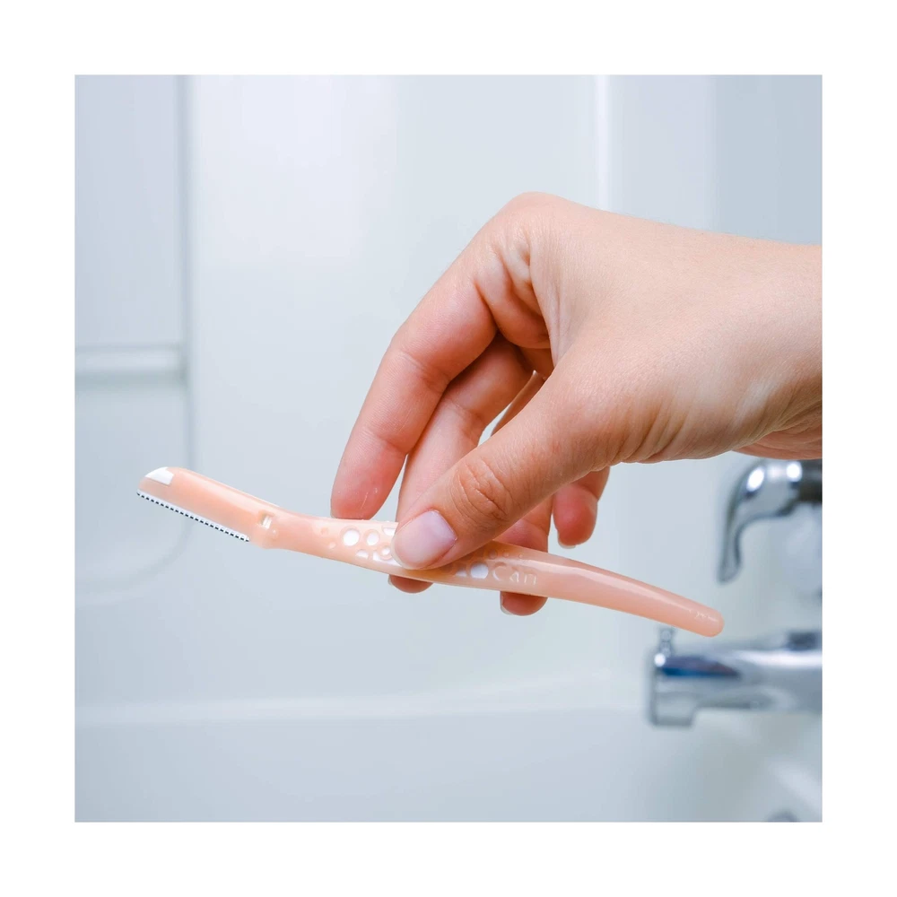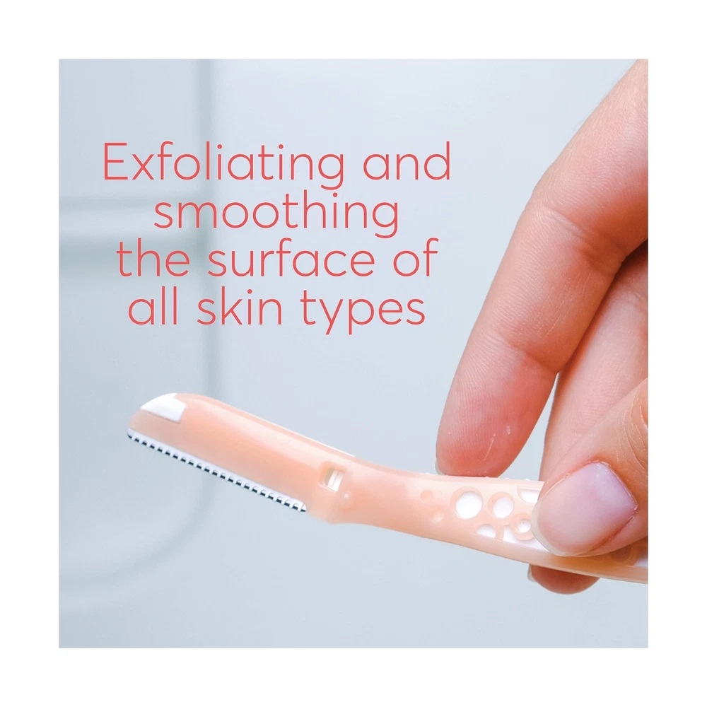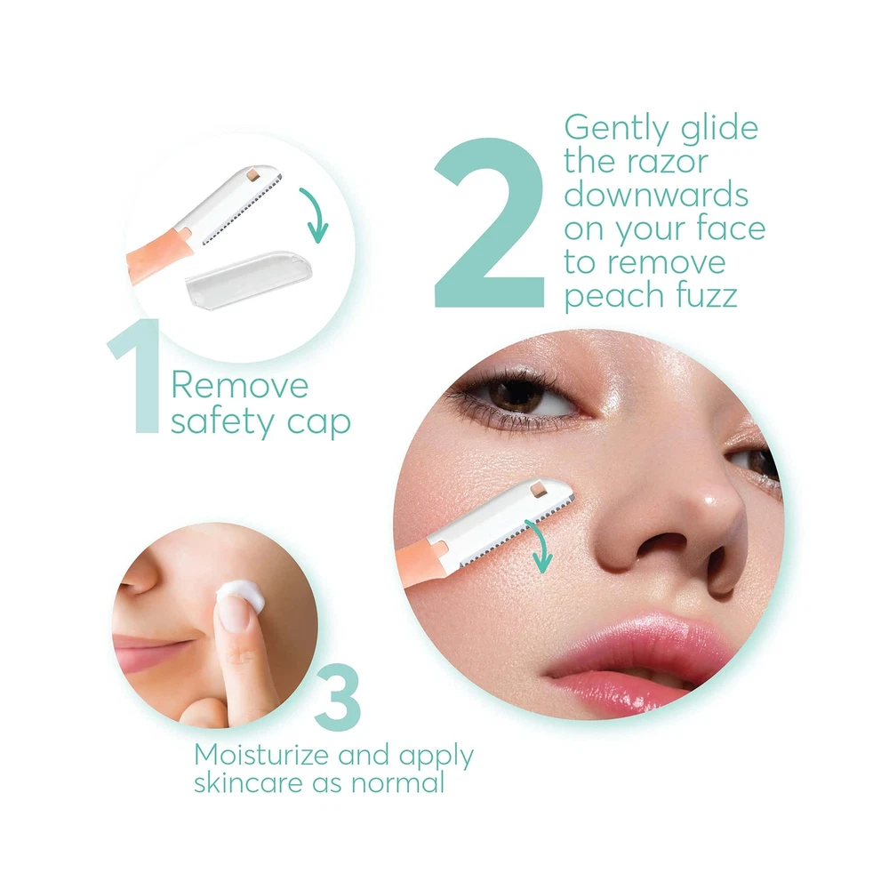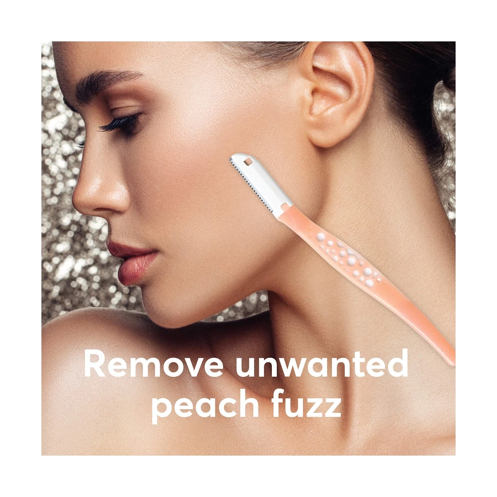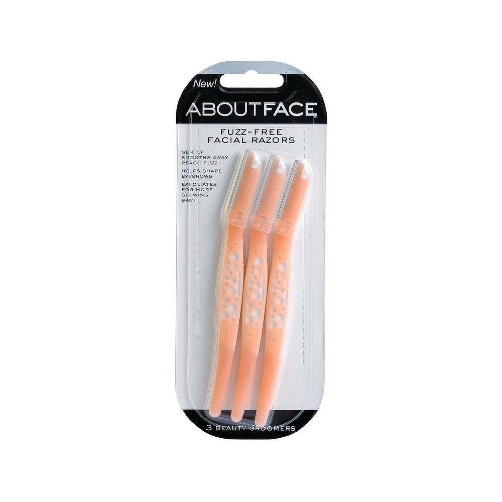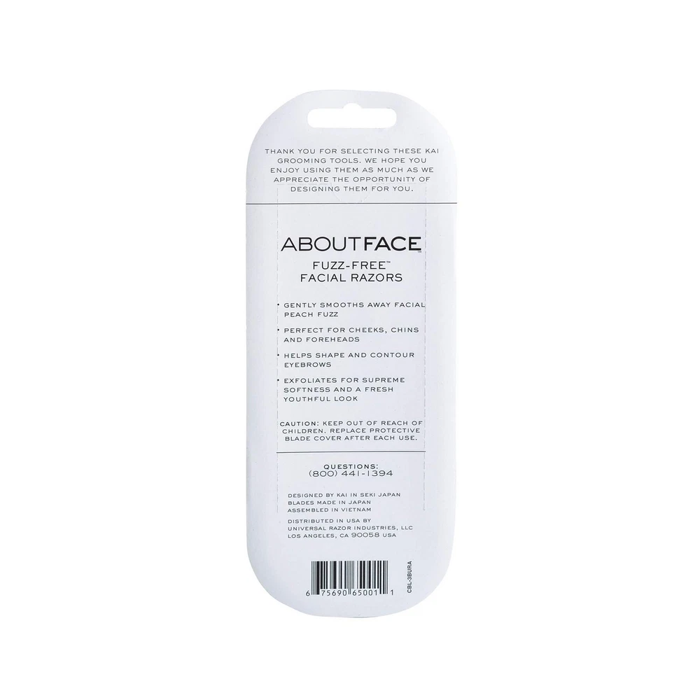 About Face Fuzz-Free Facial Razors for Shaving & Exfoliating - Includes 3 Beauty Groomers - For Face, Lips & Eyebrows Product Details Style Name: Fuzz Free Facial Razor Brand: About Face MPN: NC65039 UPC: 675690650011 EAN: 0675690650011 Product Dimensions : 0.25 x 3.13 x 7.88 inches; 1.13 Ounces Item model number : NC65039 UPC : Manufacturer : Universal Razor Industries Div of Kai-USA Country of Origin : Japan ABOUT FACE BEAUTY GROOMER gently removes hair and exfoliates for softer, smoother skin and a more youthful look. For use as female facial hair removal PREVENTS CUTS & IRRITATION: Finally, a facial razor for women that prevents skin irritation. Use on face and body for a flawless finish. Includes safety guard to prevent cuts and irritation. FUZZ FREE FACE: These face razors are ideal for hair-free cheeks, sideburns, chin and neck, as well as shaping, contouring, thinning and grooming unruly brows. GENTLE ON THE SKIN: Features a thin blade that helps minimize uneven skin tone, eases dry patches, and promotes a higher rate of skin cell turnover. Suitable for all skin types and both fine or course hair. AT HOME DERMAPLANING TOOL: Includes 3 facial razors. Properly dispose after a few uses. Elevate your skin care routine with the About Face Fuzz-Free Facial Razors for Shaving & Exfoliating. This gentle hair remover works to remove unwanted peach fuzz and dead skin cells from the face and body, leaving you with a fresh, dewy look. A safe substitute for at-home exfoliation, this face, brow and lip trimmer is a quick and simple exfoliating tool for women. Stash in your purse, makeup bag, or skincare drawer for regular use. Before exfoliating, cleanse your face and apply lotion moisturizer, face oil, or shave cream to reduce skin irritation. Remove hair by tilting the shaver blade at a low angle with the plastic portion almost touching your skin. Move the wand in the direction of any hair growth. For brows, gently move the wand in the direction of hair growth so blades lightly touch brow edges. Includes 3 face razors.
