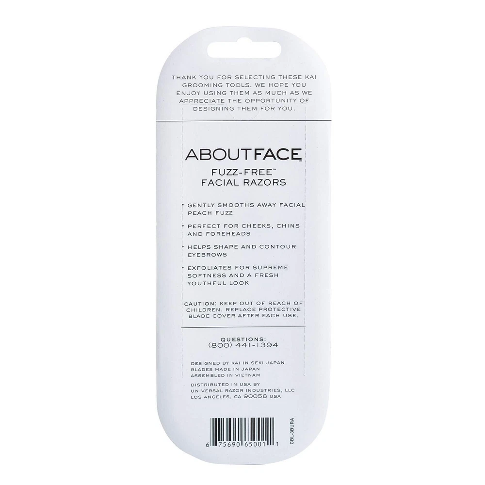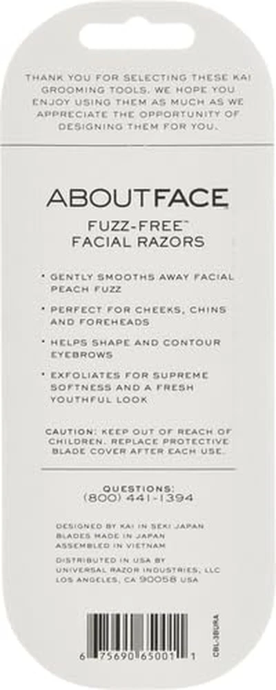 About Face Fuzz-Free Facial Razors for Shaving & Exfoliating - Includes 3 Beauty Groomers - For Face, Lips & Eyebrows Product Details Style: Fuzz-Free Facial Razors, Orange Brand: About Face MPN: NC65039 UPC: 675690650011 EAN: 0675690650011 Brand: About Face Number of Blades: 3 Unit Count: 3 Count Special Feature: Travel-Size Skin Type: All Product Dimensions : 0.25 x 3.13 x 7.88 inches; 1.13 ounces Item model number : NC65039 UPC : Manufacturer : Universal Razor Industries Div of Kai-USA Country of Origin : Japan GENTLE FACIAL RAZORS: Gently remove facial hair for softer, smoother skin with About Face Fuzz-Free Facial Razors. Designed for women, these beauty razors shave unwanted peach fuzz. DISPOSABLE DERMAPLANING TOOL: Experience smoother and brighter skin after dermaplaning with the Fuzz-Free Razor. Our exfoliating tool gently and effectively scrapes off dead skin and fine facial hair for a fresh and glowing face. SALON QUALITY AT HOME: Skip a trip to the salon and experience quality results at home with About Face facial blades. Minimize uneven skin tone and ease dry patches for a premium skincare routine without the premium price. PERFECT FOR ON THE GO: Slim, compact face shaver stores easily in your purse, makeup bag, briefcase or carry-on for portable convenience. Remove unwanted hair anytime, anywhere with our travel razor. MADE IN JAPAN: Crafted from high-quality, Japanese steel, our facial razors for women can be used as eyebrow shavers, dermaplaning tools or gentle face razors. Included safety guards prevent cuts and irritation. Exfoliate, shave and smooth your face at home with the About Face Fuzz-Free Facial Razors. Made from premium Japanese steel, these facial blades offer salon results without the premium price for an elevated skincare routine. Use to shave any unwanted facial hair or peach fuzz on your cheeks, sideburns, chin and neck, or use as an eyebrow shaper to groom unruly brows. Includes 3 face razors and a safety guard to prevent cuts and irritation, so you can experience glowing, fresh skin without nicks or bumps. Ease dry patches, minimize uneven skin tone and promote a higher rate of skin cell turnover with Fuzz-Free Facial Razors. Suitable for all skin types and both fine or coarse hair, these beauty groomers are ideal for shaping, grooming and exfoliating. At Kai USA, we're on a mission to provide our customers with the best experience, offering high-quality products, state-of-the-art technology and a dedication to innovation.
